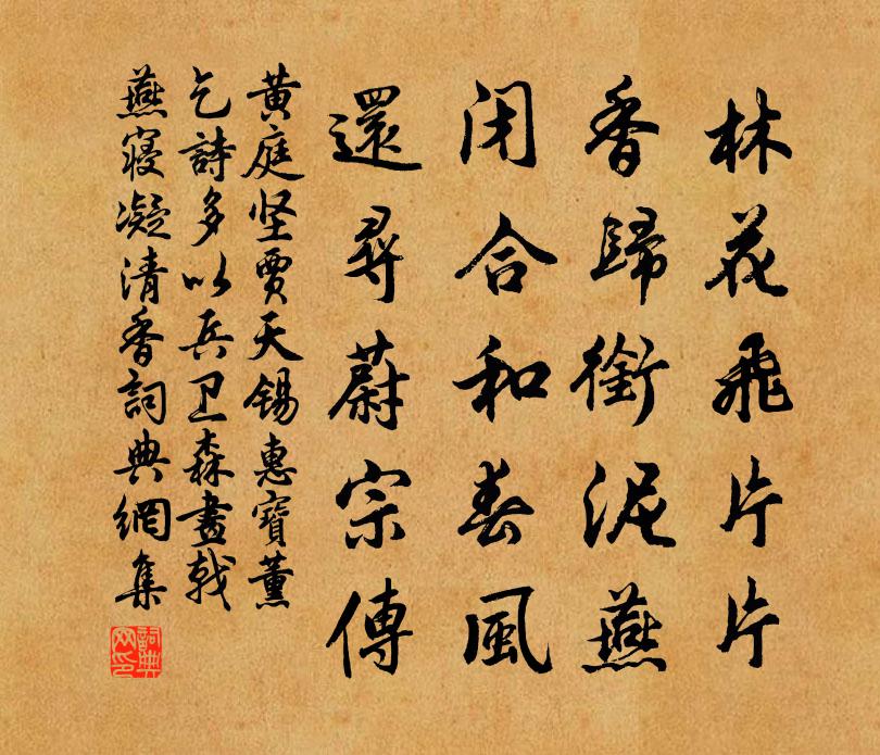 詩詞名句歷史字典書法欣賞書法字典國語詞典說文解字康熙字典古漢語字典標 題 作 者 詩 句 賈天錫惠寶薰乞詩多以兵衛森畫戟燕寢凝清香作者:黃庭堅 朝代:宋代原文林花飛片片,香歸銜泥燕。閉合和春風,還尋蔚宗傳。詩詞問答問:《賈天錫惠寶薰乞詩多以兵衛森畫戟燕寢凝清香》的作者是誰?答:黃庭堅問:該詩寫於哪個朝代?答:宋代問:黃庭堅的名句有哪些?答:黃庭堅名句大全書法欣賞賈天錫惠寶薰乞詩多以兵衛森畫戟燕寢凝清香書法作品詩文賞析原題:賈天錫惠寶薰乞詩多以兵衛森畫戟燕寢凝清香十字作詩報之詩詞推薦詠史上伏生陳普〔宋代〕文杏沙棠代代殃,露台不作作阿房。古來堯禹卑宮室,不為丹朱與太康。禪人並化主寫真求贊釋正覺〔宋代〕雪洗寒岩兮山林氣清,秋生煙水兮江湖色明。猶淨鏡兮對諸像,似空谷兮隨諸聲。遊戲因緣三昧用,自然轉處不留無題一首劉克莊〔宋代〕毫揮萬字思如泉,曾映金蓮讀奏篇。藜杖方燃芸閣上,葉舟忽傍釣台邊。詩成渭北空相憶,謀寢淮南恐未然。君去贈謝子傑校勘六言三首劉克莊〔宋代〕高比伏生轅固,熱瞞賈誼朱忠。我自號病居士,君無戲盲老翁。和并州大資政鄭侍郎秋晚書事范仲淹〔宋代〕太原兵重壓強胡,莫對秋風憶鱠鱸。萬里天聲揚紫塞,十年人望在黃樞。定應松柏心無改,自信雲龍道不孤。應笑北園雜詠陸游〔宋代〕白髮蕭蕭病滿身,凍雲野渡正愁人。揚鞭大散關頭日,曾看中原萬里春。句徐商〔唐代〕萍聚只因今日浪,荻斜都為夜來風。相和歌辭。玉樹後庭花張祜〔唐代〕輕車何草草,獨唱後庭花。玉座誰為主,徒悲張麗華。次韻借觀《睢陽老五圖》蘇軾〔宋代〕國老安榮心自閒,紫袍金帶舊簪冠。星騎箕簸揚糠秕,斗掌權衡表漢桓。冬有愆陽嫌薄熱,夏多沴氣畏輕寒。賴得祈晴虞儔〔宋代〕何許龍蟠雨應求,參天老木古靈湫。投誠已自刲鵝頸,激怒寧煩擲虎頭。南畝有人朝負耒,絕潢無客夜行舟。寄言偈頌二百零五首釋正覺〔宋代〕溶溶曳曳山上雲,潺潺湲湲山下水。試問其間雲水人,更於何處求諸己。秘閣賜讌送右諫議大夫种放得假歸終南山應製楊億〔宋代〕瑣闈聊輟皂囊封,賜告歸尋一畝宮。關路蒲輪千里遠,嚴扉蕙帳幾年空。百壺天酒凝甘露,二雅宸章掩大風。舊隱贈劉進父監廟四首趙蕃〔宋代〕退士今安有,微官詎足旌。茹蔬知味薄,不飲見神清。要是高其事,況堪詩有聲。淮南人物論,是亦一權衡。句李祁〔宋代〕歸家勿憂御史雨,明月正滿郎官湖。西江月向滈〔宋代〕別後千思萬想,眼前一日三秋。小街欄檻記追游。料得新妝依舊。自笑非常蒂殢,為他無限閒愁。莫將離恨寄鄜州奉送滁州趙學士宋庠〔宋代〕灼灼書林彥,胡為江海濱。希遷杜陵客,出守始平人。夕蘿螭階遠,前驅隼旆新。離觴君莫愬,去去易沾巾。上齊山曾會〔宋代〕秋日懸光八使來,笙歌十里郡筵開。六朝草色鋪堤路,九日花香泛酒杯。紅袖歌長凝粉黛,緊微詩久蔽塵埃。賢人送薛子舒葛天民〔宋代〕南渡今何似,中流欲濟船。雖憑人擊楫,要若水行川。竹木如山積,桑田與海連。吳宮猶可問,白鳥暮推煙。秋夜陸游〔宋代〕岸幘蕭然病體輕,雨余郊館已生涼。微風掠面酒無力,明月滿窗眠不成。葉底涓涓秋露滴,草根咽咽暗蛩鳴。屏居送陳殿丞知韶州梅堯臣〔宋代〕韶州使君行,請問韶石名。傳聞古帝舜,石上奏九成。鳳皇為之下,朱鳥不復鳴。舊祠亡玉琯,四序安得平。至今名句推薦十二樓中盡曉妝,望仙樓上望君王。薛逢《宮詞》 夭夭園桃,無子空長。曹丕《煌煌京洛行》 嫦娥應悔偷靈藥,碧海青天夜夜心。李商隱《嫦娥》 不為小害善,故有大名;不蚤見示,故有大功。韓非及後人《韓非子·喻老》 何意更觴昌歜酒,為君擊節一長歌。趙蕃《端午三首》 胡未滅,鬢先秋。淚空流。陸游《訴衷情·當年萬里覓封侯》 人而無信,不知其可也。大車無輗,小車無軏,其何以行之哉?孔子弟子《論語·為政篇》 東門之楊,其葉牂牂。佚名《東門之楊》 呵筆難臨帖,敲床且煮茶。大須《暮雪》 雨歇梧桐淚乍收,遣懷翻自憶從頭。納蘭性德《浣溪沙·雨歇梧桐淚乍收》