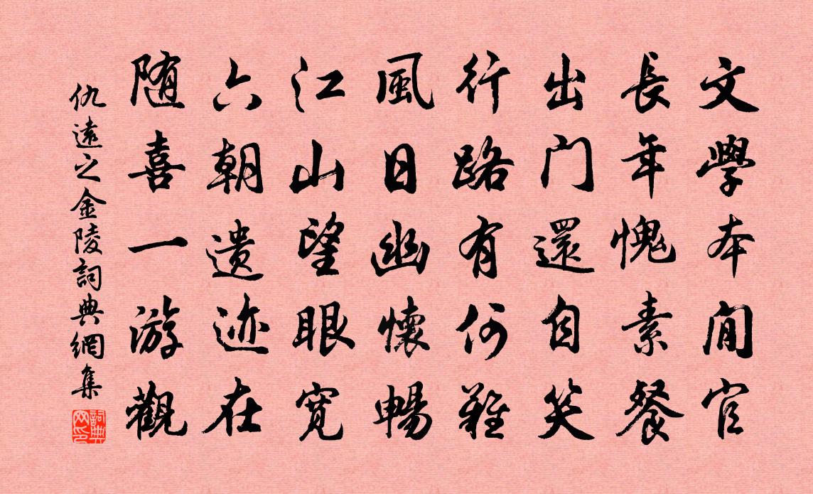 詩詞名句歷史字典書法欣賞書法字典國語詞典說文解字康熙字典古漢語字典標 題 作 者 詩 句 之金陵作者:仇遠 朝代:宋代之金陵原文文學本閒官,長年愧素餐。出門還自笑,行路有何難。風日幽懷暢,江山望眼寬。六朝遺蹟在,隨喜一游觀。詩詞問答問:之金陵的作者是誰?答:仇遠問:之金陵寫於哪個朝代?答:宋代仇遠之金陵書法欣賞之金陵書法作品詩詞推薦華陽吟三十首白玉蟾〔宋代〕玉皇殿下一仙童,曾掌符書守蕊宮。因甚俗緣猶未斷,於今紀質入塵籠。袁公濟和劉景文登介亭詩複次韻答之蘇軾〔宋代〕昏昏墮醉夢,奈此六月溽。君詩如清風,吹我朝睡足。登臨得佳句,江白照湖淥。袖手獨不言,默稿已在腹。是時喜定太學生送袁侍郎詹琰夫〔宋代〕天眷頻年惜掛冠,誰令今日遠長安。舉幡莫遂諸生願,祖賬應多行路難。去草豈知因害稼,彈烏何事卻驚鸞。送覺上人釋斯植〔宋代〕送君千里去,又見落花飛。水國今宵別,天涯隔歲歸。岸多春樹密,灘小夕陽微。後夜扁舟月,應逢宿鳥稀。情詩其十四倉央嘉措〔清代〕曾慕鴛鴦效雙棲,南谷林深葉迷離。除卻鸚哥誰人曉,莫將幽情向人啼。羊城感賦六首黃遵憲〔清代〕手挽三江盡北流,寇氛難洗越人羞。黃巢毒竟流天下,陶侃軍難進石頭。鋌鹿偶然完首尾,爛羊多賴得公侯。欃槍游寶蓋岩鄒應龍〔宋代〕夙有斯岩約,今朝喜踐盟。路從支澗入,人在半空行。六月如霜候,四時長雨聲。願求容膝地,著我過浮生。宿龍潭寺白居易〔唐代〕夜上九潭誰是伴,雲隨飛蓋月隨杯。明年尚作三川守,此地兼將歌舞來。詩談趙孟堅〔宋代〕吾嗤彼雲士,努力事詩妍。竟日搜枯腸,抽黃對白間。爾何無達觀,跼促自縛纏。不見淵明陶,有詩累百篇。要以至齋詩為劉知錄作項安世〔宋代〕酒邊琴外蕣華明,栗里幽人遠念生。一寸光陰知有限,百年心事恐無成。追隨春服攀高駕,指點雩童問去程。簣土鸚鵡詞蘇郁〔唐代〕莫把金籠閉鸚鵡,個個分明解人語。忽然更向君前言,三十六宮愁幾許。鶴林尚仁〔宋代〕楚楚異凡禽,相看瘦不禁。飢尋芝術晚,夢憶海山深。華表千年事,青天萬里心。一聲唳清夜,霜月滿疎林。道旁松喻良能〔宋代〕鬱郁千丈松,誰栽蔭修路。年祀寖綿邈,斧斤時謬誤。皇華重憐惻,霜根辱調護。他日比甘棠,流風繼行露。畫贊七言一首劉克莊〔宋代〕驢加九錫石三品,鳥睹村翁晚節榮。出有小車扶有杖,前身莫是邵先生。秋雨復將害稼孫應時〔宋代〕頗怪秋頻雨,兼疑暑頓涼。歲方祈有駜,夢豈誤無羊。敢與朝廷議,唯觀宇宙康。由來夸上瑞,不必頌芝房。紹興以後蜡祭四十二首佚名〔宋代〕末耜筆償,自神農氏。稼檣滋殖,為農者始。作配明祀,奠以告虔。萬世佃漁,帝功卓然。次韻康慶之見過醉歸讀予鄙作方回〔宋代〕飯顆山頭老面瘦,沈香亭北碎顏醒。二豪詩骨已淪淵,誰能汲古出深井。康侯天筆雕風騷,一蹴已過廬山高。大鵬送鹿門宗席頭釋正覺〔宋代〕吉祥草織禪家供,一片瑠璃滑無縫。門掩鱗鱗水不流,窗含冉冉雲初凍。坐寒風月蒲蘆秋,睡足江湖鷗鳥夢。而今過友人山莊姚合〔唐代〕蕙帶纏腰復野蔬,一莊水竹數房書。舉頭忽見南山雪,便說休官相近居。胡笳曲五拍文天祥〔宋代〕北庭數有關中使,飄飄遠自流沙至。胡人高鼻動成群,仍唱胡歌飲都市。中原無書歸不得,道路只今多擁隔。身欲名句推薦庭花蒙蒙水泠泠,小兒啼索樹上鶯。貫休《春晚書山家屋壁二首》 萬里歸來顏愈少,微笑,笑時猶帶嶺梅香。蘇軾《定風波·南海歸贈王定國侍人寓娘》 居必擇鄉,游必就士。荀子《荀子·勸學》 無執滯心,才是通方士;有做作氣,便非本色人。王永彬《圍爐夜話·第八六則》 都緣自有離恨,故畫作遠山長。歐陽修《訴衷情·眉意》 越鳥巢乾後,歸飛體更輕。李商隱《晚晴》 我也不登天子船,我也不上長安眠。唐寅《把酒對月歌》 春雨樓頭尺八簫,何時歸看浙江潮?蘇曼殊《本事詩十首·選二》 有理言自壯,負屈聲必高。馮夢龍《警世通言·卷十五》 山不在高,有仙則名水不在深,有龍則靈劉禹錫《陋室銘》
