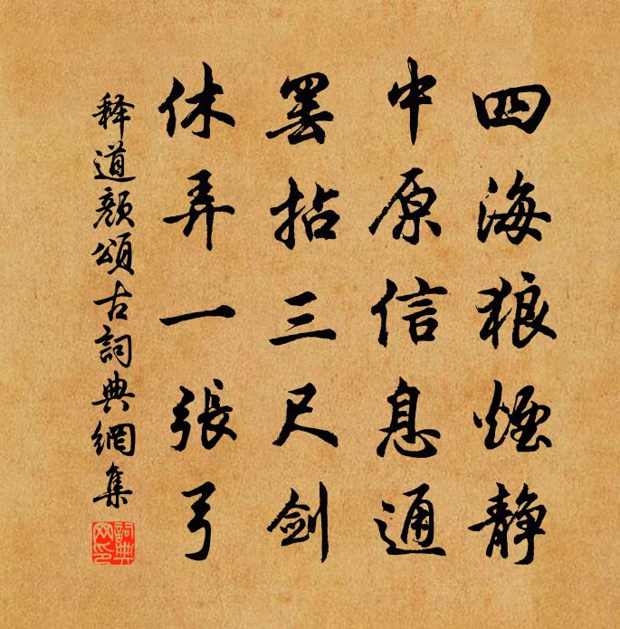 詩詞名句歷史字典書法欣賞書法字典國語詞典說文解字康熙字典古漢語字典標 題 作 者 詩 句 頌古作者:釋道顏 朝代:宋代頌古原文四海狼煙靜,中原信息通。罷拈三尺劍,休弄一張弓。詩詞問答問:頌古的作者是誰?答:釋道顏問:頌古寫於哪個朝代?答:宋代釋道顏頌古書法欣賞頌古書法作品詩詞推薦感皇恩·出京門有感李俊民〔金代〕忍淚出門來,楊花如雪。惆悵天涯又離別。碧雲西畔,舉目亂山重疊。據鞍歸去也,情淒切!一日三秋,寸腸千結阮郎歸邵亨貞〔元代〕茂陵多病不勝秋。多情還倚樓。隔江何處泊離舟。有人歌遠遊。清興在,此生浮。老來長是愁。西風吹夢白萍洲。餞潘吳二察院去國五首劉黻〔宋代〕塗碑共說台官去,局面還憂宰相來。今古風多興廢事,只緣忠佞是胚胎。僧院小泉井方乾〔唐代〕亦恐淺深同禹穴,兼雲制度象污樽。窺尋未見泉來路,緬想應穿石裂痕。片段似冰猶可把,澄清如鏡不曾昏。欲知寄黃思梅就別祖德陳杰〔宋代〕間闊長回首,俠來忽嗣音。故人今有子,吾輩數論心。歲晏懷甘旨,年衰毖枕衾。殷勤各強健,春在北枝深。三山望金陵,寄殷淑李白〔唐代〕三山懷謝朓,水澹望長安。蕪沒河陽縣,秋江正北看。盧龍霜氣冷,鳷鵲月光寒。耿耿憶瓊樹,天涯寄一歡。晚春衛宗武〔宋代〕飛花迷柳岸,小葉貼荷塘。冉冉年增老,匆匆春去忙。候禽喧巧哢,進駐卉逗余香。盡日敲吟字,詩慳類括囊。平雲閣偶作文同〔宋代〕陵陽郡事全稀少,懶守長贏半日閒。晚後須來上高閣,就中無厭是雲山。史魏公東湖別墅二首劉應時〔宋代〕雲抹山容疑潑綠,月涵波影自搖金。丈夫出處如雲月,猿鶴安能識此心。驀山溪(楊花)毛滂〔宋代〕雪空氈徑,撲撲憐飛絮。柔弱不勝春,任東風、吹來吹去。牆陰苑外,一片落誰家,葉依依,煙鬱郁,依舊如張緒題所書黃庭經後(泥金正書)景審〔唐代〕金粉為書重莫過,黃庭舊許右軍多。請看今日酬恩德,何似當年為愛鵝。次韻徐秀才十首陳造〔宋代〕霄霏上冥鴻,山霧臥文豹。餓鴟嚇腐鼠,啄啄詫飛趠。吾徒為己學,欣慼置不校。小草或遠志,詭遇乃近效。題崇德君所畫雀竹蜩螗圖贊黃庭堅〔宋代〕蒿下蹄間,斥鷃飲啄。爭雄穹枝,竿網將作。蟬嘒竹間,自謂得己。螗螂從之,雞鳴不已。又(一本此首同前第一首為二首)張說〔唐代〕春來半月度,俗忌一時閒。不酌他鄉酒,惟堪對楚山。清明雨寒八首楊萬里〔宋代〕閉戶何緣得句來,閞窗更倩雨相催。只言春色都歸去,小樹桃花政晚開。秋懷 十一王冕〔元代〕庭前碧梧樹,上有幽棲禽。養成五彩雛,鳴動黃鐘音。擬之簫韶間,葉彼聖賢心。夫何失其所,委置荊杞林?晦日宴遊嚴維〔唐代〕晦日湔裾俗,春樓致酒時。出山還已醉,謝客舊能詩。溪柳薰晴淺,岩花待閏遲。為邦久無事,比屋自熙熙。梁三朝雅樂歌 俊雅 一沈約〔南北朝〕設官分職。髦俊攸俟。髦俊伊何。貴德尚齒。唐乂鹹事。周寧多士。區區衛國。猶賴君子。漢之得人。帝猷乃理。調笑令王建〔唐代〕團扇,團扇,美人並來遮面。玉顏憔悴三年,誰復商量管弦。弦管,弦管,春草昭陽路斷。送僧雅覺歸東海(一作海東)張喬〔唐代〕山川心地內,一念即千重。老別關中寺,禪歸海外峰。鳥行來有路,帆影去無蹤。幾夜波濤息,先聞本國鍾。名句推薦雞聲茅店月,人跡板橋霜。溫庭筠《商山早行》 輪台九月風夜吼,一川碎石大如斗,隨風滿地石亂走。岑參《走馬川行奉送出師西征 / 走馬川行奉送封大夫出師西征》 北風夜卷赤亭口,一夜天山雪更厚。岑參《天山雪歌送蕭治歸京》 恃人不如自恃也,明於人之為己者不如己之自為也。韓非及後人《韓非子·外儲說右下》 守分安命,順時聽天。朱柏廬《朱子家訓·全文》 若說沒奇緣,今生偏又遇著他,若說有奇緣,如何心事終虛化?曹雪芹《紅樓夢·第五回》 勞苦之事則爭先,饒樂之事則能讓。荀子《荀子·修身》 恨身翻不作車塵,萬里得隨君。歐陽炯《巫山一段雲·春去秋來也》 年年躍馬長安市。客舍似家家似寄。劉克莊《玉樓春·戲林推》 伏屍百萬,流血漂櫓。賈誼《過秦論》