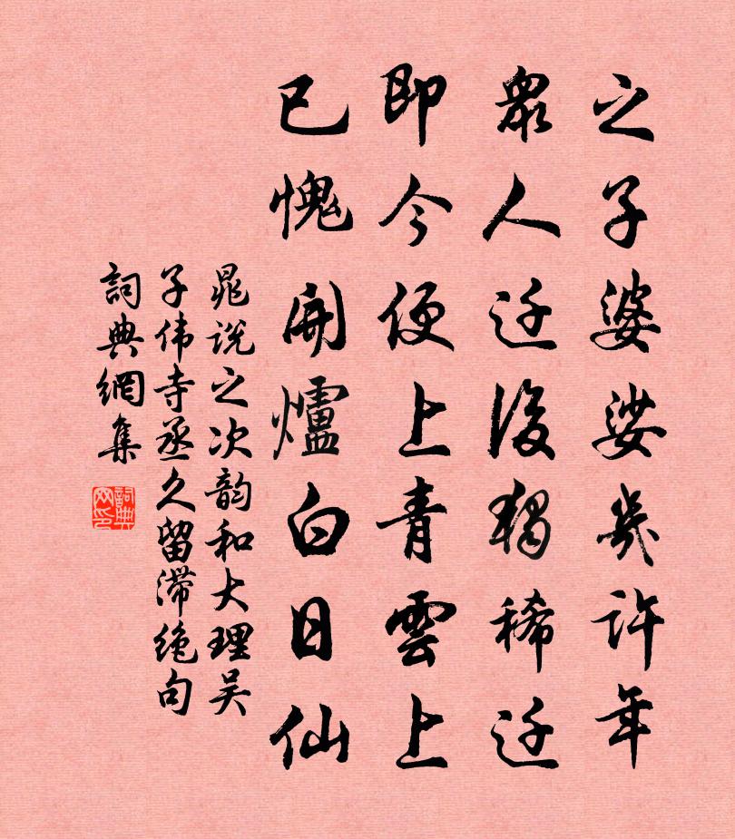 詩詞名句歷史字典書法欣賞書法字典國語詞典說文解字康熙字典古漢語字典標 題 作 者 詩 句 次韻和大理吳子偉寺丞久留滯絕句作者:晁說之 朝代:宋代原文之子婆娑幾許年,眾人遷後獨稀遷。即今便上青雲上,已愧開爐白日仙。詩詞問答問:《次韻和大理吳子偉寺丞久留滯絕句》的作者是誰?答:晁說之問:該詩寫於哪個朝代?答:宋代書法欣賞次韻和大理吳子偉寺丞久留滯絕句書法作品詩詞推薦贈侍中李良定公輓詞王珪〔唐代〕悲簫忽犯曉樓鍾,樽酒應非昔餞同。家貴曾還金鉞寵,時清不見玉關功。佳城蔓草千年閉,後院繁絃一夕空。惟有詩一首章康〔宋代〕掩關作夏計,長日獨清坐。戎葵競自花,安榴粲成朵。時芳詎容歇,幽賞無不可。微風忽吹來,諒亦深知我。八十吟十絕劉克莊〔宋代〕就莆食菜國恩優,晝錦全勝萬里侯。卻笑向來師尚父,磻溪不老老營丘。欹枕鄭谷〔唐代〕欹枕高眠日午春,酒酣睡足最閒身。明朝會得窮通理,未必輸他馬上人。贈了上人抄化黃庚〔宋代〕破衲卷秋雲,入山深更深。近聞營梵剎,應不累禪心。寒瀑瀉蒼壁,晚花生古林。遙思明月夜,誰聽穎師琴。端平二年端午帖子詞貴妃閣洪咨夔〔宋代〕裁成寶月翻宮扇,織就禪雲制御衣。朝賀歸來無點暑,坐看燕子引雛飛。歸來 其一王冕〔元代〕歸來人境異,故里是他鄉。坐閱紅塵過,愁多白髮長。關山雲渺渺,江漢水茫茫。世事何多感?憑高又夕陽。田舍丘葵〔宋代〕亂後無雞犬,昏到足蚋蚊。有翁如老鶴,蹙頞說官軍。理谷為春種,鞭禾到夜分。與兒再三話,衣食在辛勤。同蔣德施諸人賞簡園梨花胡寅〔宋代〕君不見韓退之,招喚劉師命。醉賞長安西郭梨, * 交相映。豈料炎荒中,好事如簡翁。雕冰剪玉春不融,二招文士飲孟郊〔唐代〕曹劉花不免死,花誰敢負年華。文士莫辭花,詩人命屬花。退之如放逐,李白自矜誇。萬古忽將似,一朝同嘆嗟。吳宮辭白居易〔唐代〕一入吳王殿,無人睹翠娥。樓高時見舞,宮靜夜聞歌。半露胸如雪,斜回臉似波。妍媸各有分,誰敢妒恩多。秋獮詩歐陽修〔宋代〕豳龠迎寒至,商飈應節流。戎容修大獮,殺氣順行秋。多稼登方茂,三農隙始休。飲歸軍實獻,誓眾黻為裘。索享秋望劉子翬〔宋代〕輝輝江日已沉西,隱約余紅泛渺瀰。卻上松岡望秋色,偶逢僧話立多時。擬古黃庚〔宋代〕驪龍有明珠,奇氣久磅礴。一為鮫人采,夜半泣海若。到寶諒難得,珍藏思遠托。如何賤所貴,用之以彈雀,彈雀句黃提舉〔宋代〕耕餘龍躍雲津去。西江月徐儼夫〔宋代〕曲折迷春院宇,參差近水樓台。 * 人去燕歸來。空有落梅香在。花底三更過雨,酒闌一枕驚雷。明朝飛夢隔天涯讀笠澤叢書三首楊萬里〔宋代〕松江縣尹送圖經,中有唐詩喜不勝。看到燈青仍火冷,雙眸如割腳如冰。禪人並化主寫真求贊釋正覺〔宋代〕雪髮霜髭,古岩阿師。坐寒空劫眼,機活用時眉。文殊靠倒維摩詰,帝釋仰贊須菩提。如今喫飯下堂去,誰敢等閒文昌燈牌陽枋〔宋代〕牡丹枝上先春蕊,翠可壇邊未雨虹。知有文章光萬丈,鍾成佳氣滿黔中。山居方岳〔宋代〕春溪革湖漱山瓢,歸臥藤陰蘚逕遙。雲氣釀成巫峽雨,松聲寒似浙江潮。書生與世例迂闊,山意向人殊寂寥。卻喜名句推薦爭渡,爭渡,驚起一灘鷗鷺。李清照《如夢令·常記溪亭日暮》 肅肅花絮晚,菲菲紅素輕。杜甫《春遠 / 春運》 夜戰桑乾北,秦兵半不歸。許渾《塞下曲》 二十四橋,頗有杜書記否。劉辰翁《桂枝香· * 人去》 至若救渴,飲之以漿;蠲憂忿,飲之以酒;盪昏寐,飲之以茶。陸羽《茶經·六之飲》 西登香爐峰,南見瀑布水。李白《望廬山瀑布水二首》 桃李待日開,榮華照當年。李白《長歌行》 氣相得則和,不相得則病佚名《黃帝內經·素問·五運行大論》 芳草斷煙南浦路,和別淚,看青山朱淑真《江城子·賞春》 觀天下書未遍,不得妄下雌黃。顏之推《顏氏家訓·勉學篇》