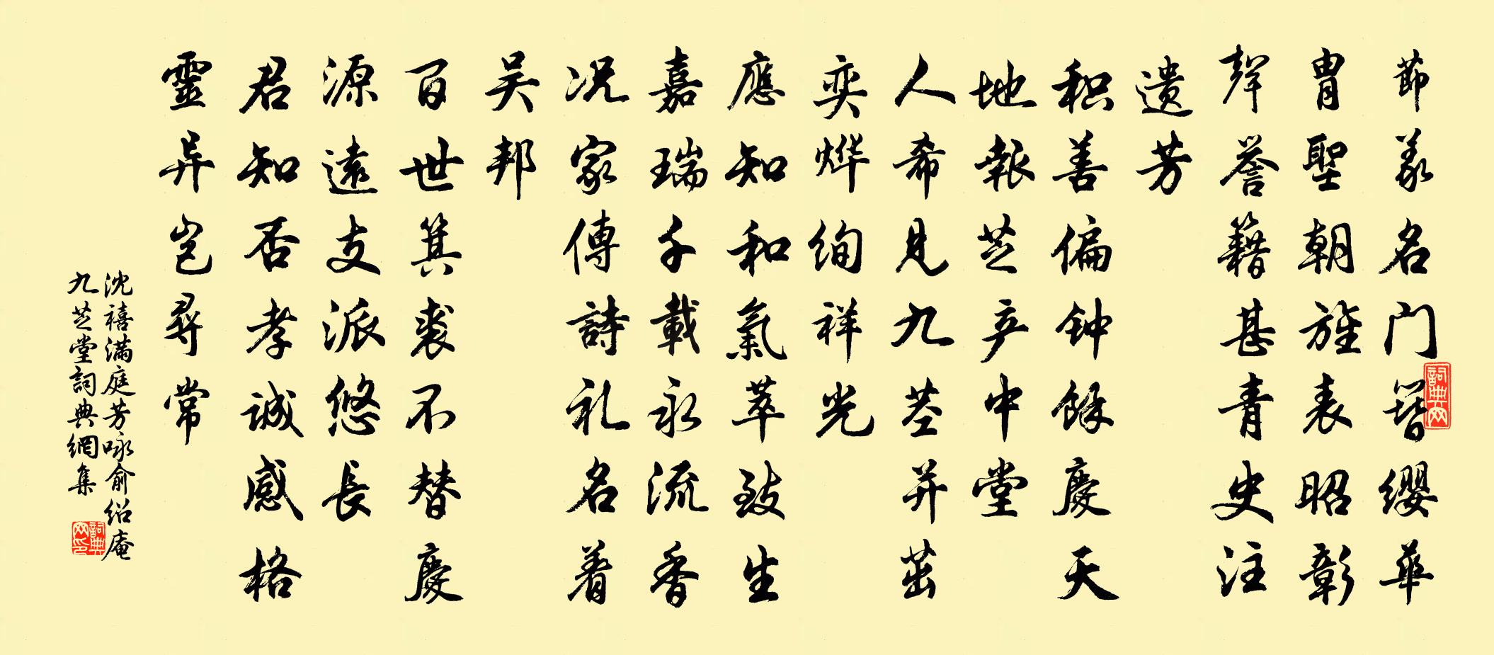 詩詞名句歷史字典書法欣賞書法字典國語詞典說文解字康熙字典古漢語字典標 題 作 者 詩 句 滿庭芳 詠俞紹庵九芝堂作者:沈禧 朝代:元代滿庭芳 詠俞紹庵九芝堂原文節義名門,簪纓華胄,聖朝旌表昭彰。聲譽籍甚,青史注遺芳。積善偏鍾餘慶,天地報、芝產中堂。人希見,九莖並茁,奕燁絢祥光。應知和氣萃,致生嘉瑞,千載永流香。況家傳詩禮,名著吳邦。百世箕裘不替,慶源遠、支派悠長。君知否,孝誠感格,靈異豈尋常。詩詞問答問:滿庭芳 詠俞紹庵九芝堂的作者是誰?答:沈禧問:滿庭芳 詠俞紹庵九芝堂寫於哪個朝代?答:元代問:滿庭芳 詠俞紹庵九芝堂是什麼體裁?答:詞沈禧滿庭芳 詠俞紹庵九芝堂書法欣賞滿庭芳 詠俞紹庵九芝堂書法作品詩詞推薦題因師百雁圖二首陳造〔宋代〕蓼灘蘆渚好徜徉,肯便雲天去作行。未用選奴防夜燎,不妨結伴傲晨霜。挽仁宗皇宗詞金君卿〔宋代〕億萬民靈四百州,銜恩哀慕幾時休。惜回長夜鈞天夢,歸侍仙都泰帝游。蒼野路遙斑竹恨,翠微宮冷白楊秋。國人贈柯山老人陸游〔宋代〕柯山老人九十餘,亂髮不櫛瘦如枯。百穿千結一布褲,得酒一吸輒倒壺。自言少年不蓄孥,有錢徑付酒家壚。人生青衣道人羅尚簡論予命宜退不宜進甚契鄙心連周必大〔宋代〕亦知磨蝎直身宮,懶訪星官與歷翁。豈有虛名望蘇子,謾令簸惡似韓公。時清早退人誰肯,命薄當閒我自通。破戒題東山玩月圖黃庚〔宋代〕斜陽紅盡暮雲碧,一片天光涵水色。海濤擁出爛銀盤,千里嬋娟共今夕。主人鄰客登東山,踏碎寒光看秋液。星河清平樂(次韻李提刑炁白笑詞並呈李參政壁)魏了翁〔宋代〕誰分天種。來上花鬘供。綠葉素雲姿雅重。那得愁心頻捧。他花自是無工。不關香淡香濃。才問為誰含笑,盈盈靴絕句洛浦道士〔宋代〕一水穿崖走碧沙,崖前樛木偃龍蛇。分明便是桃源洞,不見溪中流落花。禪人寫真求贊釋正覺〔宋代〕禪床默默,無得之得。寒淡賦心,清貧入骨。秋徹鮫人之家,霜摩老兔之窟。萬象影中兮自縱自橫,百草頭上兮隨瀏陽五詠洞陽楊時〔宋代〕聖童去後水雲閒,陳跡難尋草木問。獨有微言傳逸史,洞天寂寂在人寰。浣沙溪(黃鐘·第三)周邦彥〔宋代〕樓上晴天碧四垂。樓前芳草接天涯。勸君莫上最高梯。新筍已成堂下竹,落花都上燕巢泥。忍聽林表杜鵑啼。椰子冠蘇軾〔宋代〕天教日飲欲全絲,美酒生林不待儀。自漉疏巾邀醉客,更將空殼付冠師。規摹簡古人爭看,簪導輕安發不知。更著種菜劉子翬〔宋代〕傍舍植柔蔬,攜鋤理荒穢。桔槔勤俯仰,一雨功百倍。翰來綠映土,新葉搖肺肺。牛羊勿踐畦,肉食屠爾輩。伽溪章樵〔宋代〕試將生計問農家,兒大扶犁女漚麻。燒筍煮葵供午餉,山中樂事自無涯。晚興張九成〔宋代〕雨罷陰雲過,綠苔生滿齋。清詩喔晚思,遠興動幽懷。自恨無與適,誰雲寡所諧。茅檐有餘爽,點滴在空階。小溪至新田四首楊萬里〔宋代〕懊惱春光欲斷腸,來時長緩去時忙。落紅滿路無人惜,蹈作花泥透腳香。鷓鴣天佚名〔宋代〕憶得當年全盛時。人情物態自熙熙。家家簾幕人歸晚,處處樓台月上遲。花市里,使人迷。州東無暇看州西。都人次韻和景仁兄韓維〔宋代〕既酬斯有酢,在禮猶可追。起勸孰曰狂,狂在捉白髭。白髭雖見捉,淥酒安可辭。歌童小如拳,聊以開公眉。感興何夢桂〔宋代〕剩得田園歸去來,江南兩度見黃梅。軒窗有侶余松竹,牆壁無人半蘚苔。獨抱丹心徒自苦,相逢白首不須哀。人間司中司命五首佚名〔宋代〕我誠既潔,我豆既豈。神來降斯,有儼其容。薦此嘉幣,肅肅雍雍。何以侑之,于樂鼓鍾。自詠吟邵雍〔宋代〕老去無成齒髮衰,年將七十待何為。居常無病不服藥,間或有懷猶全詩。引水更憐魚並至,折花仍喜蝶相隨。平生名句推薦青青河畔草,鬱郁園中柳。佚名《青青河畔草》 士無事而食,不可也。孟子《孟子·滕文公章句下·第四節》 吾本乘興而行,興盡而返,何必見戴!劉義慶《世說新語·任誕》 楊柳青青著地垂,楊花漫漫攪天飛。佚名《送別詩》 疏是枝條艷是花,春妝兒女競奢華。曹雪芹《詠紅梅花得“花”字》 茶鼎熟,酒卮揚,醉來詩興狂。張大烈《阮郎歸·立夏》 年年今夜,月華如練,長是人千里。范仲淹《御街行·秋日懷舊》 孝有三:大孝尊親,其次弗辱,其下能養。戴聖《禮記·祭義》 翻被梨花冷看,人生苦戀天涯。張炎《朝中措·清明時節》 驚風亂颭芙蓉水,密雨斜侵薜荔牆。柳宗元《登柳州城樓寄漳汀封連四州》