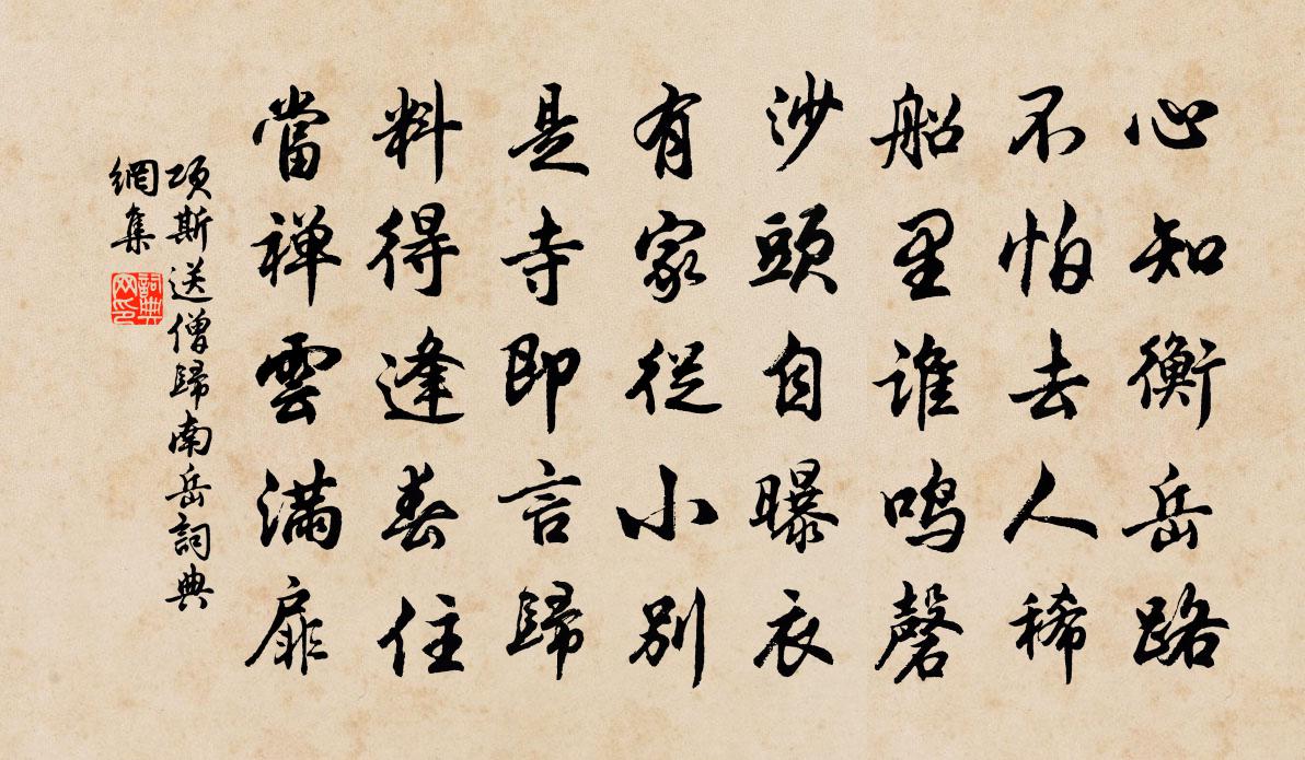 詩詞名句歷史字典書法欣賞書法字典國語詞典說文解字康熙字典古漢語字典標 題 作 者 詩 句 送僧歸南嶽作者:項斯 朝代:唐代送僧歸南嶽原文心知衡岳路,不怕去人稀。船里誰鳴磬,沙頭自曝衣。有家從小別,是寺即言歸。料得逢春住,當禪雲滿扉。詩詞問答問:送僧歸南嶽的作者是誰?答:項斯問:送僧歸南嶽寫於哪個朝代?答:唐代問:送僧歸南嶽是什麼體裁?答:五律項斯送僧歸南嶽書法欣賞送僧歸南嶽書法作品注釋全唐詩:卷554-5詩詞推薦汝墳佚名〔先秦〕遵彼汝墳,伐其條枚。未見君子,惄如調飢。遵彼汝墳,伐其條肄。既見君子,不我遐棄。魴魚赬尾,王室如毀。秋日感事示介甫曾鞏〔宋代〕秋日氣已盛,陰蟲朝暮聲。煙雲斷溪樹,風雨入山城。沙磧有遺虜,旌旗多遠行。生民苦未息,吾黨恥論兵。理公岩董嗣杲〔宋代〕西來識得此雲根,終此雲根護法門。由晉尚傳斯語在,到今休想舊岩存。天開教觀香燈盛,人仰胡僧相貌尊。行果句陽枋〔宋代〕白雲無心間泫水,清風何意自開花。哭胡處士曹松〔唐代〕丘中久不起,將謂詔書來。及見凌雲說,方知掩夜台。白衣歸北路,玄造亦遺才。世上亡君後,詩聲更大哉。登澤州城北樓宴陳子昂〔唐代〕平生倦遊者。觀化久無窮。復來登此國。臨望與君同。坐見秦兵壘。遙聞趙將雄。武安君何在。長平事已空。且歌次韻贈吳羽士月湖大椿方回〔宋代〕萬事平生大道杯,恍然曾過望鄉台。榮華外物毛端細,飄忽陽神頂上回。羅殿堪思蠻嶠瘴,郁儀永謝劫池灰。何□紫荊花方回〔宋代〕疏枝堅瘦骨為皮,忽迸紅英簇紫蕤。嬌女乍看齒生液,分明茜糝綴餳枝。和宋去華愛日樓之什黃公度〔宋代〕百里平疇一望間,綠蕪盡處見青山。孤雲自在開仍合,白鳥群飛去復還。竟日茶瓜留客坐,滿床圖史伴君閒。攜醪西江月 戲題五子扇頭劉敏中〔元代〕階下竇郎丹桂,眼中陶令新詩。渾教不是寧馨兒。且得平生慰意。曉露蘭芽香徹,春風杏蕾紅肥。最堪憐處雁行齊保應廟董朴〔宋代〕廟食空山八百年,衣冠猶是李唐前。汴河十里垂楊柳,何似松陰數畝田。書所見聞示諸友魏了翁〔宋代〕死城陷陣已長休,捍虜鳩民亦漫憂。局外閒人倚江立,全軀保室信良謀。年逾弱冠又多錦瑟之一弦身墮塵樊未徹玉霄白玉蟾〔宋代〕夜涼莫聽野猿哀,覺我枯腸轉九回。淅淅秋風吹性水,淹淹暮雨滴心灰。自憐孤影青燈下,曾作神霄故吏來。若待次韻酬宋中散二首王安石〔宋代〕初見彤庭賜履雙,便參東閣寄南邦。時聞正論除疑網,每讀高辭折慢幢。陳跡欲尋無復日,舊恩思報有如江。風流西省齋宿陪侍左史曹舍人話舊以除當字賦詩下程公許〔宋代〕一行奎畫寵新除,左陛濡毫要直書。何幸鵷班連省闥,誤令鼠璞雜瓊琚。雲窗樓閣非官府,璧月珠星近帝居。二十病起王安石〔宋代〕稚金敷新涼,老火灺殘濁。桃枝暖淟涊,散發曦曉捉。煩痾脫然愈,靜若遺身覺。移榻欹獨眠,欣佳恐難數。燕山亭(中秋諸王席上作)曾覿〔宋代〕河漢風清,庭戶夜涼,皓月澄秋時候。冰鑒乍開,跨海飛來,光掩滿天星斗。四卷珠簾,漸移影、寶階鴛甃。還又徐成之園亭三詠竹徑桃花孔武仲〔宋代〕闢地不盈畝,點綴成阻修。相招竹林逸,更作桃源游。綽約新飲露,琅玕曾倚秋。春風盪人意,此境獨清幽。哭徐璣翁卷〔宋代〕前時官上歸,感愴失靈暉。不料三年後,俱隨萬化非。塔峰長入座,池色自臨扉。無復乘閒屐,觀棋訪衲衣。涵碧亭三首曹冠〔宋代〕平生事澹泊,榮利不關心。杜門久謝客,豈容俗塵侵。令尹有佳招,聯轡游雲林。流觴繞雙魚,茂樾棲幽禽。揮毫名句推薦價一不擇主馮夢龍《警世通言·卷二十二》 千古風流八詠樓,江山留與後人愁。李清照《題八詠樓》 叩枻長歌,嫦娥欲下,萬里揮冰雪。趙秉文《大江東去·用東坡先生韻》 田家幾日閒,耕種從此起。韋應物《觀田家》 苦心中常得悅心之趣;得意時便一失意之悲。洪應明《菜根譚·概論》 別後不知君遠近。觸目淒涼多少悶。歐陽修《玉樓春·別後不知君遠近》 茅檐低小,溪上青青草。辛棄疾《清平樂·村居》 肥水東流無盡期。當初不合種相思。姜夔《鷓鴣天·元夕有所夢》 楚江湄,湘娥乍見,無言灑清淚周密《繡鸞鳳花犯·賦水仙》 尊前故人如在,想念我、最關情。周邦彥《綺寮怨·上馬人扶殘醉》