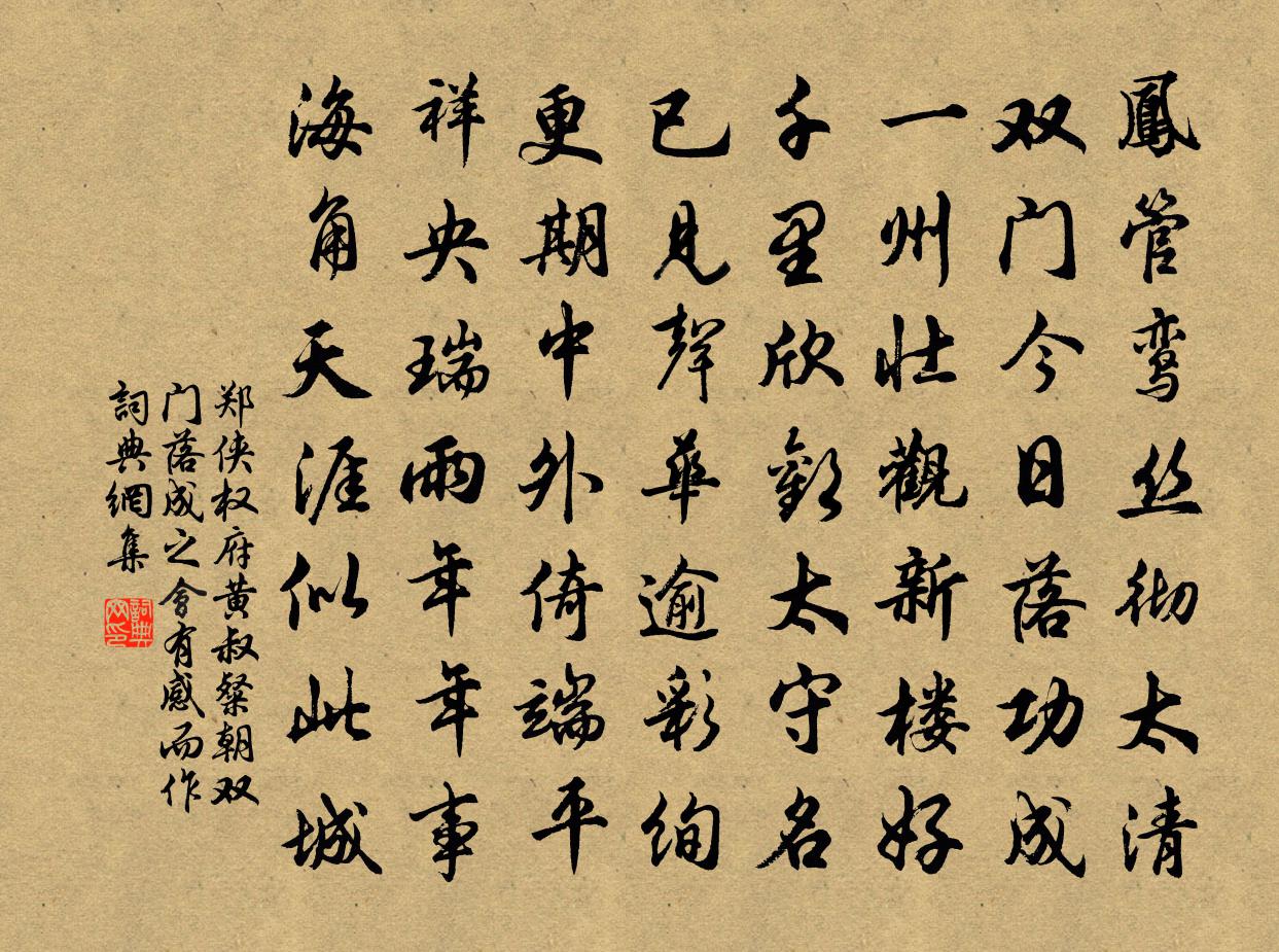 詩詞名句歷史字典書法欣賞書法字典國語詞典說文解字康熙字典古漢語字典標 題 作 者 詩 句 權府黃叔粲朝雙門落成之會有感而作作者:鄭俠 朝代:宋代原文鳳管鸞絲徹太清,雙門今日落功成。一州壯觀新樓好,千里欣歡太守名。已見聲華逾彩絢,更期中外倚端平。祥央瑞雨年年事,海角天涯似此城。詩詞問答問:《權府黃叔粲朝雙門落成之會有感而作》的作者是誰?答:鄭俠問:該詩寫於哪個朝代?答:宋代書法欣賞權府黃叔粲朝雙門落成之會有感而作書法作品詩詞推薦採菊一章黃庭堅〔宋代〕南山有菊,於采其英。誰從汝往,視我惸惸。伊時之人,誰適有比。不與我謀,不知其已。偈頌十二首釋安永〔宋代〕少處減些多處添,白雲官路販私鹽。一條性命俱拋下,不怕當初王令嚴。西村醉歸陸游〔宋代〕俠氣崢嶸蓋九州,一生常恥為身謀。酒寧剩欠尋常債,劍不虛施細碎讎。歧路凋零白羽箭,風霜破弊黑貂裘。陽狂偈二十二首釋洵〔宋代〕三年來在此山中,上下人情貴一同。今日溪頭休惜別,德雲只在妙高峰。禪人並化主寫真求贊釋正覺〔宋代〕白髮蒼顏,三篾住山。開眼不覺曉,靜坐不知閒。善應全機用,靈明入道環。而今相伴塵中去,榆葉青錢莫我慳。宿大徹禪師故院雍陶〔唐代〕竹房誰繼生前事,松月空懸過去心。秋磬數聲天欲曉,影堂斜掩一燈深。竇夔州見寄寒食日憶故姬小紅吹笙,因和之劉禹錫〔唐代〕鸞聲窈眇管參差,清韻初調眾樂隨。幽院妝成花下弄,高樓月好夜深吹。忽驚暮雨飄零盡,唯有朝雲夢想期。聞道晝臥白居易〔唐代〕抱枕無言語,空房獨悄然。誰知盡日臥,非病亦非眠。鼓腹無所思朝起暮歸眠湫明詩也以詩定韻為十滕岑〔宋代〕居閒閱往史,掩卷忽長吁。兒聞翁吁聲,取酒滿注盂。悠然盡三酌,雜慮散如驅。乃知此神物,不可一日無。西江月張掄〔宋代〕密布同雲萬里,六飛玉糝瓊鋪。清歌妙舞擁紅爐。猶恨寒侵尊俎。誰念山林路險,獨行跣足樵夫。莫驚苦樂□殊途洪崖吳芾〔宋代〕張老升仙不記年,石崖遺蹟尚流傳。心期默契真如見,何必追隨與拍肩。接花吟邵雍〔宋代〕物為萬發生,人為萬物靈。人非物不活,物待人而興。男女天所生,夫妻人所成。天人相與外,率是皆虛名。喜太守畢朝散致政黃庭堅〔宋代〕膏火煎熬無妄災,就陰息跡信明哉。功名富貴兩蝸角,險阻艱難一酒杯。百體觀來身是幻,萬夫爭處首先回。胸中奉餞萬安贊府兄長之官姚勉〔宋代〕有客來從仕國中,多時竹馬鬧兒童。爭言記壁崔斯立,今屬詩家姚武功。一節清如金掌露,十分明似水晶籠。先聲春詞毛滂〔宋代〕群心與物為春久,喚得春風破臘回。天近自應通信息,梅花不用犯寒來。挽如老歸真李昴英〔宋代〕不見才三日,喧傳已坐亡。平生功生到,垂絕偈言香。緣分無高剎,禪名卻四方。開包殘藁在,切勿放毫光。送劉法曹東歸魏野〔宋代〕上官多是嘆窮途,得替行裝盡有餘。唯有甘棠劉法掾,來時騎馬去騎驢。端午內中帖子詞皇帝閣王珪〔唐代〕御柳重重午影圓,薰風時泛舜琴弦。六宮競進長生縷,天子垂衣一萬年。陳老畫牛趙汝績〔宋代〕老融棄發逃於禪,胸藏丘壑身林泉。時拈寸草幻墨汁,慘澹咫尺生風煙。尤工畫牛古絕比,不特形似真神全。平生歲暮皈自城中,一病垂死,病起遣悶四首楊萬里〔宋代〕食罷游東園,慨然傷我懷。昨日臥病時,自謂不復來。入門大風起,萬松聲頓哀。病骨念不堪,欲行重裴徊。裴徊名句推薦任寶奩塵滿,日上簾鉤。李清照《鳳凰台上憶 * ·香冷金猊》 聞道故林相識多,罷官昨日今如何李頎《送陳章甫》 不務天時,則財不生;不務地利,則倉廩不盈管仲《管子·牧民》 學之乃知,不問不識。王充《論衡·卷二十六·實知篇》 得即高歌失即休,多愁多恨亦悠悠。羅隱《自遣》 且看欲盡花經眼,莫厭傷多酒入唇。杜甫《曲江二首》 知往日所往之非,則學日進矣王永彬《圍爐夜話·第五六則》 桃花落,閒池閣。山盟雖在,錦書難托。陸游《釵頭鳳·紅酥手》 寂寞柴門村落里,也教插柳記年華。趙元鎮《寒食書事》 但怪得、當年夢緣能短。吳文英《三姝媚·過都城舊居有感》