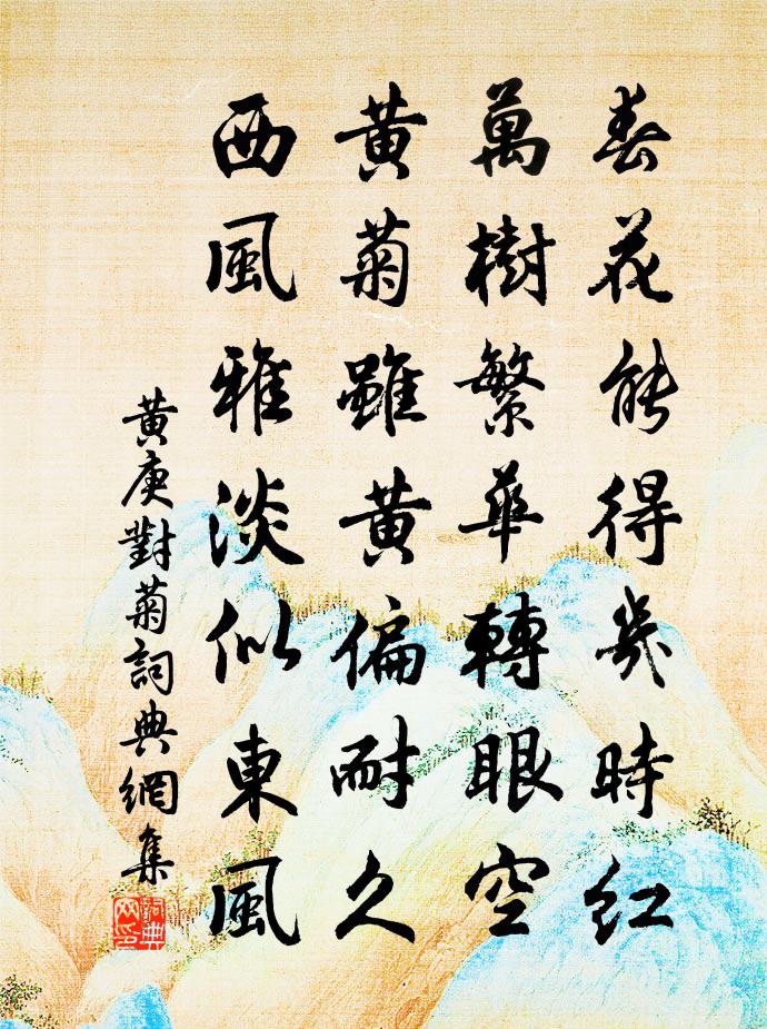 詩詞名句歷史字典書法欣賞書法字典國語詞典說文解字康熙字典古漢語字典標 題 作 者 詩 句 對菊作者:黃庚 朝代:宋代對菊原文春花能得幾時紅,萬樹繁華轉眼空。黃1/1菊雖黃偏耐久,西風雅淡似東風。詩詞問答問:對菊的作者是誰?答:黃庚問:對菊寫於哪個朝代?答:宋代黃庚對菊書法欣賞對菊書法作品詩詞推薦南郊慶成歐陽修〔宋代〕祀教民昭孝,天惟德是親。太宮嚴大饗,吉土兆精禋。禮樂三王盛,梯航萬國賓。恩沾群動洽,慶與一陽新。奉冊德遠叔坐上賦餚核八首藕楊萬里〔宋代〕荷衣芰制雪為容,家住雲煙太華峰。外面看來真璞玉,胸中琱出許玲瓏。秋暑三首楊萬里〔宋代〕不教老子略眉開,夏熱未除秋熱來。一夜涼風吹欲盡,半輪曉日喚將回。碧雲峰陳岩〔宋代〕瘦藤引我上崚嶒,蒼壁如梯石作層。袖得碧雲無用處,卻將分贈住山僧。蝶戀花(春感)黃升〔宋代〕百計留春春不住。褪粉吹香,日日催教去。心事欲憑鶯語訴。流鶯劃地無憑據。綠玉闌乾圍綺戶。一點柔紅,應在同倪善之納涼壽芳陳鑒之〔宋代〕尚未階軟翠流長,境靜蒲荷覺更香。清坐小亭叢竹近,暫停團扇受風諒。上茶使鄒郎中孟程公許〔宋代〕節傳擁玉帳,天遣西南來。怦怦朱絲繩,皎皎明鏡台。稂莠亟芟夷,本極費栽培。度外廣物色,世豈真乏才。升甫旋和答覆走筆酬之強至〔宋代〕嫩籜斑斑玳點勻,圓膚細細玉條新。渭川美實容先食,卻向秋風懶憶蓴。與胡祠部游法華山蘇軾〔宋代〕陂湖欲盡山為界,始見寒泉落高派。道人未放泉出山,曲折虛堂瀉清快。使君年老尚兒戲,綠棹紅船舞澎湃。一笑同成父弟訪王亢宗遇周欽止同過圓通看竹二首趙蕃〔宋代〕鄰圃代曾經,僧園種得成。不關新雨過,自是絕塵生。疎直能明眼,幽深足敘情。何當共攜被,重此聽秋聲。雪晴再次韻陳造〔宋代〕璇穹瑩澈晴風后,曉日初融陌路泥。老檜蒼筠潛動色,迎春送臘好分題。藏春僧合心曾戀,闖海山亭夢到迷。回首和舅氏公退言懷陳師道〔宋代〕追陪強韻愧難過,應接前聞覺未多。盛禮每虛摩詰席,舊詞猶可雪兒歌。手開新徑延徐步,眼趁高梧上碧蘿。風雨未至池陽五里有齊山寺後岩石巉然緣崖而上絕楊冠卿〔宋代〕泉石吾膏肓,佳處每忘返。攜壺上翠微,一雨秋政晚。千岩如獻狀,秀色疊層巘。緣雲梯逕入,危磴石偃蹇。洞戶漁家傲歐陽修〔宋代〕四月園林春去後。深深密幄陰初茂。折得花枝猶在手。香滿袖。葉間梅子青如豆。風雨時時添氣候。成行新筍霜筠郭解王安石〔宋代〕藉交唯有不貲恩,漢法歸成棄市論。平日五陵多任俠,可能推刃報王孫。句宋真宗〔宋代〕臣守但當守公法,馳騖苟進何可取。句孫升〔宋代〕白雲每逐晨光出,紅鶴長隨暮靄還。極相思蔡伸〔宋代〕碧檐鳴玉玎璫。金鎖小蘭房。樓高夜永,飛霜滿院,璧月沈缸。雲雨不成巫峽夢,望仙鄉、煙水茫茫。風前月底,石榴歌皮日休〔唐代〕蟬噪秋枝槐葉黃,石榴香老愁寒霜。流霞包染紫鸚粟,黃蠟紙裹紅瓠房。玉刻冰壺含露濕,斕斑似帶湘娥泣。蕭娘長汀寄李使君戴復古〔宋代〕在處晚禾熟,經今瘴霧消。山林無盜賊,道路有歌謠。人喜逢豐歲,誰知感聖朝。溪橋閒寓目,魚鳥亦逍遙。名句推薦歌泣不成天已暮,悲風日夜起江生。魏禧《登雨花台》 淇則有岸,隰則有泮。佚名《氓》 天街曾醉美人畔,涼枝移插烏巾。吳文英《夜飛鵲·蔡司戶席上南花》 卷旗夜劫單于帳,亂斫胡兒缺寶刀。馬戴《出塞詞》 啼號升斗抵千金,凍雀飢鴉共一音。范成大《雪中聞牆外鬻魚菜者求售之聲甚苦有感》 用人物,須明求。儻不問,即為偷。李毓秀《弟子規·謹》 口之宣言也,善敗於是乎興左丘明《國語·周語·邵公諫厲王弭謗》 孤眠鸞帳里,枉勞魂夢,夜夜飛揚。佚名《鳳歸雲·閨怨》 樓頭客子杪秋後,日落君山元氣中。陳與義《登岳陽樓》 莫辭酒味薄,黍地無人耕。杜甫《羌村三首·其三》