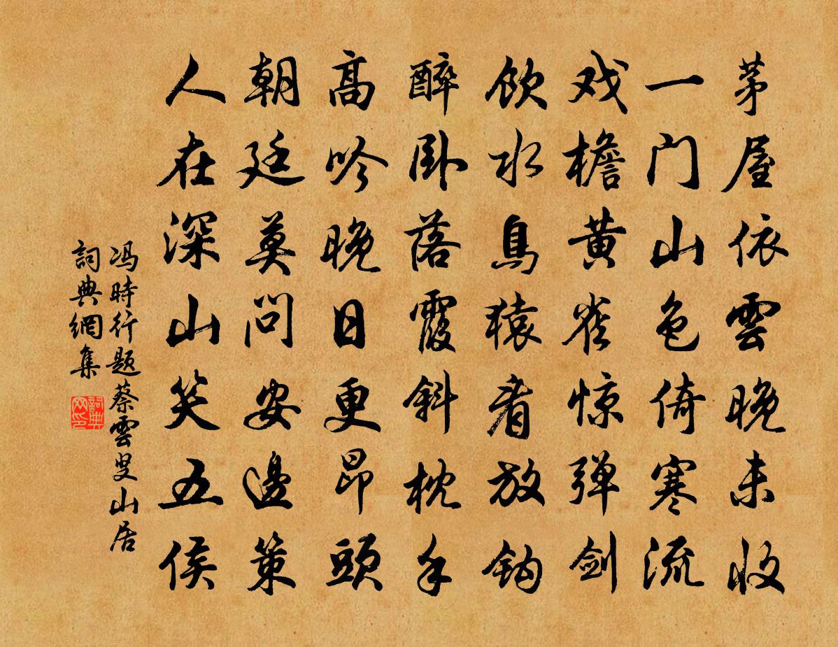 詩詞名句歷史字典書法欣賞書法字典國語詞典說文解字康熙字典古漢語字典標 題 作 者 詩 句 題蔡雲叟山居作者:馮時行 朝代:宋代題蔡雲叟山居原文茅屋依雲晚未收,一門山色倚寒流。戲檐黃雀驚彈劍,飲水鳥猿看放鉤。醉臥落霞斜枕手,高吟晚日更昂頭。朝廷莫問安邊策,人在深山笑五侯。詩詞問答問:題蔡雲叟山居的作者是誰?答:馮時行問:題蔡雲叟山居寫於哪個朝代?答:宋代馮時行題蔡雲叟山居書法欣賞題蔡雲叟山居書法作品詩詞推薦踏莎行 重陽全真集卷之七王哲〔元代〕睡里搜尋,眠中做作。目*認正恆歡樂。想成三寶自神靈,結成九轉真丹藥。攢聚祥雲,往來碧落。後隨前引唯鸞招司馬實游夏圃邵雍〔宋代〕兩霽景自好,秋深天未寒。可能乘興否,夏圃上盤桓。和劉疏軒雪堂韻李曾伯〔宋代〕因君郢調問前蹤,賢者斯能樂雪宮。四海香名寰宇外,百年公論黨碑中。癯然鶴骨存生氣,寂甚鸞膠續古風。留得自料張鎡〔宋代〕自料躬耕體力微,他年為圃雅相宜。植茶要是依桑蔭,種芋先須納豆萁。藥愛金櫻長林薄,花因木槿作藩籬。祗應無寐方岳〔宋代〕雨寒不寒苔蘚紫,霜落未落楊柳黃。野鷹飢嘯獸擇肉,邊馬戰摧烏啄瘡。兵氛甚惡寸心折,劍無恙,雙毛蒼。極知相思林徐凝〔唐代〕遊客遠遊新過嶺,每逢芳樹問芳名。長林遍是相思樹,爭遣愁人獨自行。秋月二首李石〔宋代〕夜榻近虛檐,獨葭玉蟾冷。梧桐氣先奪,端不礙清影。因學者問生死到來如何抵當答以四偈釋梵琮〔宋代〕生死到來何抵當,月明靜夜共商量。荷華荷葉通訊息,一陳風來一陳香。毒熱寄簡崔評事十六弟杜甫〔唐代〕大暑運金氣,荊揚不知秋。林下有塌翼,水中無行舟。千室但掃地,閉關人事休。老夫轉不樂,旅次兼百憂。蝮蛇偈頌一百二十三首釋祖欽〔宋代〕昏沉散亂,莫非本地風光。絕點純清,正是真常流注。非不非,不是不。差之毫釐,失之千里。幸然無些子事,何兩獐陸游〔宋代〕吾園畜兩獐,善驚未易馴。及今才幾時,弭耳常依人。飢食園中草,渴飲溝澗濱。時時輟餘糧,亦未耗吾囷。吏或論詩三十首·十一元好問〔金代〕眼處心聲句自神,暗中摸索總非真。畫圖臨出秦川景,親到長安有幾人?袁參政輓詩魏了翁〔宋代〕奕奕萬夫望,才名四十霜。重來陪講幄,三入位文昌。地辟南廳峻,磚重首折行。修途日未旰,弭節復相羊。次韻和答斯遠見過書所見趙蕃〔宋代〕來歸僅兼旬,來過已雲屢。共耽林剎深,同賞溪亭露。濁清一再行,俊逸今古句。或喔山更幽,或詠舟橫渡。竟日奉和春日池台元萬頃〔唐代〕日影飛花殿,風文積草池。鳳樓通夜敞,虬輦望春移。又次韻少保雄楚樓席上項安世〔宋代〕炷香秋色里,落筆翠微間。 * 開雲土,毫芒見峽山。水花光似武,幽鳥語扣蠻。不分荊州牧,全勝寓客閒。次韻子瞻潁州留別二首蘇轍〔宋代〕放舟清淮上,盪潏洗心胸。所遇日轉勝,恨我不得同。江淮忽中斷,陂埭何重重。紫蟹三寸筐,白鳧五尺童。赤鯉長安春望感懷寇準〔宋代〕灞岸春波遠,秦川暮雨微。憑高正愁絕,煙樹更斜暉。張以道歸自甬東先餉土物兩詩為謝張鎡〔宋代〕梨柿魚鹽來海上,殷勤持送與閒官。緣何似得千金贈,明日重親語笑歡。讀史八首陳普〔宋代〕不是二顏張許輩,故將軀命委沙塵。天生熊掌真滋味,自美自甘難告人。名句推薦階下青苔與紅樹,雨中寥落月中愁。李商隱《端居》 荒城臨古渡,落日滿秋山。王維《歸嵩山作》 天馬徠,龍之媒,游閶闔,觀玉台。劉徹《天馬二首·其二》 和平處事,勿矯俗為高;正直居心,勿設機以為智。王永彬《圍爐夜話·第六五則》 黃霧漲天雪晦冥,黑雲拂地風膻腥沈約《昭君辭》 盡做舊愁都忘卻,新愁何處著王庭筠《謁金門·雙喜鵲》 鳥銜野田草,誤入枯桑里。李白《樹中草》 福輕乎羽,莫之知載;禍重乎地,莫之知避。莊子《莊子·內篇·人間世》 風摧寒棕響,月入霜閨悲。李白《獨不見》 同來不得同歸去,故國逢春一寂寥!杜牧《宣州送裴坦判官往舒州時牧欲赴官歸京》