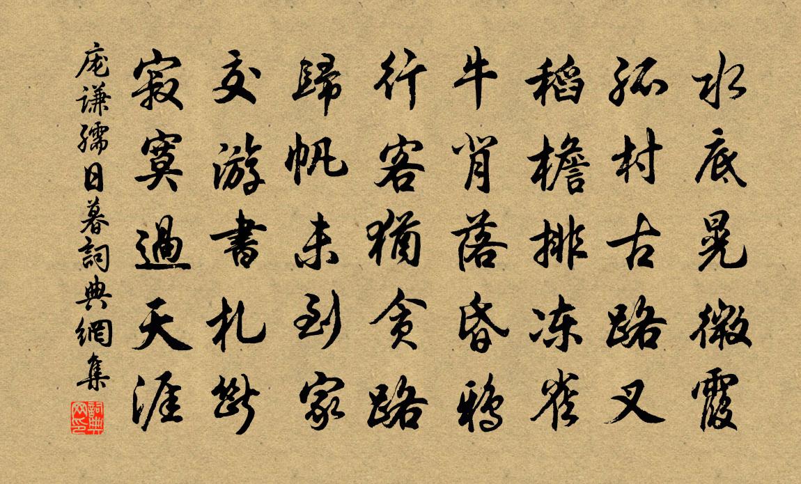 詩詞名句歷史字典書法欣賞書法字典國語詞典說文解字康熙字典古漢語字典標 題 作 者 詩 句 日暮作者:龐謙孺 朝代:宋代日暮原文水底晃微霞,孤村古路叉。稻檐排凍雀,牛背落昏鴉。行客猶貪路,歸帆未到家。交遊書札斷,寂寞過天涯。詩詞問答問:日暮的作者是誰?答:龐謙孺問:日暮寫於哪個朝代?答:宋代龐謙孺日暮書法欣賞日暮書法作品詩詞推薦寄顧次岳五首許月卿〔宋代〕運千可際休明運,心一堪傳賢聖心。不一此心非自玉,半千之運或如金。道源天出三清境,遠目明雙寸碧岑。胸次早趙倅王邁〔宋代〕別駕從來頭沓高,非關期奏壓宜敖。推敲今日韓饒買,引避他年藺下頗。螂欲當車觀者笑,駟難及舌罪焉逃。小詩巫山一段雲 上 峰趙孟頫〔元代〕雲里高唐觀,江邊楚客舟。上升峰月照妝樓。離思兩悠悠。雲雨千重阻,長江一片秋。歌聲頻唱引離愁。光景恨如陳榮緒惠示之字韻詩推獎過實非所敢當輒次高黃庭堅〔宋代〕紛紛不可耐,君子有憂之。鞅掌誠莊語,賢勞似怨詩。頹波閱砥柱,濁水得摩尼。知我無枝葉,刳心只有皮。送張南簡入蜀白居易〔唐代〕昨日詔書下,求賢凡陸沈。無論能與否,皆起徇名心。君獨南遊去,雲山蜀路深。次韻巴陵羅簿送行二首王炎〔宋代〕旌陽峰下水成淵,可約鳧鷗共一川。種秫漸營浮蟻瓮,結茅重理蠹魚編。敢期晤晤方傾蓋,遽有新詩當贈鞭。仰望奉使契丹二十八首 絕句二首蘇轍〔宋代〕亂山環合疑無路,小徑縈迴長傍溪。仿佛夢中尋蜀道,興州東谷鳳州西。日色映山才到地,雪花鋪草不曾消。睛寒句石文德〔唐代〕月沈湘浦冷,花謝漢宮秋。送范漕赴召八絕洪咨夔〔宋代〕淮頭蜀口幾虺聵,百戰山川入眼來。行伍姓名渾歷歷,定知水鏡不遺材。句張表臣〔宋代〕床弩天誅韓闥覽,劍鋒神助宋將軍。題張曦顏兩花圖──繁杏范成大〔宋代〕紅紛團枝一萬重,當年獨自費東風。若為報答春無賴,付與笙歌鼎沸中。繆伯恭輓詞樓鑰〔宋代〕我實由汪出,垂髫托外門。非惟拜先德,猶及見新婚。謹厚推鄉曲,恩慈篤弟昆。善人今已矣,餘慶在兒孫。雪晴二首白玉蟾〔宋代〕早上新鶯語尚蠻,花無氣力倚雕欄。幸蒙殘雪回頭早,又遣東風薄倖寒。宣城見杜鵑花李白〔唐代〕蜀地曾聞子規鳥,宣城又見杜鵑花。一叫一迴腸一斷,三春三月憶三巴。青玉案·新腔一唱雙金斗吳文英〔宋代〕新腔一唱雙金斗,正霜落,分柑手。已是紅窗人倦繡,春詞裁燭,夜香溫被,怕減銀壺漏。吳天雁曉雲飛後,百感山中回憶東山老楊蟠〔宋代〕山遊興發特尋君,屐齒筇枝繞四鄰。峰北看去忘世務,澗南聽水得天真。名高寂寞存僧史,林下風流似晉人。何日臨江仙(晁達州見和)晁補之〔宋代〕君似蒼崖千仞竹,一枝孤映蒿蕭。簞瓢不減萬鍾豪。閒情搔短髮,佳句詠纖腰。罷酒蘭舟回楚柂,相思何處今宵。法界頌二首張嵲〔宋代〕山河大地因誰有,聞見覺知非我親。不掛一絲全體露,真成本分住山人。題人畫扇十首曹勛〔宋代〕寬圍綠野正華滋,放牧橫溪草軟時。跪乳從茲富原顯,尚羔先喜詠來思。淮上寄趙茂實戴復古〔宋代〕渺渺長淮路,秋風落木悲。乾坤限南北,胡虜迭興衰。志士言機會,中原入夢思。江湖好山色,都在夕陽時。名句推薦出犯繁花露,歸穿弱柳風溫庭筠《清明日》 常思某人境界不及我,某人命運不及我,則可以知足矣王永彬《圍爐夜話·第六一則》 颯颯東風細雨來,芙蓉塘外有輕雷。李商隱《無題·颯颯東風細雨來》 得賢者安存,失賢者危亡戴聖《大戴禮記·保傅第四十八》 萬里浮雲卷碧山,青天中道流孤月。李白《答王十二寒夜獨酌有懷》 月照城頭烏半飛,霜淒萬樹風入衣。李頎《琴歌》 有不可及之志,必有不可及之功王永彬《圍爐夜話·第一三O則》 上邪,我欲與君相知,長命無絕衰。佚名《上邪》 春去花還在,人來鳥不驚。王維《畫》 記得那年花下,深夜,初識謝娘時。韋莊《荷葉杯·記得那年花下》