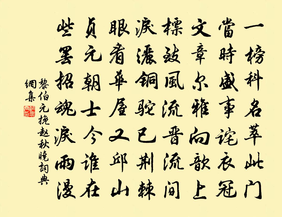 詩詞名句歷史字典書法欣賞書法字典國語詞典說文解字康熙字典古漢語字典標 題 作 者 詩 句 挽趙秋曉作者:黎伯元 朝代:宋代挽趙秋曉原文一榜科名萃此門,當時盛事詫衣冠。文章爾雅向歆上,標緻風流晉流間。淚灑銅駝已荊棘,眼看華屋又邱山。貞元朝士今誰在,些罷招魂淚雨漫。詩詞問答問:挽趙秋曉的作者是誰?答:黎伯元問:挽趙秋曉寫於哪個朝代?答:宋代黎伯元挽趙秋曉書法欣賞挽趙秋曉書法作品詩詞推薦早發大堰宋祁〔宋代〕曉戍朧朧白,春流納納深,生煙才著樹,罷月稍依林。野路趨斜岸,漁舠泊暗潯。尚緣歸國意,差足慰離襟。殘春詠懷,贈楊慕巢侍郎白居易〔唐代〕位逾三品日,年過六旬時。不道官班下,其如筋力衰。猶憐好風景,轉重舊親知。少壯難重得,歡娛且強為。興來政府生日四首曹勛〔宋代〕歲躔回次拱台星,麟閣儀刑首萬英。鍾阜堂堂分秀潤,淮波袞袞湛清明。鋪張治具調元化,整頓皇綱撫有生。鶴馭詠葡萄唐彥謙〔唐代〕西園晚霽浮嫩涼,開尊漫摘葡萄嘗。滿架高撐紫絡索,一枝斜嚲金琅璫。天風颼颼葉栩栩,蝴蝶聲乾作晴雨。神蛟論語絕句一百首張九成〔宋代〕文子平生不妄為,仲尼想亦喜聞之。或能再矣斯猶可,何況加之以三思。同子中兄游龍鬚吉祥善生諸寺歸至柞樹渡大風周必大〔宋代〕遍尋山寺穿雲子,歸戲風波踏浪兒。事業如斯官給廩,廬陵米貴有人飢。劫桑嘆高斯得〔宋代〕美哉豳郊道,風日清且熙。條桑紛冉冉,采蘩復祁祁。盛時不可再,亂世誠堪悲。守令既暗懦,凶黠何紛披。千林寒食日出遊韓愈〔唐代〕李花初發君始病,我往看君花轉盛。走馬城西惆悵歸,不忍千株雪相映。邇來又見桃與梨,交開紅白如爭競。可憐偈頌一百零二首釋慧遠〔宋代〕堂前開飯掂,屋裹販揚州。南泉翻鹽落醬鋼,趙州老鼠入牛角。剡山夜月(一題剡溪舟行)朱放〔唐代〕月在沃洲山上,人歸剡縣溪邊。漠漠黃花覆水,時時白鷺驚船。和成父過寶應縣韻袁說友〔宋代〕趁得花封八月涼,相家有子綰銅章。習華指日神京路,此地方知寶應祥。次韻學士重陽雪中見招不赴前後十六首洪皓〔宋代〕一介蹉跎略敘陳,轉喉觸諱聽於神。正愁平子將除館,強學申公亦謝賓。厚貌深情非易察,磨肌戛骨不勝辛。傍人偈頌一百三十六首釋惟一〔宋代〕昔日不生,今日不滅。出入飛鳶嶺,未曾有出入。洞山不曾到,投子不相識。若道嗣德山,未免自屈抑。象骨巍巍故洛城古牆劉禹錫〔唐代〕粉落椒飛知幾春,風吹雨灑旋成塵。莫言一片危基在,猶過無窮來往人。題故元少尹集後二首白居易〔唐代〕黃壤詎知我?白頭徒憶君。唯將老年淚,一灑故人文。遺文三十軸,軸軸金玉聲。龍門原上土,埋骨不埋名。新霽和人韻劉學箕〔宋代〕晚天未霽煙張霧,浮埃蔽空雲擘絮。西山遠掛月一眉,澹澹寒輝生綺戶。須知仰視天中央,清飈震拂銀河光。人影寧師西閣趙善應〔宋代〕飄泊南來幾歲寒,追談往事溫心酸。雲煙暮隔中原望,歸折梅花忍淚看。水龍吟(丙辰生日)劉克莊〔宋代〕兒童不識樗翁,挽衣借問年今幾。少如彥國,大如君實,披襟高比。德業天淵,有些似處,鬚眉而已。願老身無事還宮樂佚名〔宋代〕喜賀我皇,有感蓬萊,盡降神仙。到乘鸞駕鶴御樓前。來獻長壽仙丹。玉殿階前排筵會,今宵秋日到神仙。笙歌寥和錢太博見寄覓山藥釋重顯〔宋代〕聖君鴻業在扶持,日角龍章固不羸。摛藻玉堂歸未晚,百花開赴御筵時。名句推薦但知江湖者,都是薄命人。佚名《增廣賢文·下集》 柳柔搖不定,草短綠應難。張惠言《風流子·出關見桃花》 中池所以綠,待我泛紅光。沈約《詠芙蓉》 汀洲采白苹,日落江南春。柳惲《江南曲》 行賢而去自賢之心,焉往而不美。韓非及後人《韓非子·說林上》 繁枝容易紛紛落,嫩葉商量細細開。杜甫《江畔獨步尋花七絕句》 獨上小摟春欲暮,愁望玉關芳草路。韋莊《木蘭花·獨上小樓春欲暮》 淥水明秋月,南湖采白蘋。李白《淥水曲》 機在於應事;戰在於治氣尉繚《尉繚子·十二陵》 偶參伍之驗,以責陳言之實韓非及後人《韓非子·備內》