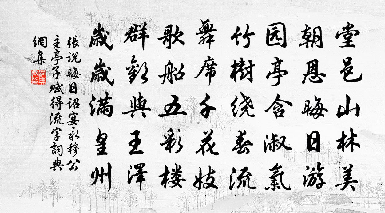 詩詞名句歷史字典書法欣賞書法字典國語詞典說文解字康熙字典古漢語字典標 題 作 者 詩 句 晦日詔宴永穆公主亭子賦得流字作者:張說 朝代:唐代原文堂邑山林美,朝恩晦日游。園亭含淑氣,竹樹繞春流。舞席千花妓,歌船五彩樓。群歡與王澤,歲歲滿皇州。詩詞問答問:《晦日詔宴永穆公主亭子賦得流字》的作者是誰?答:張說問:該詩寫於哪個朝代?答:唐代問:該詩是什麼體裁?答:五律書法欣賞晦日詔宴永穆公主亭子賦得流字書法作品注釋全唐詩:卷87_18詩詞推薦道室雜詠陸游〔宋代〕冰霜難與夏蟲語,晦朔豈容朝菌知。忿欲至前能小忍,人人券內有期頤。登育王山示現塔贈鄉璉與三上人王銍〔宋代〕危岫戴寶塔,亭亭起虛空。金鐸韻廣樂,日夜鏘天風。氣真逼雲漢,興逸追鸞鴻。嘉有三禪子,超曠棲禪宮。相追和華岳過鄱陽湖趙及甫〔宋代〕驀地波濤怒震霆,整冠危坐肯消魂。乘風更駕飛帆去,要看夜潮生海門。晦日重宴陳嘉言〔唐代〕高門引冠蓋,下客抱支離。綺席珍羞滿,文場翰藻摛。蓂華雕上月,柳色藹春池。日斜歸戚里,連騎勒金羈。三日侍華光殿曲水宴代人應詔詩 五謝朓〔南北朝〕求賢每勞。得士方逸。有覺斯順。無文鹹秩。萬箱惟重。百鍰載恤。屈草戒諛。階蓂紀日。戲月韓維〔宋代〕缺處還孤守,圓時亦獨棲。何曾聞合壁,只見是如珪。桂子遺秋信,方諸寄夜啼。建章殘漏促,又伴玉繩低。閒居初冬作陸游〔宋代〕香碗 * 又一新,天將閒處著閒身。東窗換紙明初日,南圃移花及小春。婦女晨炊動井臼,兒童夜誦聒比鄰。早知益壽美金花侯善淵〔元代〕適來相見。唬我魂飛心膽顫。休覓休尋。相遇相逢沒善心。告伊休拜。恐怕貧兒思舊債。各自回頭。稍有違心作馬雜興十二首方回〔宋代〕人固有倒行,天亦有逆施。膾肝富且壽,沴氣乃至茲。歲旱茂稊稗,夜暗號鴞鴟。正卯宜一律,遇塗姑巽辭。麟經喜飲吟邵雍〔宋代〕堯夫喜飲酒,飲酒喜全真。不喜成酩酊,只喜成微醺。微醺景何似,襟懷如初春。初春景何似,天地才絪紜。不知尚書湯公輓詞樓鑰〔宋代〕奏邸崇先契,周旋古括州。殿庭觀唱第,海郡繼承流。方快飛騰上,俄聞汗漫遊。鳳凰山下路,丹旆想悠悠。挽學士張公汪應辰〔宋代〕俎豆平生事,逢時卻論兵。幄中多妙畫,閫外即長城。曾未登三府,何言夢兩楹。空餘行樂處,畫像儼如生。題群牧圖釋惟一〔宋代〕雨過桃林草正肥,休徵牧放恰相宜。擊頭戴角群然樂,喜見太平無事時。感皇恩程大昌〔宋代〕七十在前頭,難言未老。只是中間有些好。鬒雲雖瘦,未有一根華皓。都緣心地靜,無憂惱。此際生朝,梅花獻笑就報恩借碾碾茶彝老有詩因次其韻喻良能〔宋代〕斷無鵝鴨惱比鄰,賴有鍾魚隔竹聞。故遣新茶就佳磑,要供戲彩滿甌雲。佛日常長老請贊釋鹹傑〔宋代〕赤手全提,金圈栗棘。跳出三要三玄,破盪佛祖窠窟。試問人何神通,盡力吐露不出。咄咄,佛日長老,與麽拈出更漏子王沂孫〔宋代〕日銜山,山帶雪。笛弄晚風殘月。湘夢斷,楚魂迷。金河秋雁飛。別離心,思憶淚。錦帶已傷憔悴。蛩韻急,杵聲再次交代韻四首陳造〔宋代〕嗣皇仁覆物昭蘇,皋自陳謨鯀自吁。聞道諸公扶國論,須君左袒訂邦誣。憩瑞安北湖詩三首林季仲〔宋代〕吐晴林雨薄,弄水夕陽驕。風定雲橫野,馬鳴人度橋。蘚斑封石骨,花影動溪腰。誰破南窗夢,空山落斷樵。贈茅也休王諶〔宋代〕逢人說也休,舉世任沉浮。清磬野雲曉,素琴山月秋。詩材頻料理,世事不經求。每向滄波上,時時戲鴨鷗。名句推薦父母呼,應勿緩。父母命,行勿懶。李毓秀《弟子規·入則孝》 君子求諸己,小人求諸人。孔子弟子《論語·衛靈公篇》 胭脂淚,相留醉,幾時重。李煜《相見歡·林花謝了春紅》 河橋送人處,涼夜何其。周邦彥《夜飛鵲·河橋送人處》 不語含嚬深浦里,幾回愁煞棹船郎,燕歸帆盡水茫茫。薛昭蘊《浣溪沙·紅蓼渡頭秋正雨》 同來望月人何處?風景依稀似去年。趙嘏《江樓舊感 / 江樓感舊》 幾時能命駕,對酒落花前。賈島《清明日園林寄友人》 雍雍新雁咽寒聲,愁恨年年長相似。李煜《謝新恩·冉冉秋光留不住》 但看三五日,相見不如初。佚名《增廣賢文·上集》 曉看天色暮看雲,行也思君,坐也思君。唐寅《一剪梅·雨打梨花深閉門》