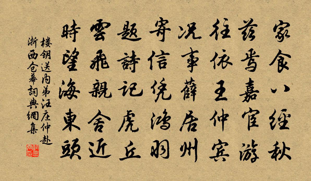 詩詞名句歷史字典書法欣賞書法字典國語詞典說文解字康熙字典古漢語字典標 題 作 者 詩 句 送內弟汪莊仲赴浙西倉幕作者:樓鑰 朝代:宋代送內弟汪莊仲赴浙西倉幕原文家食八經秋,茲焉嘉宦遊。往依王仲賓,況事薛居州。寄信憑鴻羽,題詩記虎丘。雲飛親舍近,時望海東頭。詩詞問答問:送內弟汪莊仲赴浙西倉幕的作者是誰?答:樓鑰問:送內弟汪莊仲赴浙西倉幕寫於哪個朝代?答:宋代樓鑰送內弟汪莊仲赴浙西倉幕書法欣賞送內弟汪莊仲赴浙西倉幕書法作品詩詞推薦廨舍梅花欲開三絕王炎〔宋代〕頗怪涪翁錯下言,水仙許入弟兄間。恨無好語供題品,花定嗔人頹玉山。沁園春 為王彥博尚書壽張野〔元代〕佳氣蔥蔥,喜事重重,福祿鼎來。記秋官重任,去年顯擢,春闈寵渥,今歲安排。壽算綿綿,班資袞袞,*邐相隨徒步訪李宣叔宣叔有詩依韻答梅堯臣〔宋代〕渡河誰道去,我重子云才。鴻雁汀洲去,牛羊井落徠。乍行初覺倦,暫語不能該。日色看看暮,將歸意復徊。夏日小集池上韻明甫之作李彌遜〔宋代〕生怕微雲點太清,籜龍莫作斷腸聲。餘霞到晚銖衣薄,滿月當空玉斧成。已結松筠為老伴,不緣蛙黽喚愁生。但令讀黃節推卷梅堯臣〔宋代〕磊落黃從事,清吟古氣多。少年知任俠,欲老解登科。辨起公卿坐,時為慷慨歌。又持珠玉贈,將奈老貧何。送六人禪者隨宏長老住大智釋曇華〔宋代〕大智荒涼久,中興六上人。機前施遠略,句下要通津。事理無兼帶,偏圓有主賓。風雲今際會,彈指一番新。寄題儒榮堂陸游〔宋代〕軍容基禍廟謀疏,尚記文登遣使初。只道大功隨指顧,至今遺種費誅鋤。還朝不遣參麟筆,寓直空聞上石渠。剩辦漁家傲歐陽修〔宋代〕正月新陽生翠琯。花苞柳線春猶淺。簾幕千重方半卷。池冰泮。東風吹水琉璃軟。漸好憑闌醒醉眼。隴梅暗落芳英薺花張鎡〔宋代〕薺花繁處蝶爭飛,忽憶前年三月時。流水流杯人共醉,晚來疎雨又新詩。出心原詹初〔宋代〕行行涉南原,遙望北山岑。上有千尺崖,下有高樹林。高林轉幽隩,戛然啼雙禽。流水自迅逝,白雲澹無心。策杖贊三十六祖頌釋印肅〔宋代〕咄哉瞿曇氏,唯富那夜奢。不拘有無種,遍地法蓮華。吉祥草王相〔宋代〕得名良不惡,蕭灑在山房。生意無休息,存心固久長。風霜徒自老,蜂蝶為誰忙。歲晚何人問,山空暮雨荒。游羅漢院途中口占李處權〔宋代〕休論至後日相催,乘興籃輿到嶺隈。風竹盡搖花玉玦,雲山渾作爛銀堆。須知此日逢僧話,不減當年訪戴回。更喜踏莎行 題破窗風雨圖和王筠庵韻 珊瑚木難卷金炯〔元代〕草帶殘編,荷衣斷袂。破窗風雨深深閉。江南倦客正思家,燈花搖夢來鄉里。翠竹檐前,碧蕉叢里。秋聲鬥合愁心塞下曲張玉孃〔宋代〕寒入疳榆霜滿天,鐵衣馬上枕戈眠。愁生書角鄉心破,月度深閨舊夢牽。落雁行銀箭,開弓鄉欣環。三更豪鼓角,科舉王柏〔宋代〕紛紛衿佩止時文,競巧趨新做日程。一試賓士天下士,三年冷暖世間情。清朝不許人心壞,舉子安知天爵榮。所用海陵書事晁說之〔宋代〕今古悠悠嘉上同,徒令客子恨無窮。竹椽泥壓清虛節,葦爨香殊忠厚風。騰倚百年麋鹿外,波瀾一日鳳凰中。可憐題詩卷程公許〔宋代〕嚼雪喔詩格外清,誰令失腳入紅塵。錦囊二十篇中景,長與西山面目親。歷陽過杜挺之遂約同入汴梅堯臣〔宋代〕滄海瀉玉自外天,牛斗傍邊客正回。人說維摩居士病,我同王子雪舟來。汀洲沮洳潮新蒼,山日曈曚霧始開。去約與羅隱互謔顧雲〔唐代〕青蠅被扇扇離席, ——顧雲白澤遭釘釘在門。 ——羅隱名句推薦疑行無成,疑事無功。商鞅《商君書·更法》 征馬分飛日漸斜,見此空為人所嗟。孟浩然《高陽池送朱二》 楚江湄,湘娥乍見,無言灑清淚周密《繡鸞鳳花犯·賦水仙》 明月,明月,胡笳一聲愁絕。戴叔倫《轉應曲·邊草》 月色燈山滿帝都,香車寶蓋隘通衢。李商隱《觀燈樂行》 東園載酒西園醉,摘盡枇杷一樹金。戴復古《初夏遊張園》 然而其持之有故,其言之成理。荀子《荀子·非十二子》 見世人可取者多,則德日進矣。王永彬《圍爐夜話·第五六則》 兩水夾明鏡,雙橋落彩虹。李白《秋登宣城謝朓北樓》 雨後輕寒猶未放。春愁酒病成惆悵。歐陽修《蝶戀花·面旋落花風蕩漾》