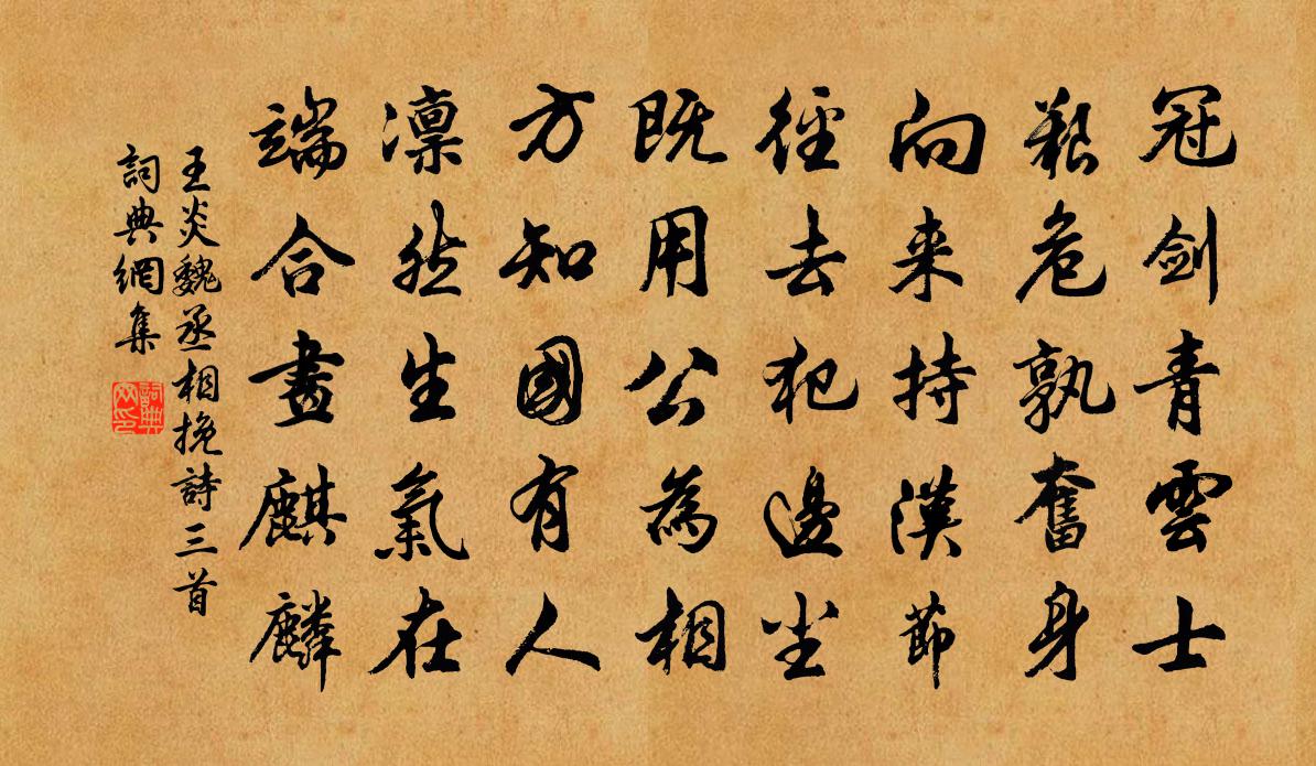 詩詞名句歷史字典書法欣賞書法字典國語詞典說文解字康熙字典古漢語字典標 題 作 者 詩 句 魏丞相輓詩三首作者:王炎 朝代:宋代魏丞相輓詩三首原文冠劍青雲士,艱危孰奮身。向來持漢節,徑去犯邊塵。既用公為相,方知國有人。凜然生氣在,端合畫麒麟。詩詞問答問:魏丞相輓詩三首的作者是誰?答:王炎問:魏丞相輓詩三首寫於哪個朝代?答:宋代王炎魏丞相輓詩三首書法欣賞魏丞相輓詩三首書法作品詩詞推薦次韻子云春日雜興五首韓元吉〔宋代〕鶗鴃鳴時春事空,菰蒲葉小未成叢。已拚江草無情綠,不奈山花恣意紅。送王季海敷文赴閩漕喻良能〔宋代〕諫省歸來三載餘,君王應渴見鴻儒。七閩重地誰能漕,聊出長才為轉輸。延平次趙糾曹韻十四首紫氣陳宓〔宋代〕三尺有正氣,外邪何可乾。功用雖未見,韜藏誰將看。次韻周朝宗六月十日泛湖周邦彥〔宋代〕風舟挽猶遲,兀若乘款段。深行蛟龍國,氈盪光炯散。洲涼扇荷箑,山晚垂雲幔。眷言江海期,百年行欲半。送源中丞使新羅(一作姚合詩)殷堯藩〔唐代〕赤墀奉命使殊方,官重霜台紫綬光。玉節在船清海怪,金函開詔撫夷王。雲晴漸覺山川異,風便寧知道路長。誰得昨雖移韻於蘭然石鼎聯章不可以不成也再賦一鄭清之〔宋代〕好惡移人信有力,宮姬尚取崑崙織。剛姿未必廣平愛,皓首誰憐趙岐息。夷車衡茝蓀芷荃,富矣離騷夸博識。靈均王郎中妓席五詠箏顧況〔唐代〕秦聲楚調怨無窮,隴水胡笳咽復通。莫遣黃鶯花里囀,參差撩亂妒春風。·106 ·依韻和景仁聞喜席上作兼呈司馬君實內翰王珪〔唐代〕奉詔華林事最榮,門前幾度放門生。三朝遇主惟文翰,十榜傳家有姓名。碧海蟠桃和露重,丹山雛鳳入雲清。詩書記客語方岳〔宋代〕蒲萄斗酒自堪醉,何用苦博西涼州。使我堆錢一百屋,醉倒春風更掉頭。秀亭秋懷十五首方回〔宋代〕宣父蓋老於行,蓋苦辛定六蓋藝。至今峨冕旒,萬國奉烝祭。當時困在陳,粒粟不能致。宰割諸侯王,重瞳氣蓋世點絳唇(仙呂)周邦彥〔宋代〕孤館迢迢,暮天草露沾衣潤。夜來秋近,月暈通風信。今日原頭,黃葉飛成陣,知人悶,故來相趁,共結臨岐恨。酬夢得以予五月長齋延僧徒絕賓友見戲十韻白居易〔唐代〕賓客懶逢迎,翛然池館清。檐閒空燕語,林靜未蟬鳴。葷血還休食,杯觴亦罷傾。三春多放逸,五月暫修行。香印和友人下第北游感懷李頻〔唐代〕新地為儒可致身,誰知又別五陵春。青門獨出空歸鳥,紫陌相逢盡醉人。江島去尋垂釣遠,塞山來見舉頭頻。且須贈相士陳道人曾豐〔宋代〕道人滿藏是光明,況問 * 乞得靈。眸子外無餘造化,士人中有幾公卿。愛名者十忌者百,逢人言失物言得。試指雜詩三首羅公升〔宋代〕形驅世鞅縛,妄滅天刑逃。我身不失我,榮辱誰能操。蔬肉等一戀,耕學兩不高。未應泉石癖,可笑州縣勞。秦人代員將軍罷戰後歸舊里贈朔北故人(一作常袞詩)盧綸〔唐代〕結髮事疆場,全生俱到鄉。連雲防鐵嶺,同日破漁陽。牧馬胡天晚,移軍磧路長。枕戈眠古戍,吹角立繁霜。歸老酒旗彭齊〔宋代〕太平天子束戈矛,惟許青旗在酒樓。我有百瓢元帥量,使君酣戰客中愁。陪幸韋嗣立山莊應制(一作宋之問詩)李乂〔唐代〕樞掖調梅暇,林園種槿初。入朝榮劍履,退食偶琴書。地隱東岩室,天回北斗車。旌門臨窈窕,輦道屬扶疏。雲罕寄題陳適追養亭李覯〔宋代〕築室先塋下,哀心有所歸。每來開戶牖,渾似戀庭闈。丘木成風樹,衰裳換彩衣。吾生與君類,東望涕交揮。游禁苑幸臨渭亭遇雪應制徐彥伯〔唐代〕玉律藏冰候,彤階飛雪時。日寒消不盡,風定舞還遲。瓊樹留宸矚,璇花入睿詞。懸知穆天子,黃竹謾言詩。名句推薦疏籬下、試覓重陽,醉擘青露菊。吳文英《一寸金·秋感》 一自胡塵入漢關,十年伊洛路漫漫。陳與義《詠牡丹》 痴心做處人人愛,冷眼觀時個個嫌。馮夢龍《喻世明言·卷三》 細看茱萸一笑,詩翁健似常年。張可久《風入松·九日》 夭夭園桃,無子空長。曹丕《煌煌京洛行》 長幼有序。孟子《孟子·滕文公章句上·第四節》 不扶自直,不鏤自雕。范曄《後漢書·列傳·周黃徐姜申屠列傳》 黯然銷魂者,唯別而已矣!江淹《別賦》 相思本是無憑語,莫向花箋費淚行。晏幾道《鷓鴣天·醉拍春衫惜舊香》 君自故鄉來,應知故鄉事。王維《雜詩三首·其二》