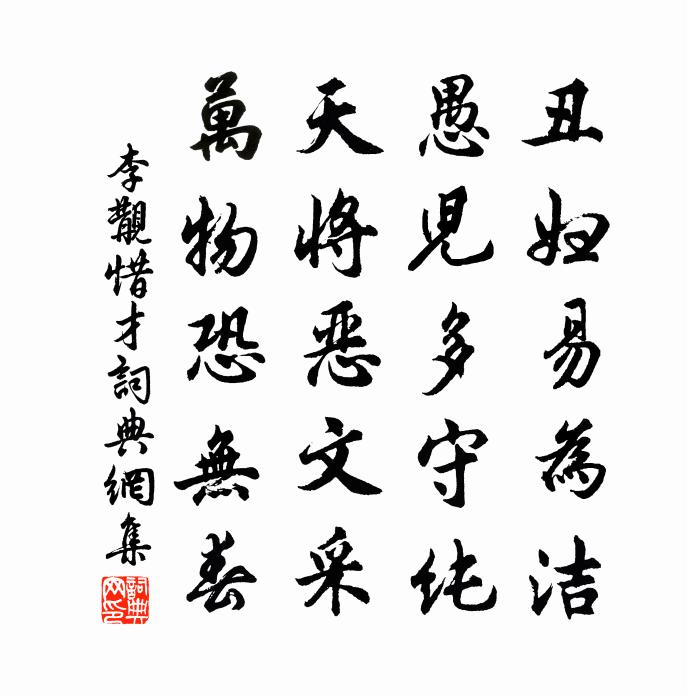 詩詞名句歷史字典書法欣賞書法字典國語詞典說文解字康熙字典古漢語字典標 題 作 者 詩 句 惜才作者:李覯 朝代:宋代惜才原文醜婦易為潔,愚兒多守純。天將惡文采,萬物恐無春。詩詞問答問:惜才的作者是誰?答:李覯問:惜才寫於哪個朝代?答:宋代李覯惜才書法欣賞惜才書法作品詩詞推薦驀山溪(和人冬至韻)朱敦儒〔宋代〕西江東去,總是傷時淚。北陸日初長,對芳尊、多悲少喜。美人去後,花落幾春風,杯漫洗。人難醉。愁見飛灰細春晚客中雜吟四絕句程公許〔宋代〕桑陰翳翳響繅車,麥熟多時穩吐芽。若使征輸寬一半,人生最樂只田家。柬白丈人徐凝〔唐代〕昔時丈人鬢髮白,千年松下鋤茯苓。今來見此松樹死,丈人斬新鬢髮青。辛卯滿散天基節即事六首劉克莊〔宋代〕野衲云云祝聖躬,亦拈拂子演宗風。恨渠僻陋無聞見,不識光公與杲公。寄曾節夫張栻〔宋代〕曾子別經月,想思如幾秋。不應和役嘆,卻為賈胡留。雨後湖光滿,梅邊春意浮。須君細商略,晴日共茶甌。潁叟弟贈別韻蘇泂〔宋代〕狙公多詐惑朝三,蟻穴何知亦戰酣。世上規行無中矩,人間北看有城南。懷哉畎畝終從欲,老矣江湖合罷參。便道滿庭芳杏俏〔宋代〕景傍清明,日和風暖,數枝濃淡胭脂。春來早起,惟我獨芳菲。門外幾番雨過,似佳人、細膩香肌。堪賞處,玉樓偈頌一百六十首釋宗杲〔宋代〕沖開碧落松千盡,截斷紅塵水一雞。不識本來真面目,將謂人題德嶠詩。少年行姚寬〔宋代〕少年白鼻騧,玉勒錦連韉。徑就胡姬飲,熟醉當壚眠。剝絲入蠶繭,郎意在 * 。房陵十首陳造〔宋代〕雩壇歌舞雜嗟吁,下酉猶濡上酉枯。誰謂朝來一拆雨,歡聲已覺沸通衢。青玉案·綠槐煙柳長亭惠洪〔宋代〕綠槐煙柳長亭路。恨取次、分離去。日永如年愁難度。高城回首,暮雲遮盡,目斷人何處。解鞍旅舍天將暮。暗憶句張釜〔宋代〕畫屏展盡一山川。壽櫟前假山成,移丹桂於馬城自嘲范成大〔宋代〕堂前趣就小嶙峋,未許蹣跚杖屨親。更遣移花三百里,世間真有大痴人。太常李博士史館孫秘丞相繼奉使浙右博士至郡楊億〔宋代〕分憂從漢殿,捧詔出蕭牆。路入三吳遠,舟浮一水長。詩題石門側,夢徹斗城傍。清曉見雲物,依依認帝鄉。長兒授館於杭每休暇過仲實家相與譚經析理間牟巘五〔宋代〕共飲方酣月滿樓,劇談無寐露侵裘。此宵此景應難值,吾婿吾兒亦罕儔。情誼渾如同一姓,風流不負兩中秋。絕憐山園戲書三物汪炎昶〔宋代〕雨餘露雙角,戴角緣欹危。吾疑甚為累,失此將何依。荒涼一畝宮,晨出暮來歸。雖不著我體,為累豈異茲。應有感春三首張耒〔宋代〕日長殘雪滴高檐,院靜人閒風度簾。可是歲華隨日好,故應愁恨逐春添。題張季長少卿飾庵,名取告詞雲學足以自飾楊萬里〔宋代〕吾友張飾庵,學到賁上白。真賁初非文,至飾亦無色。君看瑄玉姿,豈借青黃飾。寶氣不自中,白虹貫空碧。飾庵賞花至湖上陸游〔宋代〕吾國名花天下稀,園林盡日敞朱扉。蝶穿密葉常相失,蜂戀繁香不記歸。欲過每愁風蕩漾,半開卻要雨霏微。良辰次韻謝石教授喜十晁公溯〔宋代〕天子齋居坐法宮,萬方都屬指揮中。敢安無事思樂泮,方戒有司歸在豐。每念三農皆望歲,直朝九月始休工。知君名句推薦怎不思量,除夢裡、有時曾去趙佶《宴山亭·北行見杏花》 波面澄霞,蘭艇采香去。高觀國《祝英台近·荷花》 假令風歇時下來,猶能簸卻滄溟水李白《上李邕》 客自長安來,還歸長安去。李白《金鄉送韋八之西京》 相思謾然自苦,算雲煙、過眼總成空。戴復古《木蘭花慢·鶯啼啼不盡》 師也者,教之以事而喻諸德者也戴聖《禮記·文王世子》 三杯兩盞淡酒,怎敵他、晚來風急?李清照《聲聲慢·尋尋覓覓》 日中則移,月滿則虧。劉向《戰國策·秦三·蔡澤見逐於趙》 樂遊原上清秋節,鹹陽古道音塵絕。李白《憶秦娥·簫聲咽》 疑行無成,疑事無功。商鞅《商君書·更法》