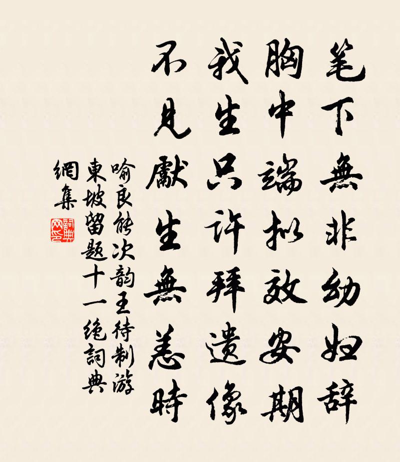 詩詞名句歷史字典書法欣賞書法字典國語詞典說文解字康熙字典古漢語字典標 題 作 者 詩 句 次韻王待制游東坡留題十一絕作者:喻良能 朝代:宋代原文筆下無非幼婦辭,胸中端擬效安期。我生只許拜遺像,不見先生無恙時。詩詞問答問:《次韻王待制游東坡留題十一絕》的作者是誰?答:喻良能問:該詩寫於哪個朝代?答:宋代書法欣賞次韻王待制游東坡留題十一絕書法作品詩詞推薦送呈定夫西歸真德秀〔宋代〕世情重聲利,榮途足趨走。夫君獨何為,輕年闖林藪。東尋金壇翁,南訪玉峰叟。借問兩臞仙,來時輕健否。石壁釋可湘〔宋代〕喝不開兮鑿不開,春風幾度長莓苔。趙州拄杖雖粗糲,未必親曾靠著來。暇日六詠其三(柳絮)張耒〔宋代〕零亂委空風,悠揚點芳草。卻為身最輕,華堂等閒到。水龍吟 此下原有水龍吟算來浮世一首、寥廓佚名〔宋代〕玉爐百和發虔心,信香一炷,氤氳繚繞。來往盤旋,結成華蓋。報天地恩覆載。報日月照臨之德。報國王水土,豐黃陵廟(一作李遠詩)李群玉〔唐代〕黃陵廟前莎草春,黃陵女兒茜裙新。輕舟短棹唱歌去,水遠山長愁 * 。荊□范侍郎輓詞三首項安世〔宋代〕功畏人知不遣聞,雙雙榮國孝曾孫。果州汲綆無遺力,荊府調胹有德言。此日美人俱厭代,何時病士得開門。西風瑞峰院夜語奉酬鄭簿林亦之〔宋代〕百級上層巒,呼鐙同所歡。瓷杯真有道,行李似無官。妙語勝熊掌,疎才愧鶡冠。古人相見意,不作酒肴看。偈頌七十二首釋祖欽〔宋代〕動即影現,拂即成痕。聽其自在,萬法無根。雜曲歌辭。自君之出矣張祜〔唐代〕自君之出矣,萬物看成古。千尋葶藶枝,爭奈長長苦。贈江南僧方乾〔唐代〕忘機室亦空,禪與沃州同。唯有半庭竹,能生竟日風。思山海月上,出定印香終。繼後傳衣者,還須立雪中。竹枝詞鄭燮〔清代〕水流曲曲樹重重,樹里春山一兩峰。茅屋深 * 不見,數聲雞犬夕陽中。山中黃庚〔宋代〕萬壑松聲撼翠微,夜寒風露濕人衣。山翁踏月巡幽徑,竹裹籠開鶴未歸。奉和御製龍圖閣觀書夏竦〔宋代〕切雲層閣倚龍城,霜素緹油聚壁經。嚴召近臣容侍從,載賡宸唱樂清寧。神宗燕翼垂貽訓,地寶昭彰顯瑞形。芬馥雜曲歌辭無愁果有愁曲李商隱〔唐代〕東有青龍西 * ,中含福皇包世度。玉壺渭水笑清潭,鑿天不到牽牛處。騏驎踏雲天馬獰,牛山撼碎珊瑚聲。秋娥曉上天津橋閒望偶逢盧郎中張員外攜酒同傾白居易〔唐代〕上陽宮裡曉鍾後,天津橋頭殘月前。空闊境疑非下界,飄搖身似在寥天。星河隱映初生日,樓閣蔥蘢半出煙。此處秋程顥〔宋代〕洗滌炎埃宿雨晴,井梧一葉報秋聲。氣從緹室葭莩起,風向白蘋洲渚生。偈頌一百零四首釋紹曇〔宋代〕圖畫天開,春風剪裁。爛銀庭院,白玉樓台。將謂乳峰貧徹骨,敵君王富自何來。見諸公唱和暮春詩軸次韻作九首晁說之〔宋代〕令公頭皓白,執拂妓殷紅。綺席千觴醉,芳塵一夕空。顛狂援北斗,飄蕩怨東風。得意傷春甚,癯儒況路窮。漢水蘇軾〔宋代〕舍棹忽逾月,沙塵困遠行。襄陽逢漢水,偶似蜀江清。蜀江固浩蕩,中有蛟與鯨。漢水亦云廣,欲涉安敢輕。文王燕山亭(中秋諸王席上作)曾覿〔宋代〕河漢風清,庭戶夜涼,皓月澄秋時候。冰鑒乍開,跨海飛來,光掩滿天星斗。四卷珠簾,漸移影、寶階鴛甃。還又名句推薦萬物迎春送殘臘,一年結局在今宵。戴復古《除夜》 三山半落青天外,二水中分白鷺洲李白《登金陵鳳凰台》 送行無酒亦無錢,勸爾一杯菩薩泉。蘇軾《武昌酌菩薩泉送王子立》 物舍其所長,之其所短,堯亦有所不及矣劉向《戰國策·齊三·孟嘗君有舍人而弗悅》 其持之有故,其言之成理。荀子《荀子·非十二子》 袨服華妝著處逢,六街燈火鬧兒童。元好問《京都元夕》 聞道故林相識多,罷官昨日今如何李頎《送陳章甫》 佳節又重陽,玉枕紗廚,半夜涼初透。李清照《醉花陰·薄霧濃雲愁永晝》 人生貴得適意爾。劉義慶《世說新語·識鑒》 天與三台座,人當萬里城。張九齡《奉和聖制送尚書燕國公赴朔方》