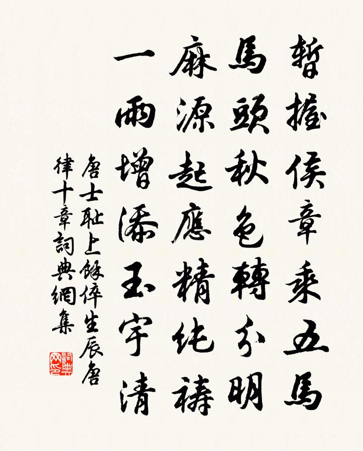 詩詞名句歷史字典書法欣賞書法字典國語詞典說文解字康熙字典古漢語字典標 題 作 者 詩 句 上余倅生辰唐律十章作者:唐士恥 朝代:宋代上余倅生辰唐律十章原文暫握侯章乘五馬,馬頭秋色轉分明。麻源起應精純禱,一雨增添玉宇清。詩詞問答問:上余倅生辰唐律十章的作者是誰?答:唐士恥問:上余倅生辰唐律十章寫於哪個朝代?答:宋代唐士恥上余倅生辰唐律十章書法欣賞上余倅生辰唐律十章書法作品詩詞推薦送管養正長歌王之道〔宋代〕餞別宜有酒,我無一杯潄君口。送行當以贐,我無一物藉我手。與君意氣真相知,君嘗謂予可言詩。獨有詩句堪送十二月奉教作李嶠〔唐代〕玉燭年行盡,銅史漏猶長。池冷凝宵凍,庭寒積曙霜。蘭心未動色,梅館欲含芳。裴回臨歲晚,顧步佇春光。送道州張職方歐陽修〔宋代〕桂籍青衫憶共游,憐君華發始為州。身行南鴈不到處,山與北人相對愁。莫為高才輕遠俗,當令遺老識賢侯。三年鹹淳三年生日口號賈似道〔宋代〕君恩猶使居湖曲,年未為高奈病何。做卻潞公官職了,較來謝事不爭多。浣溪沙(泛舟)毛滂〔宋代〕銀字笙簫小小童。梁州吹過柳橋風。阿誰勸我玉杯空。小醉徑須眠錦瑟,夜歸不用照紗籠。畫船簾卷月明中。和毛秀才江墅幽居好十首穆修〔宋代〕江墅幽居好,名山對九華。疏篁十餘畝,古屋兩三家。碓下雞爭黍,籬根虺逐蛙。水邊閒送目,獨鳥在秋槎。寄黃龍清老三首黃庭堅〔宋代〕風前橄欖星宿落,日下桄榔羽扇開。昭默堂中有相憶,清愁忽遣化人來。題庵壁陸游〔宋代〕俠氣當年蓋五陵,今成粥飯在家僧。身存但倚貧非病,齒落方慚豁可憎。踏月閒穿雙草屩,聽琴橫按一枯藤。年來和魏衍三日二首陳師道〔宋代〕林花女頰紅,春水瓜頭綠。步蹇我三休,來同君一足。苦嗟所歷小,不盡千里目。暮景向昏鴉,歸塗取修竹。和張倅唐英詠梅十四首陳傅良〔宋代〕遲遲可殿後,寂寂可鎮浮。風人第一章,窈窕河之洲。穆如三代英,惟此宜與儔。不然則臞仙,玉簫下秦樓。再過幾先侄齋中方翥〔宋代〕樹連平野濶,深夜易高風。星月迷濛外,乾坤鼓盪中。山窗寒未白,宿炭曉能紅。袍被論詩句,長長與子同。臨潁縣李廌〔宋代〕日永行人漸困,路長飢馬頻嘶。驚起一雙白鷺,背人飛向前溪。清平樂·畫堂晨起李白〔唐代〕畫堂晨起,來報雪花墜。高捲簾櫳看佳瑞,皓色遠迷庭砌。盛氣光引爐煙,素草寒生玉佩。應是天仙狂醉,亂把白宮詞王珪〔唐代〕端午生衣進御床,赭黃羅帕覆金箱。美人捧入南薰殿,玉腕斜封彩縷長。和趙守木犀陳文蔚〔宋代〕花開時節趁柔金,冷露繁霜未許侵。況是天香無欲韻,一樽清賞有知音。歷棗強縣王冕〔元代〕我生值數奇,長年但奔走。風霜苦侵凌,焉得不白首?前日東阿城,齷齪渾雞狗。今朝棗強縣,蹐跼隨人後。淒涼代秦女贈行人劉希夷〔唐代〕鸞鏡曉含春,蛾眉向影嚬。開□衣裳破,那堪粉黛新。春還洛陽道,為憶春階草。楊葉未能攀,梅花待君掃。今朝送胡巨濟宰湘潭樓鑰〔宋代〕君向瀟湘忽語離,江城離思亂雲飛。傳聞楚俗尤凋瘵,勿以秦人視瘠肥。宰縣要尋行志處,監州空有負丞譏。此行句牟巘五〔宋代〕翻手可覆手,曲身成直身。次韻質夫兄使君同年王安石〔宋代〕樓堞相望一日程,春風吹急似搖旌。莫言樂國無愁夢,賴把新詩有故情。客舍五漿非所願,私田三徑會須成。青雲名句推薦敖不可長,欲不可從,志不可滿,樂不可極。戴聖《禮記·曲禮上》 芙蓉金菊斗馨香。天氣欲重陽。晏殊《訴衷情·芙蓉金菊斗馨香》 快意事過非快意,自古敗名因敗事。佚名《增廣賢文·下集》 知而好問,然後能才。荀子《荀子·儒效》 只有天在上,更無山與齊寇準《詠華山》 多少新亭揮淚客,誰夢中原塊土。劉克莊《賀新郎·送陳真州子華》 有鳥鷙立,羽翼張。柳宗元《唐鐃歌鼓吹曲十二首·其四》 去日兒童皆長大,昔年親友半凋零。竇叔向《夏夜宿表兄話舊》 功過不宜少混,混則人懷惰隳之心洪應明《菜根譚·概論》 枯枝無醜葉,涸水吐清泉李白《長歌行》