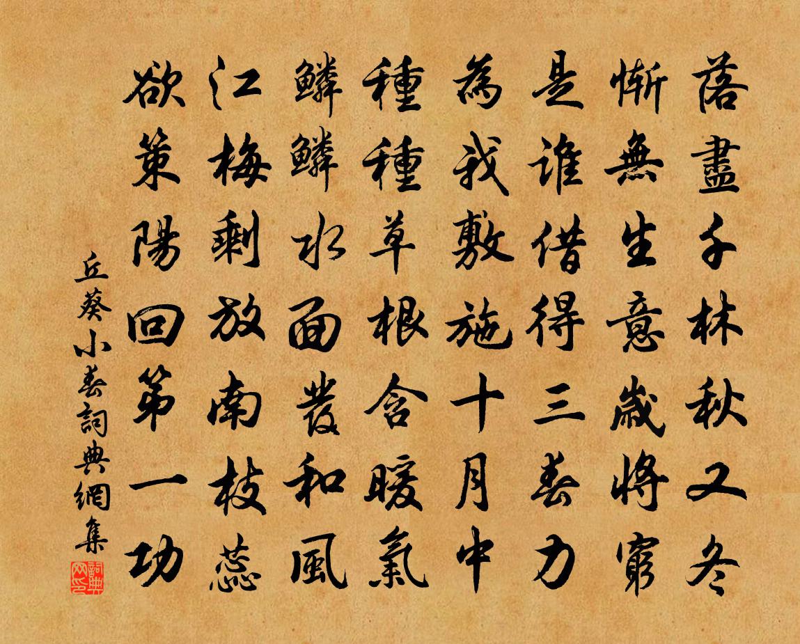 詩詞名句歷史字典書法欣賞書法字典國語詞典說文解字康熙字典古漢語字典標 題 作 者 詩 句 小春作者:丘葵 朝代:宋代小春原文落盡千林秋又冬,慚無生意歲將窮。是誰借得三春力,為我敷施十月中。種種草根含暖氣,鱗鱗水面發和風。江梅剩放南枝蕊,欲策陽回第一功。詩詞問答問:小春的作者是誰?答:丘葵問:小春寫於哪個朝代?答:宋代丘葵小春書法欣賞小春書法作品詩詞推薦初秋夜坐贈吳武陵柳宗元〔唐代〕稍稍雨侵竹,翻翻鵲驚叢。美人隔湘浦,一夕生秋風。積霧杳難極,滄波浩無窮。相思豈雲遠,即席莫與同。若人擬行路難鮑照〔南北朝〕君不見蕣華不終朝。須臾淹冉零落銷。盛年妖艷浮華輩。不久亦當詣冢頭。一去無還期。千秋萬歲無音詞。孤魂煢緣識宋太宗〔宋代〕春長秋風敗黃葉,白髮老人慵把鑷。光景如箭亦如飛,我不聰明賢者說。知近知深知更遠,善緣惡境勿交涉。勿交章安鎮感事孫應時〔宋代〕越嶠東南窮,連山赴滄海。章安古州宅,陵谷諒遷改。前江渺萬頃,風雨魚龍匯。嗟哉地遠絕,仿佛形勢在。憶昨送白糍與囊山老子王邁〔宋代〕東坡以春筍,名為玉版師。我獨謂玉版,正可名白糍。吃筍令人瘦,吃糍充人飢。慧眼曰不然,不如飲水肥。大觀祭風師六首佚名〔宋代〕清酤洋洋,虔恭洋茲。條鬯敷宣,神用歆之。尊疊靜嘉,金奏諧熙。於皇肆祀,休我群黎。挽包顒叟陳傅良〔宋代〕翁子看時輩,平生不妄賢。獨於公有誄,誰恐世無傳。他日須深刻,吾詩可附聯。草黃松柏禿,名與石巋然。送李端耿湋〔唐代〕世上許劉楨,洋洋風雅聲。客來空改歲,歸去未成名。遠近天初暮,關河雪半晴。空懷諫書在,回首戀承明。雪後陳師道〔宋代〕送往開新雪又晴,故留臘白待春青。稍回杉色伸梅怨,並得朝看與夜聽。已覺庭泥生鳥跡,遽修田事帶朝星。暮年和劉仲廉新年春望二首馮時行〔宋代〕年於鬢髮最相干,又作新正一再看。懶共燕泥烘午霽,吟隨鶯樹澀朝寒。餘生已分千人後,燥吻猶須百榼乾。愁絕醉落魄·離京口作蘇軾〔宋代〕輕雲微月,二更酒醒船初發。孤城回望蒼煙合。記得歌時,不記歸時節。巾偏扇墜藤床滑,覺來幽夢無人說。此生石榴鄭獬〔宋代〕高枝重欲折,霜老裂丹膚。試剖紫金碗,滿堆紅玉珠。根雖傳大夏,種必近仙都。題作江南信,人應賤橘奴。書懷陸游〔宋代〕蝸廬自稱野人居,三尺明窗已有餘。從此要當常省事,時時小葺欲何須?弟茝飲至醉醉歸蹶道中荊棘中陳著〔宋代〕聖俞小飲亦百杯,高叉兩手無欹頹。曼卿登樓終日飲,端坐人謂神仙來。二賢佳語三百載,磊磊亦有梅山在。有人頌古三十三首釋師觀〔宋代〕紅日杲杲,切忌尋討。拈得便用,無非是寶。鄭州梨,青州棗,大抵還他出處好。冬日雜書六首張耒〔宋代〕短景冰霜地,人稀豹虎村。風連諸壑動,日帶亂山昏。浩蕩空回首,蕭條獨掩門。東周舊耆老,留滯飽知聞。李少卿挽記張耒〔宋代〕青雲舊馳譽,白髮早辭榮。談笑惟詩酒,交遊盡老成。支離病中見,瀟灑舊時情。已矣不可問,九原松柏聲。南郊大禮詩王禹偁〔宋代〕彩雲隨步下乾元,雨露新恩洽普天。四輔首迎丹鳳詔,六師齊散廩犧錢。熙熙品物瞻堯日,習習薰風動舜弦。商洛偶書邵雍〔宋代〕妻強夫殃,奴強主殃,臣強君殃。尾大於身,不堅於霜。辯之不早,國破家亡。菩薩蠻(春日西湖用吳監簿韻)楊冠卿〔宋代〕春山愁對修眉綠,春衫誰為裁冰縠。日暮倚闌乾,不禁菸霧寒。湖邊歸去路,猶記傳觴處。往事等空花,客心驚歲名句推薦一生傲岸苦不諧,恩疏媒勞志多乖。李白《答王十二寒夜獨酌有懷》 客里相逢,籬角黃昏,無言自倚修竹。姜夔《暗香疏影》 大雪壓青松,青松挺且直。陳毅《青松》 昔有佳人公孫氏,一舞劍器動四方。杜甫《觀公孫大娘弟子舞劍器行》 征人去日殷勤囑,歸雁來時數附書。王維《伊州歌》 白日淪西河,素月出東嶺。陶淵明《雜詩十二首·其二》 學者不患才之不贍,而患志之不立。徐幹《中論·上卷·治學》 上言加餐食,下言長相憶。佚名《飲馬長城窟行》 兵不完利,與無操者同實管仲《管子·參患》 若待得君來向此,花前對酒不忍觸。蘇軾《賀新郎·夏景》