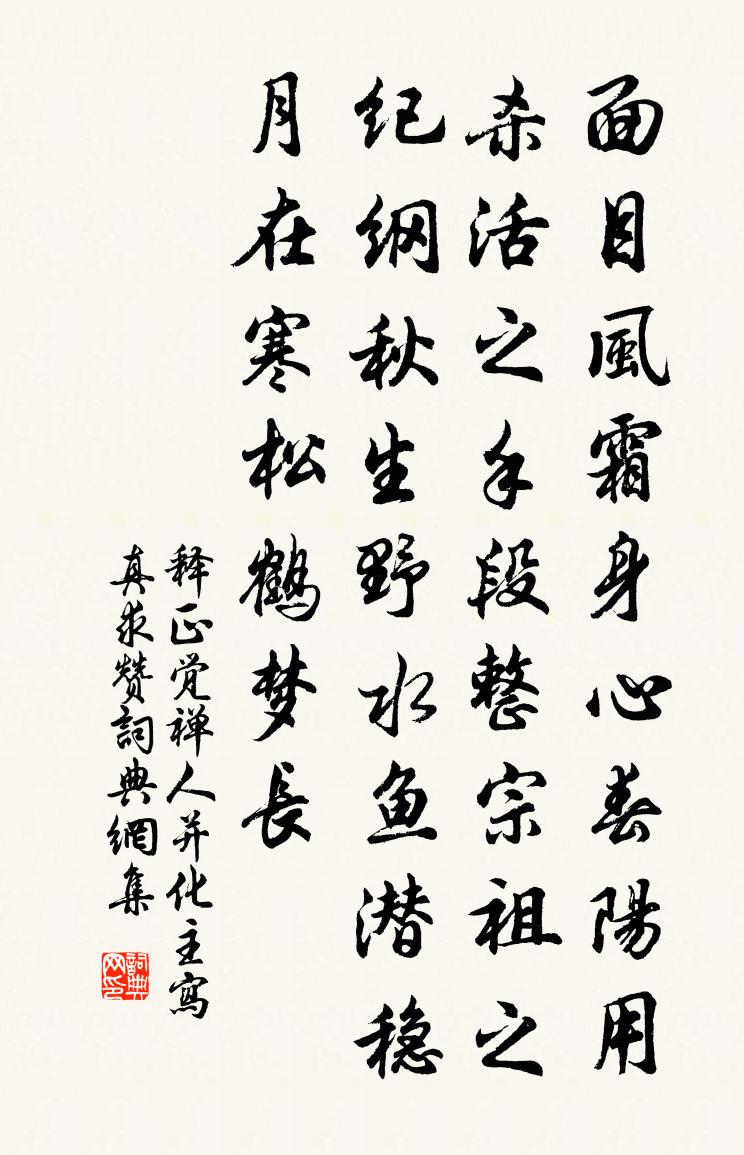 詩詞名句歷史字典書法欣賞書法字典國語詞典說文解字康熙字典古漢語字典標 題 作 者 詩 句 禪人並化主寫真求贊作者:釋正覺 朝代:宋代禪人並化主寫真求贊原文面目風霜,身心春陽。用殺活之手段,整宗祖之紀綱。秋生野水魚潛穩,月在寒松鶴夢長。詩詞問答問:禪人並化主寫真求贊的作者是誰?答:釋正覺問:禪人並化主寫真求贊寫於哪個朝代?答:宋代釋正覺禪人並化主寫真求贊書法欣賞禪人並化主寫真求贊書法作品詩詞推薦盧山五詠 盧敖洞蘇軾〔宋代〕上界足官府,飛升亦何益。還在此山中,相逢不相識。無夢令馬鈺〔元代〕物外茅齋映竹。一飽殘羹冷粥。樂亦在其中,記得風仙叮囑。叮囑。叮囑。保養靈明性燭。送韓奉禮梅堯臣〔宋代〕將欲侍親去,獨要予贈言。世風還自有,文體不須論。稍愛春波急,微生野岸根。舟行寧覺遠,幾日到都門。斷梅三首曹勛〔宋代〕積雨連宵氣象清,曉來日色頓分明。更無一片閒雲采,萬里青天萬里晴。放翁有五更讀書示子詩予亦次韻宋慶之〔宋代〕秋風蟋蟀床下鳴,茅茨耿耿秋燈明。老夫掩捲髮深喟,起視河漢初參橫。世人飲食幾知味,眼底古今復涇渭。藩籬寄題向伯恭薌林李處權〔宋代〕薌林近知名,悵望江幹路。無因從之游,夢魂幾飛去。侍郎天下士,器識廊廟具。詩似王右丞,文如韓吏部。勇退洪澤館壁見故禮部尚書題詩皇甫冉〔唐代〕底事洪澤壁,空留黃絹詞。年年淮水上,行客不勝悲。七夕感懷用尤悔庵原韻陳維崧〔清代〕鵲又填橋矣。滿長安、千門砧杵,四圍雲水。長記常年茅屋下,佳節團圞能幾!有和病、雲鬟雪涕。縱病倘然人尚石塘項安世〔宋代〕市夾河漘好,橋當浦口雄。濕雲低障日,斜雨急收風。石岸蜿蜒去,松江杳靄中。知幾吾晚矣,慚汗過垂虹。贈敦復張耒〔宋代〕敦復想為詩,目見無全牛。天工忌其才,小邑使拘囚。漫塗以塵埃,訟訊群啾啾。尚於紛紜中,逸興時奔流。不知試筆偶書二首曹勛〔宋代〕家住天台水石村,四圍都是給孤園。有時桐柏庵中去,歸下層巒夕照昏。石州慢張野〔元代〕紅雨西園,香雪東風,還又春暮。當時雙漿悠悠,送客綠波南浦。陽關*,至今隱隱餘音,眼前渾是分攜處。此恨頌古二十五首釋崇岳〔宋代〕莫莫,拈出一條斷貫索。任從我佛及眾生,撩天鼻孔都穿卻。和趙章泉見寄二首劉宰〔宋代〕平生錯里識曹劉,眼底誰為第一流。錦里正慶推老杜,魯人亦解說東丘。騎驢頗忘推敲否,上馬還能矍鑠不。此去溫陵吳氏瓠齋余謙一〔宋代〕詩記斷壺秋半,易占碩果春先。粒許中間種子,乾坤生意無邊。送謝叔光姜特立〔宋代〕青陽迫殘臘,寒色滿江乾。我有採薪疾,君方行路難。來無十日款,去作一程寬。翌晚解鞍罷,親庭足笑歡。吳王夜宴圖真山民〔宋代〕銀漏迢迢夜未晨光,管弦聲里綺羅春。飲闌方擁名娃醉,豈料稽山正臥薪。客來驚睡仇遠〔宋代〕長晝清和時,惟有睡鄉美。宰予邊孝先,毋乃今我是。門外有客來,推枕矍然起。請啜一杯茶,萬事且不理。上南行十二首方回〔宋代〕我不上南山,垂近四十載。山中花瓢翁,尚與山俱在。據高瞰人世,昔田今為海。道傍魏公亭,柱化礎亦敗。和洪龜父歲暮韻舒邦佐〔宋代〕兩鬢點秋霜,黑白交相互。倒指數行年,如日斜歲暮。始汙千佛經,頗嘆儒冠誤。夜聲喧爆竹,曉炬驚鴉樹。又是名句推薦法令至行,公平無私劉向《戰國策·秦一·衛鞅亡魏入秦》 誤落塵網中,一去三十年。陶淵明《歸園田居·其一》 孤燈不明思欲絕,卷帷望月空長嘆。美人如花隔雲端!李白《長相思·其一》 銀鞍照白馬,颯沓如流星。李白《俠客行》 野鴉無意緒,鳴噪自紛紛。杜甫《孤雁 / 後飛雁》 秋夜訪秋士,先聞水上音。袁枚《夜過借園見主人坐月下吹笛》 烏絲闌紙嬌紅篆,歷歷春星。納蘭性德《紅窗月·燕歸花謝》 相見易得好,久住難為人。佚名《增廣賢文·上集》 如切如磋,如琢如磨。佚名《淇奧》 誰謂傷心畫不成,畫人心逐世人情。韋莊《金陵圖》