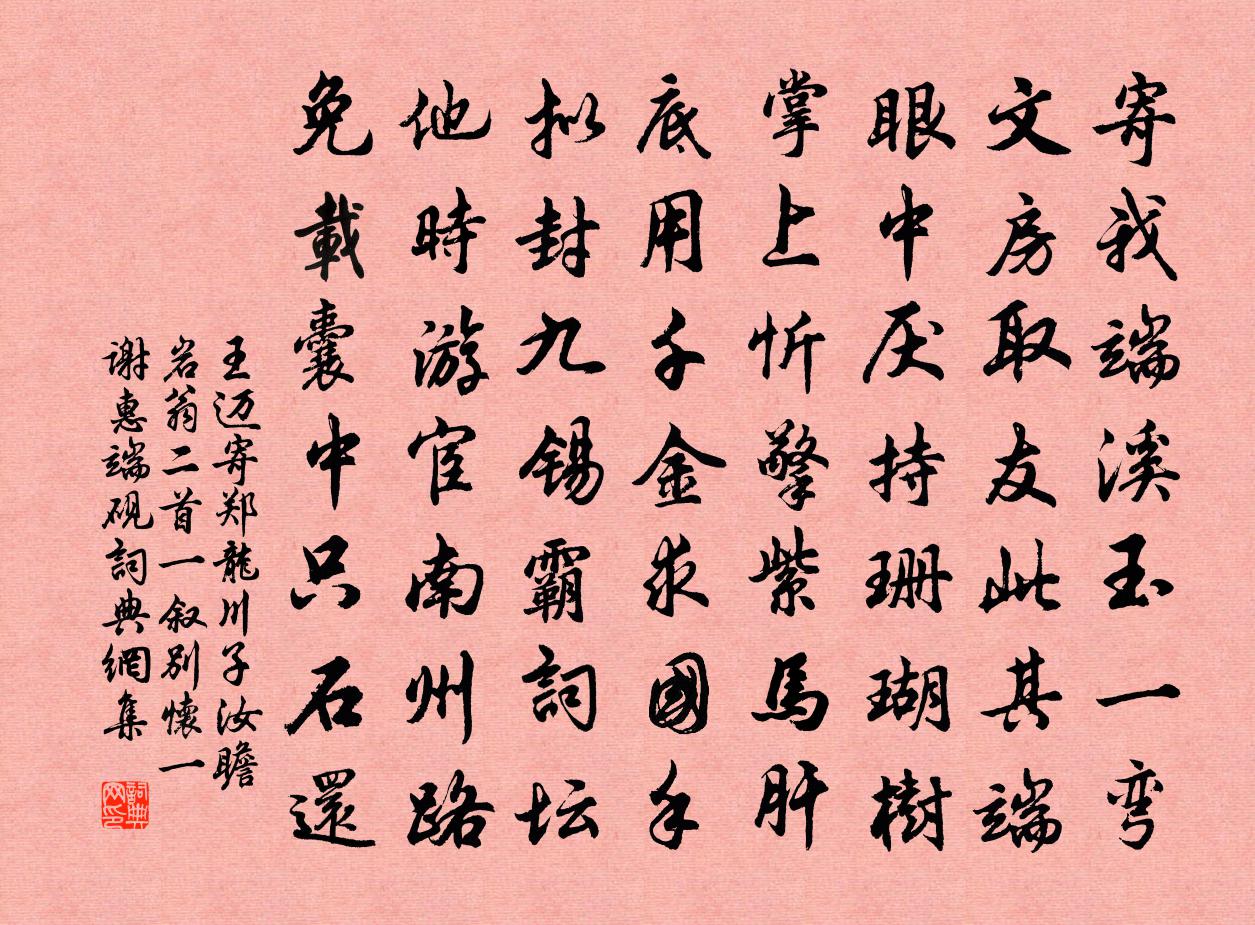 詩詞名句歷史字典書法欣賞書法字典國語詞典說文解字康熙字典古漢語字典標 題 作 者 詩 句 寄鄭龍川子汝瞻岩翁二首一敘別懷一謝惠端硯作者:王邁 朝代:宋代原文寄我端溪玉一彎,文房取友此其端。眼中厭持珊瑚樹,掌上忻擎紫馬肝。底用千金求國手,擬封九錫霸詞壇。他時遊宦南州路,免載囊中只石還。詩詞問答問:《寄鄭龍川子汝瞻岩翁二首一敘別懷一謝惠端硯》的作者是誰?答:王邁問:該詩寫於哪個朝代?答:宋代書法欣賞寄鄭龍川子汝瞻岩翁二首一敘別懷一謝惠端硯書法作品詩詞推薦恭和御製賜太師致仕文彥博五言六韻詩一首蘇頌〔宋代〕曉日清明霽,華林物色新。詔頒慈惠宴,恩厚老成人。袞冕三川客,杯觴四府臣。獻酬同飽德,愷樂盡含醇。帝惜頌古十首釋法薰〔宋代〕無賓主話意深深,流落叢林古到今。火冷灰寒口掛壁,衲僧凍死不如心。酬裴十七功曹巡府西驛途中見寄韓愈〔唐代〕相公罷論道,聿至活東人。御史坐言事,作吏府中塵。遂令河南治,今古無儔倫。四海日富庶,道途隘蹄輪。府西客夜不寐四首陳造〔宋代〕飛騰志意老來休,卻聽雞聲吟掉頭。催雪憶梅還得句,到家準擬阿儒求。句何麟〔宋代〕明朝一棹夷陵過,始覺吳天楚地寬。念奴嬌(和王聖俞)侯置〔宋代〕滄浪萬頃,厭塵纓、手掬清流頻洗。落日孤雲煙渚淨,鷗沒澄波心裡。一舸橫秋,兩橈開浪,霜竹醒煩耳。蕭蕭風隱者胡仲弓〔宋代〕老去絕塵緣,人疑行地仙。釜中惟煮石,囊里不儲錢。寄跡茅三加隨身詩一編。雲山深處住,與鶴作忘年。秋日山居好十首舒岳祥〔宋代〕秋日山居好,重陽庶物穰。剖菱紅綻白,剝栗紫含章。黃雀綿披脊,霜狸玉截肪。登高惟小圃,何必上重岡。壽王蘇州張嵲〔宋代〕維昔高堂講射蓬,瑞雪吹不散薰風。十分正滿冰輪桂,一葉將飛露井桐。元老三朝尊相閥,余休幾世積陰功。光芒初冬有感陸游〔宋代〕峨冠本願致唐虞,白首那知墮腐儒。碌碌不成千載事,駸駸又見一年徂。無僧解輟齋廚米,有吏頻徵瘦地租。要信釣月樓王南美〔宋代〕居士作層樓,不愛風花雪。待得野雲收,只釣溪邊月。李陵別蘇武劉灣〔唐代〕漢武愛邊功,李陵提步卒。轉戰單于庭,身隨漢軍沒。李陵不愛死,心存歸漢闕。誓欲還國恩,不為匈奴屈。身辱謝世詩二首吳潛〔宋代〕邊馬南來動北風,屢陳長策矢孤忠。群豺橫暴嘉謀遏,儀鳳高飛事業空。愁恨暗消榕樹綠,寸心漫擬荔枝紅。欲知友生攜修睦上人詩見訪李鹹用〔唐代〕雪中敲竹戶,袖出岳僧詩。語盡景皆活,吟闌角獨吹。意如將俗背,業必少人知。共約冰銷日,雲邊訪所思。秋日送客梁山道中晁公溯〔宋代〕白露下木末,寒蜩抱枝鳴。道帝幾官樹,稍稍棲烏驚。不知何為爾,蕭瑟來秋聲。遙山斂暝色,涼月含空明。吾其暮春書事姚合〔唐代〕窮巷少芳菲,蒼苔一徑微。酒醒聞客別,年長送春歸。宿願眠雲嶠,浮名系鎖闈。未因丞相庇,難得脫朝衣。題黃鶴樓石照呂岩〔唐代〕黃鶴樓前吹笛時,白蘋紅蓼滿江湄。衷 * 訴誰能會,惟有清風明月知。行住坐臥三十二頌釋印肅〔宋代〕引領搬徒訪萬山,深明下手處艱難。圓成滿目蓮宮現,風鐸聲清意自閒。柯敬仲墨竹李東陽〔明代〕莫將畫竹論難易,剛道繁難簡更難。君看蕭蕭只數葉,滿堂風雨不勝寒。謝朱郎中張埴〔宋代〕春風六轡絲,光華塞樊川。川上此何日,所向生奇妍。金山萬丈高,但見兀在前。白頭分墮落,剨叫鬼擘然。青黃名句推薦小時不識月,呼作白玉盤。李白《古朗月行》 湛湛長江去,冥冥細雨來。杜甫《梅雨》 同天下之利者,則得天下;擅天下之利者,則失天下。姜子牙《六韜·文韜·文師》 酹酒蒼茫,倚歌平遠,亭上玉虹腰冷。吳文英《十二郎·垂虹橋》 銀鞍照白馬,颯沓如流星。李白《俠客行》 鼓吹助清賞,鴻雁起汀洲。蘇轍《水調歌頭·徐州中秋》 晚風庭院落梅初。淡雲來往月疏疏。李清照《浣溪沙·髻子傷春慵更梳》 吏不治則亂,農事緩則貧。墨子《墨子·39章 非儒(下)》 誰家玉笛暗飛聲,散入春風滿洛城。李白《春夜洛城聞笛 / 春夜洛陽城聞笛》 因其國家去其無用之費,足以倍之。墨子《墨子·20章 節用(上)》