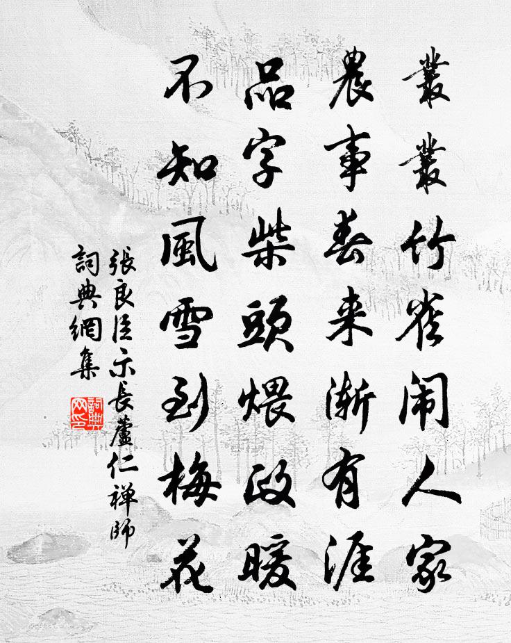 詩詞名句歷史字典書法欣賞書法字典國語詞典說文解字康熙字典古漢語字典標 題 作 者 詩 句 示長蘆仁禪師作者:張良臣 朝代:宋代示長蘆仁禪師原文叢叢竹雀鬧人家,農事春來漸有涯。品字柴頭煨政暖,不知風雪到梅花。詩詞問答問:示長蘆仁禪師的作者是誰?答:張良臣問:示長蘆仁禪師寫於哪個朝代?答:宋代張良臣示長蘆仁禪師書法欣賞示長蘆仁禪師書法作品詩詞推薦過玉林魏慶芝〔宋代〕一步離家是出塵,幾重山色幾重雲。沙溪清淺橋邊路,折得梅花又見君。次韻王才元少師見贈李彌遜〔宋代〕清晝高軒過,岩高得共攀。蝦須深梵閣,豹尾靜塵軍,詞吐三江水,胸開九夢山。杯行不知夜,留月伴公還。留別王元治師中譚純益三首胡寅〔宋代〕欲步夷途盍近思,行尋捷徑卻成遲。大弨不必穿楊葉,古樂何曾唱竹枝。須信孔門無用賦,也知高叟漫為詩。功名江北梅開殊晚和林實之別駕韻孫應時〔宋代〕清詩吟賞慰花神,喚起風情寂寞濱。正是參軍舊題處,須公還作一家春。南嶺路朱慶餘〔唐代〕越嶺向南風景異,人人傳說到京城。經冬來往不踏雪,盡在刺桐花下行。登封道中三絕 轘轅道蘇轍〔宋代〕青山欲上疑無路,澗道相縈九十盤。東望嵩高分草木,回瞻原隰涌波瀾。頌古三十三首釋師觀〔宋代〕以手策起眉毛,千聖從來不識。一會靈山儼然,說甚今朝昨日。奉和詠弓楊師道〔唐代〕霜重麟膠勁,風高月影圓。烏飛隨帝輦,雁落逐鳴弦。戲來戎蔡簇成芍藥樓鑰〔宋代〕回首向來婪尾春,橫風吹盡已成塵。戎葵簇就誰嘗巧,紅藥當前太逼真。觀洧贈人迷冶子,翻階得句誤詞臣。園丁游南園次傍花隨柳句熊禾〔宋代〕憂世心衰且樂天,不妨飛詠此雲川。天高地下有千載,物換人非無百年。和令狐相公玩白菊劉禹錫〔唐代〕家家菊盡黃,梁國獨如霜。瑩靜真琪樹,分明對玉堂。仙人披雪氅, * 不紅妝。粉蝶來難見, * 拂更香。向風寄趙眉翁二首葉紹翁〔宋代〕君王未肯賜西湖,鷗鷺叢中借地居。憔悴風姿今釣叟,痴心猶望故人書。次韻蔡叔清六言二首其趙蕃〔宋代〕陶潛必遺俗患,侯喜新有詩聲。容我深藏蹇步,看君大展修程。先天易吟三十首方回〔宋代〕乾坤坎離位,元會運世篇。三百六十歲,才似一周年。早秋夜作韋莊〔唐代〕翠簟初清暑半銷,撇簾松韻送輕飆。莎庭露永琴書潤,山郭月明砧杵遙。傍砌綠苔鳴蟋蟀,繞檐紅樹織蠨蛸。不須翠雲山張無觀〔宋代〕未了人間朱墨緣,強顏荒邑又三年。填胸眯目皆塵土,直到峰頭始豁然。婦女之孝二十首秋鬍子妻林同〔宋代〕妾面羞君面,君心異妾心。那能不念母,卻遺別人金。為盧天驥作吳則禮〔宋代〕撩我千岩固好在,未論應接徒惋欷。湖山飽窺使者節,魚鳥不避霜台威。坐罷清言良{學子換且}{學子換且},揚道中感事兼簡史館丁學士王禹偁〔宋代〕淮邊為郡再相逢,又得同途赴九重。顧我尚騎天廄馬,共君遙想鼎湖龍。賈生北望朝文帝,白傅何期哭憲宗。攜手送曾文卿入京楊萬里〔宋代〕如君大似陸雲龍,一歕詞場萬馬空。文透退之關捩子,騷傳正則祖家風。三年拄笏南雲里,兩手投竿西日中。壁水名句推薦日夕北風緊,寒林噤暮鴉。大須《暮雪》 以反求諸己為要法,以言人不善為至戒。胡宏《知言·文王》 雨前初見花間蕊,雨後兼無葉里花。王駕《雨晴》 幽蘭旋老,杜若還生,水鄉尚寄旅。吳文英《鶯啼序·春晚感懷》 曉雞驚樹雪,寒鶩守冰池。李商隱《幽居冬暮》 不是誠齋無月,隔一林修竹。楊萬里《好事近·七月十三日夜登萬花川谷望月作》 天子臨軒賜侯印,將軍佩出明光宮。王維《少年行四首》 處事要代人作想,讀書須切己用功。王永彬《圍爐夜話·第五則》 看蓬門秋草,年年破巷,疏窗細雨,夜夜孤燈。鄭燮《沁園春·恨》 報國無門空自怨,濟時有策從誰吐。吳潛《滿江紅·送李御帶珙》