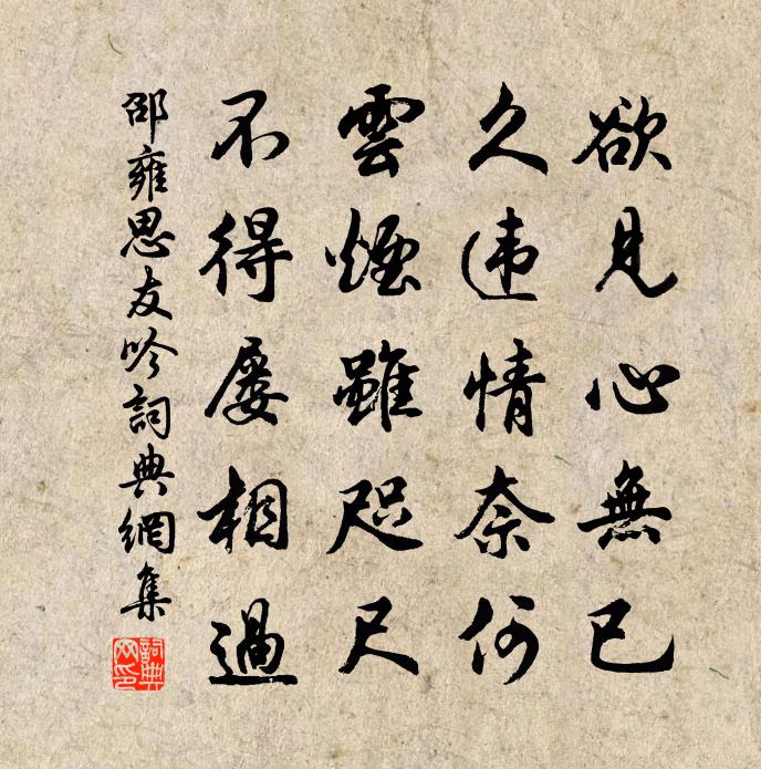 詩詞名句歷史字典書法欣賞書法字典國語詞典說文解字康熙字典古漢語字典標 題 作 者 詩 句 思友吟作者:邵雍 朝代:宋代思友吟原文欲見心無已,久違情奈何。雲煙雖咫尺,不得屢相過。詩詞問答問:思友吟的作者是誰?答:邵雍問:思友吟寫於哪個朝代?答:宋代邵雍思友吟書法欣賞思友吟書法作品詩詞推薦三月六日趙蕃〔宋代〕自把殘書洗睡昏,欲求甚解與誰論。乍然好鳥聞深樾,忽爾荒雞聽遠村。南鄉子張炎〔宋代〕野色一橋分。活水流雲直到門。落葉堆籬從不掃,開尊。醉里教兒誦楚文。隔斷馬蹄痕。商鼎熏花獨自聞。吟思更集芳園胡仲弓〔宋代〕園丁嚴鎖鑰,不許俗人看。梅落黃金彈,荷開碧玉盤。小舟維柳外,青磬出林端。猿鶴不相識,行吟獨倚欄。次韻答孫平叔感春之作舒岳祥〔宋代〕江湖處處尋春去,每到芳時醉不歸。簾幙生香花欲語,池塘細雨燕交飛。閒思此事真難得,或恐他生願不違。欲作南歌子·岸柳拖煙綠張泌〔五代〕岸柳拖煙綠,庭花照日紅。數聲蜀魄入簾櫳。驚斷碧窗殘夢,畫屏空。摸魚兒(送竇制乾赴漕趁班)李曾伯〔宋代〕趁西風、且登黃鶴,揮毫先奏秋賦。燕山桂種清芬在。人物翩翩如許。堪羨處。長安近、蟾宮相繼金閨步。佳哉盛城西訪友人別墅雍陶〔唐代〕澧水橋西小路斜,日高猶未到君家。村園門巷多相似,處處春風枳殼花。書與士瞻上人十首仇遠〔宋代〕野鶴清高六翮輕,孤雲萬里去冥冥。漢科合應茂才選,唐士曾書遺教經。好趁江南諸老在,盡看薊北眾山青。錦衣同二三子步溪上李處權〔宋代〕已恨春風過,猶欣夏日長。鶯喧桑已葚,燕乳麥初芒。白髮悲如許,青鞋樂未央。歸來安客舍,更有北窗涼。柴門釋文珦〔宋代〕柴門雖設不曾關,時有忘機客往還。風送釣舟來北渚,雨催樵子下西山。生前富貴何勞美,身後聲名亦是閒。萬慮金剛隨機無盡頌離色離相分第二十釋印肅〔宋代〕榮辱空中響,迷真逐妄想。觀其所由來,盡屬虛撈攘。正樂府十篇哀隴民皮日休〔唐代〕隴山千萬仞,鸚鵡巢其巔。窮危又極嶮,其山猶不全。蚩蚩隴之民,懸度如登天。空中覘其巢,墮者爭紛然。百禽題陳生學達觀堂二首劉克莊〔宋代〕華堂需被記,老筆豈能工。尺鷃}飛籬下,醯雞舞甕中。形骸均土木,利慾等苓通。獨學知聞少,煩君為擊蒙。乖慵鄭谷〔唐代〕乖慵居竹里,涼冷臥池東。一霎芰荷雨,幾回簾幕風。遠僧來扣寂,小吏笑書空。衰鬢霜供白,愁顏酒借紅。扇輕謁告得歸拜呈內機知府郎官五首程公許〔宋代〕膏一忍待曉鍾撞,浩蕩歸情不可降。一笑朔風寒掠面,緩吟疏影蘸清江。余以檄出機宜陳伯英先往西津候別舟行風作才曾豐〔宋代〕我出公追送,公賢我急親。文拘猶得說,風阻不由人。一廳灑為崇,時乎酒作春。相為酬酢禮,方象是嘉賓。山中五詠山館皇甫冉〔唐代〕山館長寂寂,閒雲朝夕來。空庭復何有,落日照青苔。秋夕寄友人羅鄴〔唐代〕秋夕蒼茫一雁過,西風白露滿宮莎。昨來京洛逢歸客,猶說軒車未渡河。莫把少年空倚賴,須知孤立易蹉跎。想君離平江鄭剛中〔宋代〕橋外客舟蓮夜發,飽吹十幅風蒲滑。天明無處覓高城,但見吳江波浪闊。閒中真山民〔宋代〕敢咎章縫解誤人,甘於閒處著閒身。腹中書在溫仍熟,夢裡詩成記不真。引鶴徐行三逕曉,約梅同醉一壺春。今朝名句推薦城小賊不屠,人貧傷可憐元結《賊退示官吏》 惡人自有惡人磨。施耐庵《水滸傳·第三十回》 興天下之利,除天下之害。墨子《墨子·12章 尚同(中)》 泛菊杯深,吹梅角遠,同在京城。劉過《柳梢青·送盧梅坡》 竹疏虛檻靜,松密醮壇陰。張泌《女冠子·露花菸草》 瓊樓玉宇。分明不受人間暑。尋常豈是無三五。郭應祥《醉落魄·丙寅中秋》 夫孝,天之經也,地之義也,民之行也。孔子及其弟子《孝經·三才》 勿言草卉賤,幸宅天池中沈約《詠新荷應詔》 仙苑春濃,小桃開,枝枝已堪攀折。阮逸女《花心動·春詞》 落月滿屋樑,猶疑照顏色。杜甫《夢李白二首·其一》