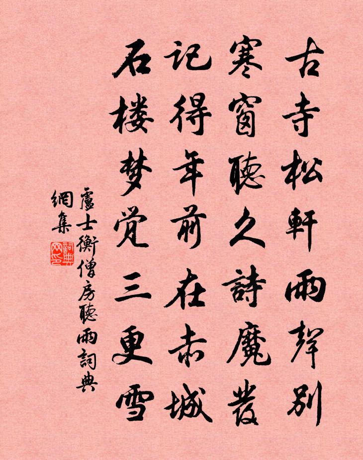 詩詞名句歷史字典書法欣賞書法字典國語詞典說文解字康熙字典古漢語字典標 題 作 者 詩 句 僧房聽雨作者:盧士衡 朝代:唐代僧房聽雨原文古寺松軒雨聲別,寒窗聽久詩魔發。記得年前在赤城,石樓夢覺三更雪。詩詞問答問:僧房聽雨的作者是誰?答:盧士衡問:僧房聽雨寫於哪個朝代?答:唐代問:僧房聽雨是什麼體裁?答:七絕盧士衡僧房聽雨書法欣賞僧房聽雨書法作品注釋全唐詩:卷737-16詩詞推薦慈濟院雙楠文同〔宋代〕雙楠高聳綠氤氳,密葉長柯蔭四鄰。佛現寶幢經幾劫,天開雲帳待何人。護持必有諸賢聖,觸犯寧無惡鬼神。付囑和豎伯梅六題一孤芳二山間三雪中四水邊五月胡寅〔宋代〕意態沖寒不自持,桂華相伴亦多時。未須細睹青春面,縣看扶疎寫影宜。秋夜對月王之道〔宋代〕青廓經新雨,扶疏桂影秋。夜涼山色靜,風細水光浮。坐久因忘寐,詩成得散愁。願言乘此興,同賦庾公樓。論語絕句一百首張九成〔宋代〕須知有慾不為剛,血氣乘之反類狂。所以孟軻言直養,要令無助亦無忘。官成武主簿作五首王禹偁〔宋代〕釋褐來成武,經春自愧多。晨炊猶接續,時雨未滂沱。拂榻驚巢燕,陳書起蟄娥。惠民無政術,尸祿竟如何。對雨 其三王冕〔元代〕百草雨中死,群烏天際飛。風塵時變滅,世事日乖違。弘景掛冠去,少陵徒步歸。丁寧劍歌叟,得酒且忘機。次費潔堂韻馬廷鸞〔宋代〕誰翻溟渤倒天瓢,大地山河等呴漂。九陌揚塵京路暗,一聲鳴鵙楚魂招。歸心猛折湖邊柳,活計頻尋江上苗。回首滿庭芳馬鈺〔元代〕伊予同里。自來交契。各貪浮名浮利。總悟無常,物物般般捐棄。予先別離寧海,又繼而、賢來關里。願同志,更句京鏜〔宋代〕八千里隔東西境,十二時分晝夜泉。湖邊春色十分深。宮詞王珪〔唐代〕侍輦歸來步玉階,試穿金縷鳳頭鞋。階前摘得宜男草,笑插黃金十二釵。和董令升喜雨用前韻王之道〔宋代〕夜聽檐聲翻急雨,想見膏潤均率土。先生休戚共斯民,憂在惔焚非憚暑。人情類被飢所移,我爾相望自甘苦。寧從垂虹亭倪瓚〔元代〕虛閣春城外,澄湖莫雨邊。飛雲忽入戶,去鳥欲窮天。林屋青西映,吳松碧左連。登臨感時物,快吸酒如川。己卯十二月二十日感事二首張耒〔宋代〕蹉跎流落已華顛,又見荊湖一歲遷。人怯苦寒愁日短,天收殘臘放新年。園林寂歷飄梅後,里巷經過爆竹前。自料折楊柳五首曹勛〔宋代〕折楊柳,灞橋西,去日同君上柳堤。聞道將軍得天馬,歸時芳草正萋萋。和牛相公題姑蘇所寄太湖石兼寄李蘇州劉禹錫〔唐代〕震澤生奇石,沉潛得地靈。初辭水府出,猶帶龍宮腥。發自江湖國,來榮卿相庭。從風夏雲勢,上漢古查形。拂拭金字經·樂閒張可久〔元代〕百年渾似醉,滿懷都是春,高臥東山一片雲。嗔,是非拂面塵。消磨盡,古今無限人。過漢江楊時〔宋代〕西極鰲足折,東南地維傾。眾流競趨下,洶洶歸滄滄。誰能跨明河,挽此經天行。世難乘槎翁,此意終冥冥。退宮妓廖融〔唐代〕神仙風格本難儔,曾從前皇翠輦游。紅躑躅繁金殿暖,碧芙蓉笑水宮秋。寶箏鈿剝陰塵覆,錦帳香消畫燭幽。一旦下第送宋秀才游岐下、楊秀才還江東許渾〔唐代〕年來不自得,一望幾傷心。風轉蕙蘭色,月移松桂陰。馬隨邊草遠,帆落海雲深。明旦各分首,更聽梁甫吟。題長安薛員外水閣姚合〔唐代〕亭亭新閣成,風景益鮮明。石盡太湖色,水多湘渚聲。翠筠和粉長,零露逐荷傾。時倚高窗望,幽尋小逕行。林疏名句推薦試玉要燒三日滿,辨材須待七年期。白居易《放言五首·其三》 聽君一席話,勝讀十年書。佚名《增廣賢文·上集》 粉骨碎身全不怕,要留清白在人間。于謙《石灰吟》 留春不住,費盡鶯兒語。王安國《清平樂·春晚》 一日不思量,也攢眉千度。柳永《晝夜樂·洞房記得初相遇》 民力盡於無用,財寶虛於待客。墨子《墨子·05章 七患》 渺萬裡層雲,千山暮雪,隻影向誰去?元好問《摸魚兒·雁丘詞 / 邁陂塘》 我有所念人,隔在遠遠鄉。白居易《夜雨》 孤煙村際起,歸雁天邊去。孟浩然《南歸阻雪》 春晚綠野秀,岩高白雲屯。謝靈運《入彭蠡湖口》