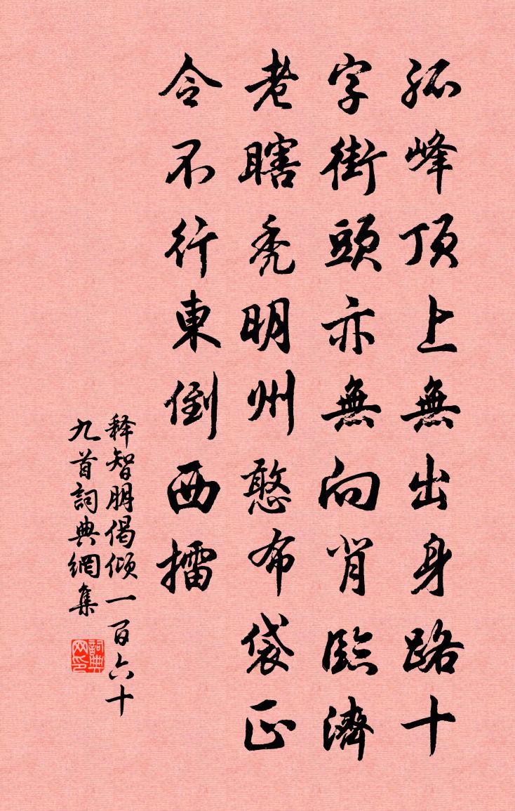 詩詞名句歷史字典書法欣賞書法字典國語詞典說文解字康熙字典古漢語字典標 題 作 者 詩 句 偈傾一百六十九首作者:釋智朋 朝代:宋代偈傾一百六十九首原文孤峰頂上無出身路,十字街頭亦無向背。臨濟老瞎禿,明州憨布袋。正令不行,東倒西擂。詩詞問答問:偈傾一百六十九首的作者是誰?答:釋智朋問:偈傾一百六十九首寫於哪個朝代?答:宋代釋智朋偈傾一百六十九首書法欣賞偈傾一百六十九首書法作品詩詞推薦園中雜書四首張鎡〔宋代〕因病經旬不賦詩,無詩病思轉難支。今朝詩名未成了,已覺全無病可醫。夜宿倪庵坐雨二首陳著〔宋代〕連朝雲靄靄,一夜雨颼颼。漲霧黑天曉,洗山黃澗流。潤深麻長骨,濕重麥垂頭。春水可農事,只愁兵未休。使君有詩複次韻陳造〔宋代〕詩播樂職聞子淵,貴耳底用泥古先。吾宗使君當世賢,援今輩古敢間然。祖武孫謀有源水,功名濟美方未已。即今有客來從陽羨聞元績離家已月余由崑山過臨安仲並〔宋代〕風露侵人曷往哉,白雲飛處棹徘徊。平時識面盡經過,莫為茅檐偏不來。西瓜園范成大〔宋代〕碧蔓凌霜臥軟沙,年來處處食西瓜。形模濩落淡如水,未可蒲萄苜蓿夸。自春來數夢至閬中蒼溪驛五月十四日又夢作兩陸游〔宋代〕騎驢夜到蒼溪驛,正是猿啼月落時。三十五年如電掣,敗牆誰護舊題詩?出峽張嵲〔宋代〕牽舟已出峽,何旦復當還。蒲溪應漸近,已見宋平山。游廬山山陽七詠 三峽石橋蘇轍〔宋代〕三峽波濤飽溯沿,過橋雷電記當年。江聲仿佛瞿唐口,石角參差灩澦前。應有夜猿啼古木,已將秋葉作歸船。老僧和孫節推寄羅發運蘇頌〔宋代〕一瓢賢巷僻如山,十部文移日滿前。輟得間時常命駕,和來新什已盈編。交遊莫逆心相照,出處雖殊道兩全。能使書意陸游〔宋代〕養得山林氣麤全,此懷無處不超然。日長琴弈茆檐下,歲晚江湖箬帽前。天上本令星主酒,俗間妄謂世無仙。今年東吳逆旅陳必復〔宋代〕他鄉又寒食,牢落動歸心。世事少如意,明時無賞音。江湖千里客,桑柘一春深。昨夜還家夢,西窗見綠陰。晚泊湘江宋之問〔唐代〕五嶺恓惶客,三湘憔悴顏。況復秋雨霽,表里見衡山。路逐鵬南轉,心依雁北還。唯餘望鄉淚,更染竹成斑。和史君喜雨周南〔宋代〕通宵奠玉乞移災,閶闔天門午夜開。屏翳不隨風伯住,雷車急逐阿香來。送神曲奏爭加額,喜雨詩成巧奪胎。聞說巫山蘇拯〔唐代〕昔時亦云雨,今時亦云雨。自是荒淫多,夢得巫山女。從來聖明君,可聽妖魅語。只今峰上雲,徒自生容與。聞早鶯白居易〔唐代〕日出眠未起,屋頭聞早鶯。忽如上林曉,萬年枝上鳴。憶為近臣時,秉筆直承明。春深視草暇,旦暮聞此聲。今聞詠史詩首陽山胡曾〔唐代〕孤竹夷齊恥戰爭,望塵遮道請休兵。首陽山倒為平地,應始無人說姓名。送劉唐卿戶曹擢第西歸范成大〔宋代〕中年親友惜分離,況我身兼老病衰。余景庶幾猶及見,登瀛召客過門時。瀏陽五詠飛鷃亭楊時〔宋代〕芙蓉凋盡蕙蘭芳,杖屨翛然一漫郎。鳧鶴短長寧復問,但知鵬鷃兩相忘。鹽角兒歐陽修〔宋代〕增之太長,減之太短,出群風格。施朱太赤,施粉太白,傾城顏色。慧多多,嬌的的。天付與、教誰憐惜。除非我朝陽宋祁〔宋代〕縮宿沈榆彩,滄溟轉若華。才晞漢盤露,便映洛神霞。鳴鳳梧岡迥,桑柔桂籠斜。照梁休自許,城上已啼鴉。名句推薦眾口鑠金,積毀銷骨。司馬遷《史記·張儀列傳》 謀泄者事無功,計不決者名不成。劉向《戰國策·齊三·楚王死》 又似賈客蜀道間,千鐸萬磬鳴空山牛殳《琵琶行》 海內風塵諸弟隔,天涯涕淚一身遙。杜甫《野望》 今夜故人來不來,教人立盡梧桐影。呂岩《梧桐影·落日斜》 春愁凝思結眉心,綠綺懶調紅錦薦。顧敻《玉樓春·拂水雙飛來去燕》 山遠近,路橫斜,青旗沽酒有人家。辛棄疾《鷓鴣天·陌上柔桑破嫩芽》 北郭清溪一帶流,紅橋風物眼中秋,綠楊城郭是揚州。王士禎《浣溪沙·紅橋》 牛靿咤咤,田確確,旱塊敲牛蹄趵趵。元稹《田家詞 / 田家行》 音塵遠,楚天危樓獨倚。陸游《月上海棠·斜陽廢苑朱門閉》