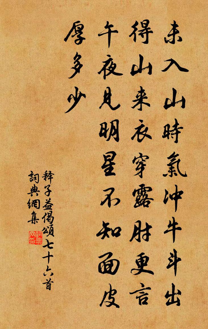 詩詞名句歷史字典書法欣賞書法字典國語詞典說文解字康熙字典古漢語字典標 題 作 者 詩 句 偈頌七十六首作者:釋子益 朝代:宋代偈頌七十六首原文未入山時,氣沖牛斗。出得山來,衣穿露肘。更言午夜見明星,不知麵皮厚多少。詩詞問答問:偈頌七十六首的作者是誰?答:釋子益問:偈頌七十六首寫於哪個朝代?答:宋代釋子益偈頌七十六首書法欣賞偈頌七十六首書法作品詩詞推薦冬窩夜語錢時〔宋代〕幽人只合臥林邱,不覺心幽境更綱。青汗有時昭帝則,黑甜餘暇伴賓游。黃花粲粲冬窩夜,丹葉蕭蕭蜀阜秋。會得辭李大諫再住萬壽釋師觀〔宋代〕年來老倒覺痴頑,振作叢林豈等閒。珍重賢侯休更問,且容懶散臥雲間。檥舟秦淮雨中寄侍其服之賀鑄〔宋代〕篷卑每礙幘,倉狹才容席。悽酸擁膝吟,奈此風雨夕。欣聞鐘漏旦,懷彼南城客。欲往從之游,塞塗沒吾屐。方君紹興祀大火十二首佚名〔宋代〕{太簇為徽}小太率禮,不愆於行。展采錯事,秩祀孔時。維今之故,閱我數度。修厥典常,神其來顧。植梔子樹二窠十一本於松側梅堯臣〔宋代〕舉世多植梨,而我學種梔。顏色固不別,良苦誠異宜。團團綠階側,豈畏秋風吹。同心誰可贈,為詠昔人詩。病中赴袁州次香館楊衡〔唐代〕病輿憩上館,繚繞向山隅。荒葛漫欹壁,幽禽啄朽株。力微怯升降,意欲結踟躇。誰能挹香水,一為濯煩紆。寄甘孝先二首王大受〔宋代〕古戌相從已許年,中間轉徒廢書傳。似聞南柵溪邊柳,準擬君來擊酒船。吁嗟篇曹植〔魏晉〕吁嗟此轉蓬,居世何獨然。長去本根逝,夙夜無休閒。東西經七陌,南北越九阡。卒遇迴風起,吹我入雲間。自謂再促花虞儔〔宋代〕珍重栽培意,商量仔細開。花心終有待,詩句漫勞催。莫恨三秋去,須教一笑回。但儲千斛酒,端的奉徘徊。滕勿齋內楊氏輓詞王柏〔宋代〕東風捲地兮摧千紅,松柏青蔥兮啟幽宮。龍{左巾右荒}廣柳兮辭簾櫳,埋香掩玉兮甘長終。芳草萋萋兮春又空,贈韋侍御黃裳其一李白〔唐代〕太華生長松,亭亭凌霜雪。天與百尺高,豈為微飆折。桃李賣陽艷,路人行且迷。春光掃地盡,碧葉成黃泥。願君題節婦憑氏傅後用南翁韻徐瑞〔宋代〕夫征婦孕判居行,夫沒兒存婦節清。不背所天終此義,信知有欲甚於生。芳名真足留千載,百偽無如仗一誠。定益游月岩書二絕經紀其清趙虞臣〔宋代〕茲游閒適實清奇,恍對柯山一局棋。興盡相呼下山去,歸途猶趁日西時。和微之游湖春夏秋冬四絕韓維〔宋代〕花邊鷺立紅雲里,林下人行翠幄中。炎暑吾今知所避,全家移入廣寒宮。有懷青城霧中道友陸游〔宋代〕雪谷孤松自郁然,紛紛朝菌但堪憐。坐更拂石芥城劫,時說開皇龍漢年。淡煮藜羹天送供,閒拖藤杖地行仙。共看牛相公見示新什,謹依本韻次用以抒下情劉禹錫〔唐代〕劇韻新篇至,因難始見能。雨天龍變化,晴日鳳鶱騰。游海驚何極,聞韶素不曾。愜心時拊髀,擊節日麾肱。符彩辛酉正月十一日,東園桃李盛開楊萬里〔宋代〕千萬重山見復遮,兩三點雨直還斜。行穿錦巷入雪巷,看盡桃花到李花。賢者之孝二百四十首戴逵子林同〔宋代〕戴琴妙一世,二子得其聲。不忍遺音奏,各將新弄行。村居偶成姚孝錫〔宋代〕靜愛柴門野興幽,杖藜徐步到岩丘。深林有獸鳥先噪,廢圃無人泉自流。土瘠稅租隨力辦,年豐禾黍過時收。客來化無盡歷釋印肅〔宋代〕化城立有誰知意,普雨調和潤萬機。大根枝節全體露,何殊彌勒降生時。石兒拍掌連雲指,木女含笙和水吹。試問名句推薦嶺樹重遮千里目,江流曲似九迴腸。柳宗元《登柳州城樓寄漳汀封連四州》 紛紛世事無窮盡,天數茫茫不可逃。羅貫中《三國演義·第一百二十回》 春愁凝思結眉心,綠綺懶調紅錦薦。顧敻《玉樓春·拂水雙飛來去燕》 山無陵,江水為竭,冬雷震震,夏雨雪,天地合,乃敢與君絕。佚名《上邪》 歸志寧無五畝園,讀書本意在元元。陸游《讀書》 明月隨良掾,春潮夜夜深。王昌齡《送郭司倉》 當場不論,過後枉然。佚名《增廣賢文·下集》 春到南樓雪盡。驚動燈期花信。万俟詠《昭君怨·春到南樓雪盡》 吾嘗跂而望矣,不如登高之博見也。荀子《荀子·勸學》 曾把梨花,寂寞淚闌乾朱淑真《江城子·賞春》