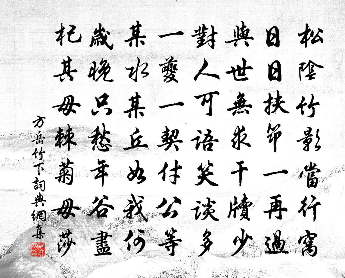 詩詞名句歷史字典書法欣賞書法字典國語詞典說文解字康熙字典古漢語字典標 題 作 者 詩 句 竹下作者:方岳 朝代:宋代竹下原文松陰竹影當行窩,日日扶筇一再過。與世無求乾牘少,對人可語笑談多。一夔一契付公等,某水某丘如我何。歲晚只愁年穀盡,杞其毋棘菊毋莎。詩詞問答問:竹下的作者是誰?答:方岳問:竹下寫於哪個朝代?答:宋代方岳竹下書法欣賞竹下書法作品詩詞推薦宜興山房十首李曾伯〔宋代〕俄頃鐘聲到枕邊,朦朧曉色試霜天。披衣欲起渾無事,贏得平明一覺眠。西湖曲/玉樓春朱敦儒〔宋代〕今冬寒早風光好。休怪攙先敧絮帽。蟹肥一個可稱斤,酒美三杯真合道。年年閒夢垂垂了。且喜風松吹不倒。平分暮春早起顧非熊〔唐代〕柳梢暗露滴清晨,簾下偏驚獨起人。鶗鴂數聲花漸落,園林是處總殘春。偈六首釋法智〔宋代〕一不成,二不是,火雲堆裹秋風起。堪笑耘田車水翁,手腳忙亂同兒戲。同兒戲,有巴鼻。但得豐年賀太平,四海緣識宋太宗〔宋代〕汝看浮生業,朝歡暮亦悲。笑迎先溟目,惡至聚愁眉。正直回斜曲,冤逢不用推。小人心似獸,君子定無欺。安國寺贈廣宣上人雍陶〔唐代〕馬急人忙塵路喧,幾從朝出到黃昏。今來合掌聽師語,一似敲冰清耳根。與弟侄觀小圃梅花二首陳著〔宋代〕看花須看未開時,到七分開看已遲。前輩詠梅多此意,水邊竹外兩三枝。寒夜有懷同志貫休〔唐代〕永夜殊不寐,懷君正寂寥。疏鍾寒遍郭,微雪靜鳴條。南省雁孤下,西林鶴屢招。終當謝時去,與子住山椒。郊廟歌辭。梁太廟樂舞辭。開平舞佚名〔唐代〕黍稷馨,醴z0清。牲牷潔,金石鏗。恭祀事,結皇情。神來格,歌頌聲。越上聞子規范仲淹〔宋代〕夜入翠煙啼,畫尋芳樹飛。春山無限好,猶道不如歸。移入官舍偶題四韻呈仲鹹王禹偁〔宋代〕賃舍喧卑謫宦情,同年邀我住公庭。不離鏈藥煎茶屋,便坐吟詩看雪廳。苔逕乍行侵屐綠,竹窗初臥滿床青。使君送王伯初學士赴北京機宜邵雍〔宋代〕丈夫志氣蓋棺定,自有雄圖系重輕。去路不能無感舊,到官爭忍便忘情。閒時語話貴精密,先事經營在太平。誰謂雍熙享先農六首佚名〔宋代〕明國紺壇,靈風肅然。登歌已闕,神馭將旋。道光帝籍,禮備公田。鑒茲躬家,永賜豈年。句羅太岊〔宋代〕素絲不改衣冠舊,黃道從教日月新。月夜期友人不至許渾〔唐代〕坐待故人宿,月華清興秋。管弦誰處醉,池館此時愁。風過渚荷動,露含山桂幽。孤吟不可曙,昨夜共登樓。山中再次胡德昭韻文天祥〔宋代〕不將顏色汗黃金,落得灞橋驢上吟。是處江山生酒興,滿天風雪得梅心。觥籌堂里春聲沸,燈火林皋夜色深。和陶淵明飲酒詩滕岑〔宋代〕今我思故里,身不能奮飛。登高眺山川,孰知予心悲。卻思大化中,萬類本無依。何者為我廬,是處皆可歸。幽憂浣溪沙蒲松齡〔清代〕舊向長堤纜畫橈,秋來秋色倍蕭蕭,空垂煙雨拂橫橋。斜倚西風無限恨,懶將憔悴舞纖腰,離思別緒一條條。點絳唇朱雍〔宋代〕輕艷盈盈,相逢曾向寒溪路。惜飄零處。無計禁春雨。素影參差,人在瓊城步。危闌暮。年光催度。特地香風住。複次前韻謝趙景貺陳履常見和兼簡歐陽叔弼兄蘇軾〔宋代〕能詩李長吉,識字揚子云。端能居此府,坐嘯獲兩君。逝將江湖去,浮我五石樽。眷焉復少留,尚為世所醺。或勸名句推薦譬道之在天下,猶川谷之於江海。老子《老子·道經·第三十二章》 人家見生男女好,不知男女催人老。王建《短歌行》 曲闌深處重相見,勻淚偎人顫。納蘭性德《虞美人·曲闌深處重相見》 賢者以其昭昭,使人昭昭;今以其昏昏,使人昭昭。孟子《孟子·盡心章句下·第二十節》 寒食時看郭外春,野人無處不傷神。雲表《寒食詩》 試問梅花何處好,與君藉草攜壺。張孝祥《臨江仙·試問梅花何處好》 衣懶換,酒難賒。可憐此夕看梅花。吳文英《思佳客·癸卯除夜》 澗影見松竹,潭香聞芰荷。孟浩然《夏日浮舟過陳大水亭 / 浮舟過滕逸人別業》 取酒須勤醉,鄉關不可思。司馬光《送張寺丞覲知富順監》 猶有遺簪,不展秋心,能卷幾多炎熱。張炎《疏影·詠荷葉》