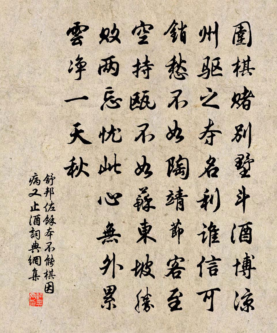 詩詞名句歷史字典書法欣賞書法字典國語詞典說文解字康熙字典古漢語字典標 題 作 者 詩 句 余本不能棋因病又止酒作者:舒邦佐 朝代:宋代余本不能棋因病又止酒原文圍棋賭別墅,斗酒博涼州。驅之奪名利,誰信可銷愁。不如陶靖節,客至空持甌。不如蘇東坡,勝敗兩忘憂。此心無外累,雲淨一天秋。詩詞問答問:余本不能棋因病又止酒的作者是誰?答:舒邦佐問:余本不能棋因病又止酒寫於哪個朝代?答:宋代舒邦佐余本不能棋因病又止酒書法欣賞余本不能棋因病又止酒書法作品詩詞推薦遊仙釋文珦〔宋代〕結交真仙徒,翛然凌太清。體與虛無合,心同日月明。遂遙龍鳳駕,縹緲雲霓旌。豈知區中人,狗苟復蠅營。讀潁公清風庥司馬光〔宋代〕伊皋垂訓皆王度,周召陳詩盡國風。非獨立言方不朽,相君功德已無窮。題餘干縣乾越亭李孝先〔宋代〕吳越猶乾地要衝,樹亭危岸勢憑空。春潭倒影黃昏月,古木喧聲白晝風。鷗鷺慣來窺燕席,煙雲無著護簾櫳。淒涼過玉蓮湯宋祁〔宋代〕平日宮中賜浴時,玉蓮香目湧華漪。錦鳧繡雁今安在,汩汩餘湯自入池。情詩其二十三倉央嘉措〔清代〕崔嵬東山與天齊,紅顏迤邐隔雲梯。相思縈系解語花,心似奔馬雪蹄疾。永和清都觀謝道士童顏鬒髮問其年生於丙子蓋蘇軾〔宋代〕鏡湖敕賜老江東,未似西歸玉局翁。羈枕未容春夢斷,清都宛在默存中。每逢佳境攜兒去,試問流年與我同。自笑送鄉人尹鑒登第歸劉沆〔宋代〕少年相款老相逢,鄉舉雖同遇不同。我已位塵三事後,君方名列五科中。榮登莫計名高下,宦達須由善始終。若到幸華嚴寺李忱〔唐代〕雲散晴山幾萬重,煙收春色更沖融。帳殿出空登碧漢,遐川俯望色藍籠。林光入戶低韶景,嶺氣通宵展霽風。今日歲暮福昌懷古四首其二(張子房)張耒〔宋代〕謀臣何處不知名,誰與留侯敢抗衡。籌下興亡分楚漢,幄中談笑走韓彭。懼誅老將爭梟首,高臥成功更養生。戡亂和陶淵明二十首陳造〔宋代〕公朝不遺才,蕩蕩天門天。雜遝盡奇士,騰凌舒壯懷。有客尋遂初,與時自作乖。脫粟傲肉食,官居當岩棲。東州讀劉夢得集李劉〔宋代〕一詠桃花謫九年,何如兵衛日高眠。苦嫌不得文章力,得力教君更可憐。寄雷丈朝宗趙蕃〔宋代〕憶我前年秋,驅羸赴行在。淒涼醴陵門,公獨枉軒蓋。客中遇還使。素書僅一通。計之曾未達,公起使廣東。而我送從侄擬赴江陵少尹王建〔唐代〕江陵少尹好閒官,親故皆來勸自寬。無事日長貧不易,有才年少屈終難。沙頭欲買紅螺盞,渡口多呈白角盤。應向次韻君澤夜坐示子侄三首方回〔宋代〕兩腳如麻坐到明,雨樓聽盡五更聲。無人共唱尋尋覓,有子聊教仄仄平。凌室不能藏臘凍,稼場或至誤秋成。誰知和士特栽果十首椑柿劉子翬〔宋代〕秋林黃葉晚霜嚴,熟蒂甘香味獨兼。火傘頳虬浪褒拂,風標那似邑中黔。鷓鴣天(別意)嚴仁〔宋代〕行盡春山春事空。別愁離恨滿江東。三更鼓潤官樓雨,五夜燈殘客舍風。寒淡淡,曉朧朧。黃雞催斷丑時鍾。紫騮與曾亨仲曹六二兄買小舟游西湖蘇泂〔宋代〕貪忙安得似偷閒,日日紅塵倦往還。買得小舟真似葉,敗荷叢底看孤山。岳忠武王祠于謙〔明代〕匹馬南來渡浙河,汴城宮闕遠嵯峨。中興諸將誰降敵,負國奸臣主議和。黃葉古祠寒雨積,清山荒冢白雲多。如何頌古一百首釋智愚〔宋代〕三文買個撈波子,摝蜆蝦得幾年。逆順短長休要說,誰家屋裡灶無煙。杏林春燕唐寅〔明代〕燕子歸來杏子花,紅橋低影綠池斜。清明時節斜陽里,個個行人問酒家。名句推薦千里馬常有,而伯樂不常有。韓愈《馬說》 半夜銜枚,滿城深雪,忽已亡懸瓠。李綱《念奴嬌·憲宗平淮西》 漆燕黃鸝夸舌健,柳花榆莢斗身輕。王禹偁《清明日獨酌》 古來存老馬,不必取長途。杜甫《江漢》 守身必謹嚴,凡足以戕吾身者宜戒之王永彬《圍爐夜話·第九八則》 怕歌愁舞懶逢迎。妝晚托春酲。陸游《朝中措·代譚德稱作》 彼說長,此說短。不關己,莫閒管。李毓秀《弟子規·信》 眼覷著災傷教我沒是處,只落得雪滿頭顱。張養浩《一枝花·詠喜雨》 夜來能有幾多寒,已瘦了、梨花一半。黃升《鵲橋仙·春情》 君看石芒碭,掩淚悲千古李白《丁督護歌》