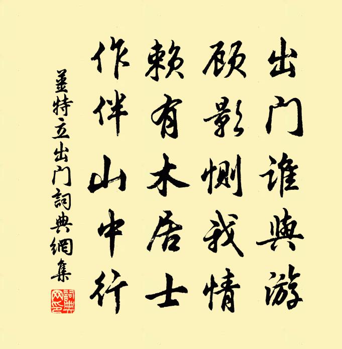 詩詞名句歷史字典書法欣賞書法字典國語詞典說文解字康熙字典古漢語字典標 題 作 者 詩 句 出門作者:姜特立 朝代:宋代出門原文出門誰與游,顧影惻我情。賴有木居士,作伴山中行。詩詞問答問:出門的作者是誰?答:姜特立問:出門寫於哪個朝代?答:宋代姜特立出門書法欣賞出門書法作品詩詞推薦秋曉五首章甫〔宋代〕擾擾世間事,悠悠眼中人。幽懷與誰語,獨立望秋旻。禪人寫真求贊釋正覺〔宋代〕大一無外,小一無內。一兮一兮,靡所不在。心地淨亡塵,肉山閒弗礙。道環中,絕端倪。空印里,何文彩。風淒送劉北秀二首楊萬里〔宋代〕劉子過逢二十年,別來風月幾千篇。黃金賣盡延賓友,囊底何須看一錢。喜李余自蜀至賈島〔唐代〕迢遞岷峨外,西南驛路高。幾程尋嶮棧,獨宿聽寒濤。白鳥飛還立,青猿斷更號。往來從此過,詞體近風騷。詠檐前竹沈約〔南北朝〕萌開籜已垂,結葉始成枝。繁蔭上蓊茸,促節下離離。風動露滴瀝,月照影參差。得生君戶牖,不願夾華池。扇子詩李石〔宋代〕三秋桂子玉舒花,天上樓台出帝家。只許阿兔操杵臼,不知更有玉蝦蟆。水調歌頭 喜雪魏初〔元代〕南國晝多霧,大是寫真詩。今年何許風色,吹作雪花飛。人道使車剛節,我道使車和氣,此語未應非。簿案盡叢雜次韻趙禹平春日書懷喻良能〔宋代〕草色青青二月時,物華雖是我廬非。日明院宇燕相語,花發園林鶯亂飛。無數小桃初掩映,幾多垂柳自因依。春風句朱浚〔宋代〕米車已過塵迷路,漁網才收月滿船。早炊童家店楊萬里〔宋代〕長亭深處小亭奇,雜蘤粗蕤亦有姿。羊角豆纏松葉架,雞冠花隔竹槍籬。不辭雨臥風餐里,可惜橙黃橘綠時。行到孤山觀梅朱南傑〔宋代〕費盡年年造化功,精神全在雪霜中。一枝映帶窗前月,消得逋仙作主翁。竹簟元稹〔唐代〕竹簟襯重茵,未忍都令卷。憶昨初來日,看君自施展。頌古三十八首釋慧方〔宋代〕善財拈起一枝草,持來度與文殊老。殺活雖然在手中,遍界不藏光杲杲。觀小魚釋永頤〔宋代〕藻間相失復相尋,水面爭浮力未禁。隔岸木蘭船欲去,浪花搖動一時沈。再過泗上二首(或張耒作)蘇軾〔宋代〕眼明初見淮南樹,十客相逢九吳語。旅程已付夜帆風,客睡不妨背船雨。黃柑紫蟹見江海,紅稻白魚飽兒女。殷勤行行江水邊趙文〔宋代〕朝行江水邊,莫行江水邊。乍與江水別,江水復在前。江水勝人心,相隨何 * 。相隨何 * ,幸勿鳴悲煎。我悲次韻德茂待仲甄巨卿未至李流謙〔宋代〕飄零一月住,日望北來船。眼冷傳書鯉,腸空吸露蟬。夢魂孤枕側,行李畏途邊。堅宋蒲人信,嗟予苦未賢。挽史館資政木石尢公三首劉克莊〔宋代〕往年群玉頂,典領偶然同。我去如廷秀,君來似放翁。同聃駕牛出,魯叟感麟逢。縱有招魂些,誰為寄浙中。次韻徐庭珍春日雜言十首陳棣〔宋代〕輕陰醞釀勒花天,節物撩人接禁菸。沂上未成曾點服,杖頭聊掛阮生錢。郊廟歌辭。享龍池樂章。第四章盧懷慎〔唐代〕代邸東南龍躍泉,清漪碧浪遠浮天。樓台影就波中出,日月光疑鏡里懸。雁沼回流成舜海,龜書薦祉應堯年。大川名句推薦何似當筵虎士,揮手弦聲響處,雙雁落遙空。葉夢得《水調歌頭·九月望日與客習射西園余偶病不能射》 惜恐鏡中春。不如花草新。張先《菩薩蠻·憶郎還上層樓曲》 誰憐一片影,相失萬重雲?杜甫《孤雁 / 後飛雁》 濤瀾洶湧,風雲開闔。蘇轍《黃州快哉亭記》 投我以桃,報之以李。即此言愛人者必見愛也,而惡人者必見惡也。墨子《墨子·16章 兼愛(下)》 貂不足,狗尾續。房玄齡《晉書·列傳·第二十九章》 無情燕子,怕春寒、輕失花期。晁沖之《漢宮春·梅》 立業無論大小,總要此身做得來。王永彬《圍爐夜話·第三九則》 虢國夫人承主恩,平明騎馬入宮門。張祜《集靈台·其二》 雁濕行無次,花沾色更鮮。李世民《詠雨》