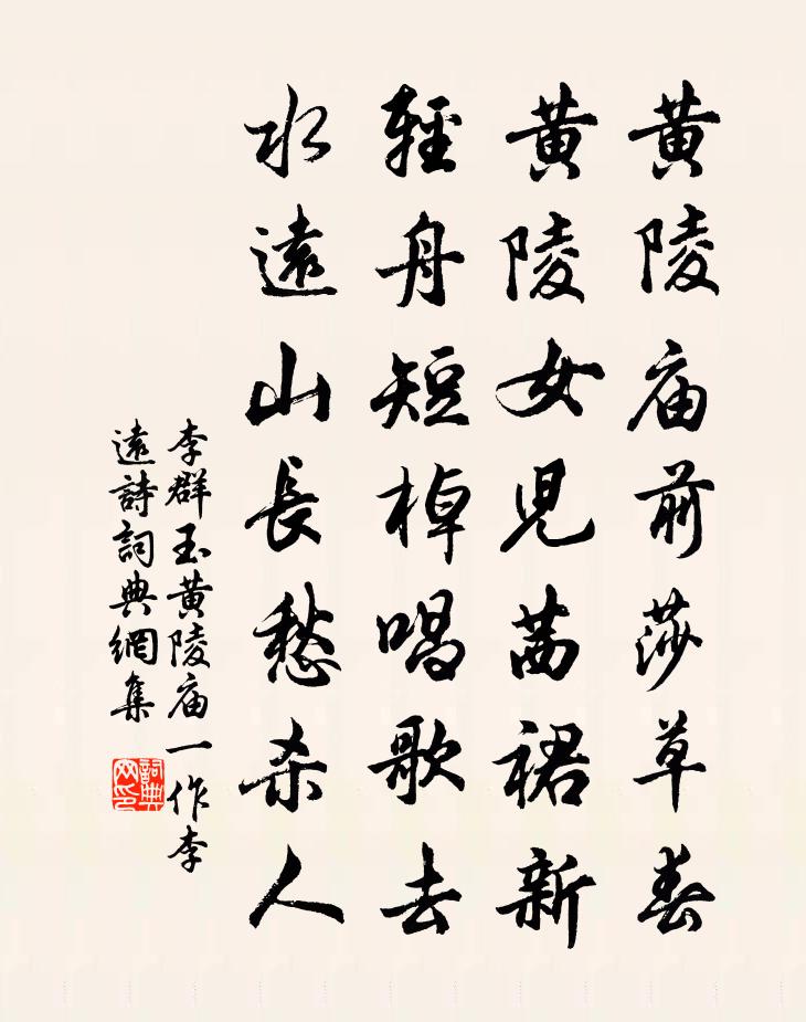 詩詞名句歷史字典書法欣賞書法字典國語詞典說文解字康熙字典古漢語字典標 題 作 者 詩 句 黃陵廟(一作李遠詩)作者:李群玉 朝代:唐代黃陵廟(一作李遠詩)原文黃陵廟前莎草春,黃陵女兒茜裙新。輕舟短棹唱歌去,水遠山長愁殺1/1人。詩詞問答問:黃陵廟(一作李遠詩)的作者是誰?答:李群玉問:黃陵廟(一作李遠詩)寫於哪個朝代?答:唐代李群玉黃陵廟(一作李遠詩)書法欣賞黃陵廟(一作李遠詩)書法作品詩詞推薦菩薩蠻曾覿〔宋代〕雲煙漠漠秋容老。茅檐映水人家好。林葉未凋疏。遠山橫有無。平生耕釣事。若個安身事。勸君早歸來。碧香新瓮四月二十一日同妻孥泛舟登呂氏濟川亭二首吳芾〔宋代〕呂公清德著吾鄉,生愛茲山死便藏。顧我來游雖恨晚,尚思杖屨共徜徉。題陳氏鏡湖陳元晉〔宋代〕水上觀心即是禪,此心如鏡察天淵。一塵不著風婆靜,俯水何慚鏡里天。凱歌十首呈賈樞使劉克莊〔宋代〕孔明籌筆即天威,謝傅圍棋亦事機。武騎散群望洋退,佛貍忍渴飲溲歸。禪居守常〔元代〕曉風飄磬遠,暮雪入廊深。念[1]載禪房宿,慇懃[2]自洗心。嵩岳珪禪師移樹圖贊釋紹曇〔宋代〕野樹無要作麽移,蓋頭茅免八風吹。直饒深入那伽定,弄鬼精魂誰不知。青玉案·乙酉重九葛守坐上作胡銓〔宋代〕宜霜開盡秋光老。感節物、愁多少。塵事難逢開口笑。滿林風雨,一江煙水,颯爽驚吹帽。玉堂金馬何須道。且斗望靈山韓元吉〔宋代〕岳鎮古所錄,茲山諒其遺。憶從西江來,恍惚欣見之。初疑春雨晴,雲物出怪奇。稍稍對岩壁,森森面嶺奇。紛紜梅花峰陳岩〔宋代〕僵立枯梢帶雪霜,至今陰極動潛陽。不嫌孤寂無人到,一點春風萬壑香。河中獻捷張隨〔唐代〕叛將忘恩久,王師不戰通。凱歌千里內,喜氣二儀中。寇盡條山下,兵回漢苑東。將軍初執訊,明主欲論功。落日與張樞密羅仲舒〔宋代〕孤憤全憑尺素書,一官牢落竟何如。兵威似火難言熄,世事猶棋祗報輸。魚棄青蒲歸淺渚,鳥忘白粒墮枯株。札人【王宮】脫布衫過小梁州張鳴善〔元代〕草堂中夏日偏宜,正流金爍石天氣。素馨花一枝玉質,白蓮藕樣彎瓊臂。門外紅塵袞袞飛,飛不到魚鳥清溪。綠陰花心動史達祖〔宋代〕風約簾波,錦機寒、難遮海棠煙雨。夜酒未蘇,春枕猶敧,曾是誤成歌舞。半褰薇帳雲頭散,奈愁味、不隨香去。海棠王邁〔宋代〕梅太清臞桃太肥,不濃不淡此花宜。何人筆下有香字,為杜陵翁補逸詩。次吳友梅假山韻楊公遠〔宋代〕石骨嵌岩聳怪形,主人對此快詩情。若教老筆來模倣,盤礴終朝畫不成。句石圭〔宋代〕上連牛斗橫天闊,下帶江淮據岸平。漁家傲歐陽修〔宋代〕六月炎蒸何太盛。海榴灼灼紅相映。天外奇峰千掌迥。風影定。漢宮圓扇初成詠。珠箔初褰深院靜。絳綃衣窄冰膚南鄉子蕭廷之〔宋代〕盡淨露天機。只恐時人自執迷。頷下藏珠當猛取,休遲。道在身中更問誰。塵綱忽拋離。百歲年華七十稀。莫待老讀太平告身蔡襄〔宋代〕綾紋金彩射星霞,潤墨新騰玉署麻。不用著心驚寵辰,去來元是坦空華。京城借永福寺漆台占似王城山文天祥〔宋代〕心如明鏡台,此言出浮屠。後來發精義,並謂此台無。此台已是贅,何況形而器。圓釋正超然,點頭會意思。多謝名句推薦十有九人堪白眼,百無—用是書生。黃景仁《雜感》 繁采寡情,味之必厭。劉勰《文心雕龍·情采》 賢而多財,則損其志;愚而多財,則益其過。司馬光《資治通鑑·漢紀·漢紀十七》 竹樹帶飛嵐,荇藻俱明麗。劉道著《湘江秋曉》 士為知己者死,女為悅己者容。劉向《戰國策·趙一·晉畢陽之孫豫讓》 待到重陽日,還來就菊花。孟浩然《過故人莊》 至若窮陰凝閉,凜冽海隅,積雪沒脛,堅冰在須。李華《弔古戰場文》 秋到邊城角聲哀,烽火照高台。陸游《秋波媚·七月十六日晚登高興亭望長安南山》 一往情深深幾許?深山夕照深秋雨。納蘭性德《蝶戀花·出塞》 何時更杯酒,再得論心胸。李白《魏郡別蘇明府因北游》