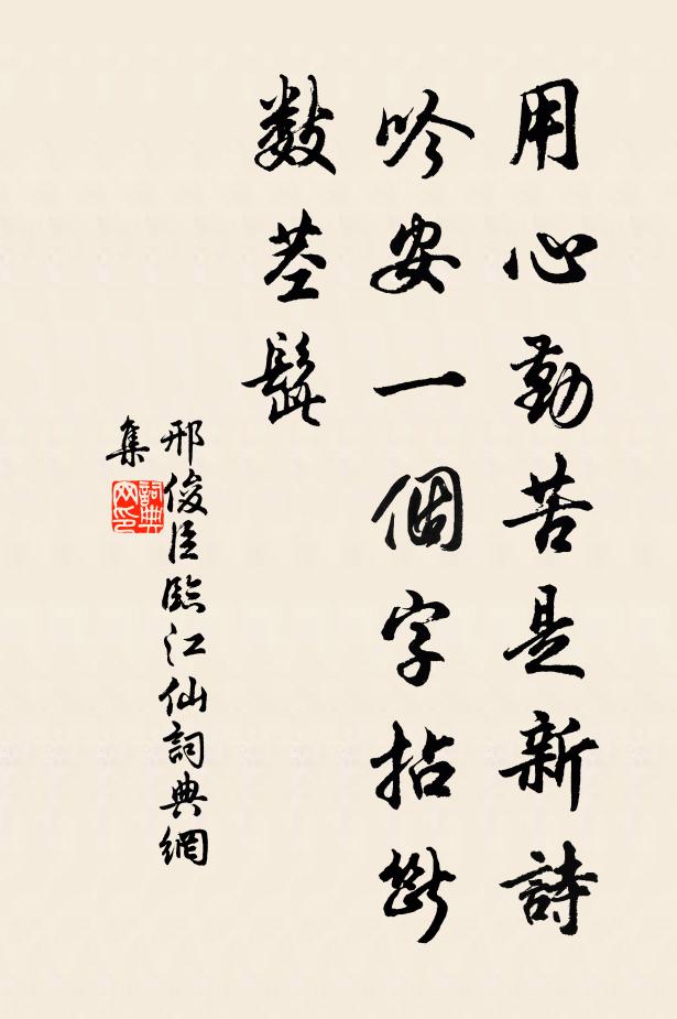 詩詞名句歷史字典書法欣賞書法字典國語詞典說文解字康熙字典古漢語字典標 題 作 者 詩 句 臨江仙作者:邢俊臣 朝代:宋代臨江仙原文用心勤苦是新詩。吟安一個字,拈斷數莖髭。詩詞問答問:臨江仙的作者是誰?答:邢俊臣問:臨江仙寫於哪個朝代?答:宋代問:臨江仙是什麼體裁?答:詞邢俊臣臨江仙書法欣賞臨江仙書法作品詩詞推薦柳噪竹楊億〔宋代〕好在碧壇灣,叢底度歲寒。何堪栽鳳律,祇好製魚竿。拂水煙稍潤,含風劍葉攢。芳蔭聊奉庇,君試仰天看。絕句汪炎昶〔宋代〕樹借看書影,蟬供隱几聲。人稀忘屋小,地淨覺涼生。余為建陽令遣小吏王堪為西山翁之役翁留之仙劉克莊〔宋代〕向來刀筆充書佐,歲晚衣巾學道流。畢竟賢於人一著,醉中夢裡忽回頭。次韻子由書李伯時所藏韓乾馬蘇軾〔宋代〕潭潭花古屋雲幕花垂,省中文花如亂絲。忽見伯時畫天馬,朔風胡沙生落錐。天馬西來從西極,勢與落日爭分馳。過擔石湖竇叔向〔唐代〕曉發漁門戍,晴看擔石湖。日銜高浪出,天入四空無。尺寸分洲島,纖毫指舳艫。渺然從此去,誰念客帆孤。大秀宮黃庭堅〔宋代〕玉笥山前大白峰,望仙橋下水溶溶。前溪流水後溪月,五步白雲三步松。半夜佩環朝上闕,插天樓閣度疏鍾。夢余天車詩楊維楨〔元代〕百日珊瑚漏天瓠河珊瑚決,高丘珊瑚十丈蛟龍穴。髯星降世教天車,刳爾雌雄兩龍節。膠泥瑣口如折筒,天竅地竅綠頭鴨 為牧庵壽許有壬〔元代〕論斯文,世誰方駕韓歐。渺翩翩、舊家人物,一峰玉立高秋。走蒲輪、鑾坡再至,照藜杖、石室重*。要使吾元,句晏殊〔宋代〕瓊字金扉迥倚天,南齊七志罕遺逸,西漢九流鹹粲然。重陽日寄上饒李明府劉商〔唐代〕重陽秋雁未銜蘆,始覺他鄉節候殊。旅館但知聞蟋蟀,郵童不解獻茱萸。陶潛何處登高醉,倦客停橈一事無。來歲重過列子廟追感頃年自淮服與居守王僕射…四韻奉寄李德裕〔唐代〕白首過遺廟,朱輪入故城。已慚聯左揆,猶喜抗前旌。曳履忘年舊,彈冠久要情。重看題壁處,豈羨棄繻生。和楊鐵庵送子監鎮之任韻五首姚勉〔宋代〕去年唱第時,文陣見整齊。萬花迎歸來,白馬黃金羈。及今催戍瓜,步武青雲低。風埃溘上征,飄飄乘白鷖。晨興陸游〔宋代〕未旦雞三號,將旦鵝群鳴;湖陂地曠快,頗樂聞此聲。回首宦遊日,鈴索攪五更,未言簿書勞,讒謗隨日生。一飢圓通秀禪師送遜公首座赴明水請張元乾〔宋代〕卷衲和雲離五老,派分三峽濟臨川。興波作浪從風鼓,莫學世流空度緣。蝶戀花 夜酌荷亭周權〔元代〕數畝寬閒吾老圃。著個茅亭,斗大無多子。水檻水花明楚楚。洒然不受人間暑。夜悄虛階初過雨。酒淺香深,風味踏歌朱敦儒〔宋代〕宴闋。散津亭鼓吹扁舟發。離魂黯、隱隱陽關徹。更風愁雨細添淒切。恨結。嘆良朋雅會輕離訣。一年價、把酒風頌古一百則釋正覺〔宋代〕三老暗轉舵,孤舟夜回頭。蘆花兩岸雪,煙水一江秋。風力扶帆行不棹,笛聲喚月下滄洲。洞前亭白玉蟾〔宋代〕洞前春水漾桃溪,洞後數聲青鳥啼。二十四岩風雨夜,神仙過此話刀圭。和韋相公話婺州陳事貫休〔唐代〕昔事堪惆悵,談玄愛白牛。千場花下醉,一片夢中游。耕避初平石,燒殘沈約樓。無因更重到,且副濟川舟。雨晴小步陳必復〔宋代〕蠶月家家靜,村流處處深。草分兩岸色,竹覆半池陰。少飲亦微醉,獨行還自吟。兒童怪相問,爭識野夫心。名句推薦誤落塵網中,一去三十年。陶淵明《歸園田居·其一》 行到水窮處,坐看雲起時。王維《終南別業 / 初至山中 / 入山寄城中故人》 捫蘿正意我,折桂方思君。范雲《送沈記室夜別》 重陽過後,西風漸緊,庭樹葉紛紛。晏殊《少年游·重陽過後》 聖人不貴尺之壁,而重寸之陰劉安及其門客《淮南子·原道訓》 青山橫北郭,白水繞東城李白《送友人》 從別後,憶相逢,幾回魂夢與君同。晏幾道《鷓鴣天·彩袖殷勤捧玉鍾》 易漲易退山溪水,易反易覆小人心。佚名《增廣賢文·上集》 夫知人之性,莫難察焉。諸葛亮《將苑·卷一·知人性》 紅日淡,綠煙晴。流鶯三兩聲。晏幾道《更漏子·柳絲長》