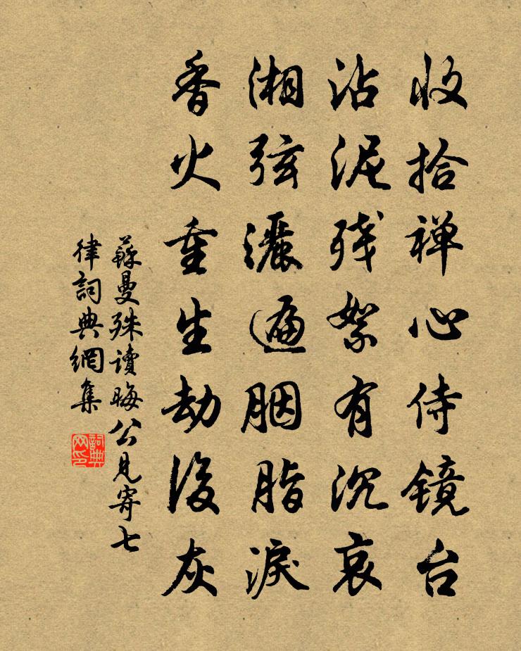 詩詞名句歷史字典書法欣賞書法字典國語詞典說文解字康熙字典古漢語字典標 題 作 者 詩 句 讀晦公見寄七律作者:蘇曼殊 朝代:近現代讀晦公見寄七律原文收拾禪心侍鏡台,沾泥殘絮有沉哀。湘弦灑遍胭脂淚,香火重生劫後灰。詩詞問答問:讀晦公見寄七律的作者是誰?答:蘇曼殊問:讀晦公見寄七律寫於哪個朝代?答:近現代書法欣賞讀晦公見寄七律書法作品詩詞推薦秋懷十首陳師道〔宋代〕翩翩王公孫,館我翠微院。粥飯隨鍾魚,朝昏度黃卷。中年妻子累,往世西方願。獨無詩書力,尼父安得怨。【雙調】殿前歡_春遊上花台張可久〔元代〕春遊上花台,落紅沾滿綠羅鞋。誰家庭院鞦韆外,蘭麝裙釵。我閒將笑口開,也待了芳春債,何處把新詩賣。無情南歌子(壽子)李漳〔宋代〕小子何時見,高秋此日生。階蘭岩桂正欣榮。家比杜陵猶有、彩衣輕。應詔須三載,傳家有一經。齊禽刷羽昌蜚鳴詩三首嚴中和〔宋代〕梅天雨氣入簾櫳,衣潤頻添柏火烘。四月江南無矮樹,人家都在綠陰中。漳州寫懷呂信臣〔宋代〕秦川西去遠,不意過漳川。歸夢三千里,羈愁二十年。謀生空白髮,行路若青天。餘事休相問,相留只醉眠。鷓鴣徐夤〔唐代〕繡仆梅兼羽翼全,楚雞非瑞莫爭先。啼歸明月落邊樹,飛入百花深處煙。避燒幾曾遺遠岫,引雛時見飲晴川。荔枝寄張劍州並示女弟王安石〔宋代〕劍閣天梯萬里寒,春風此日白衣冠。烏辭反哺顛毛黑,鳥引思歸口血丹。行路想君今眚瘦,相逢添我老悲酸。浮雲頌古五十七首釋道昌〔宋代〕將成之山,不進一簣。老倒雲門,坐而獲利。釣鰲釣鯨手段高,慣曾下海涉波濤。緩放急收自得便,浮家泛宅何飄減字木蘭花慢 銷金菊袁易〔元代〕芳鈿簇簇。曾印鮫綃裙六幅。萬朵天真。我是東籬富貴人。霜寒睡起。移就淺斟鴛帳底。買斷秋風。判得黃金土價登鎮海樓聞角聲賦梁棟〔宋代〕聽徹哀吟獨倚樓,碧天無際思悠悠。誰知儘是中原恨,吹到東南第一州。獨行,過柳橋而歸陸游〔宋代〕忽覺意稍佳,呼童扶下堂。寒雲覆江乾,慘慘雪欲作。籬根犬迎吠,碓下雞俯啄。徐行過傍舍,醉笑盛酬酢。再游道場釋紹嵩〔宋代〕萬仞峰頭古道場,重來敗葉帶飛霜。感時偏動騷人興,橘柚園籬近半黃。滿江紅 仲庸集賢以冬日桃花並樂章贈漁莊公劉敏中〔元代〕探梅花時候,怯朝寒、倦說梅溪清淺。誰*玄都春一握,烘暖小齊冰硯。何意芳妍,如今又與,前度劉郎花。武陵奉和過梁王宅即目應制武三思〔唐代〕岩居多水石,野宅滿風煙。本謂開三徑,俄欣降九天。穿林移步輦,拂岸轉行旃。鳳竹初垂籜,龜河未吐蓮。願持正月十一日夜夢與亡友譚德稱相遇於成都小東陸游〔宋代〕當年與子別江乾,漸老心知後會難。豈料今宵清夢裡,東門交轡說春寒。樓上劉禹錫〔唐代〕江上樓高二十梯,梯梯登遍與雲齊。人從別浦經年去,天向平蕪盡處低。秋蝶石延年〔宋代〕飛近素霜時滅沒,去銜紅葉共悠揚。花心何處無休歇,秋蝶雙翎花樹荒。代叔禮使北詩司馬光〔宋代〕人主愛民物,心無彼此情。約歡同一國,蒙福遍群生。玉帛遙相望,風波寂不驚。熙熙南北海,所至盡昇平。荷橋暮坐三首楊萬里〔宋代〕池似平鋪綠錦橫,荷花為緯藻為經。無端織出詩人像,獨立飛橋摘斗星。次張伯信韻題吳園畫軸蔡戡〔宋代〕誰把吳園較輞川,畫圖猶復想當年。要知故國非喬木,文採風流尚宛然。名句推薦文人之筆,勸善懲惡也。王充《論衡·卷二十·佚文篇》 共看明月應垂淚,一夜鄉心五處同。白居易《望月有感》 馬蹄濃露,雞聲淡月,寂歷荒村路。張榘《青玉案·被檄出郊題陳氏山居》 松雪飄寒,嶺雲吹凍,紅破數椒春淺。周密《獻仙音·吊雪香亭梅》 鳥之將死,其鳴也哀;人之將死,其言也善。孔子弟子《論語·泰伯篇》 彩舟載得離愁動。無端更借樵風送。賀鑄《菩薩蠻·彩舟載得離愁動》 堪怨王孫,不記歸期早。梅堯臣《蘇幕遮·草》 休言萬事轉頭空,未轉頭時皆夢。蘇軾《西江月·平山堂》 強欲登高去,無人送酒來。岑參《行軍九日思長安故園》 江山留勝跡,我輩復登臨。孟浩然《與諸子登峴山》