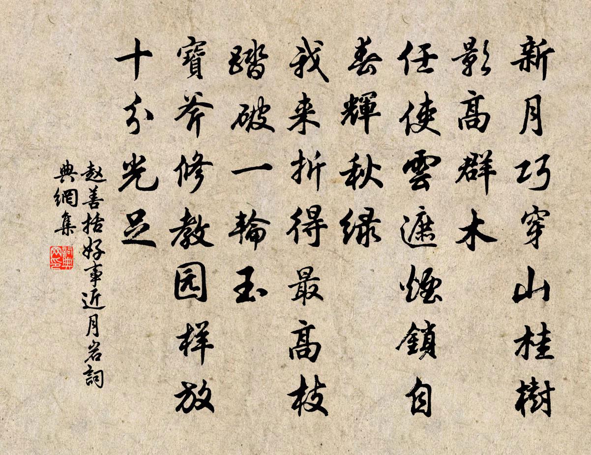 詩詞名句歷史字典書法欣賞書法字典國語詞典說文解字康熙字典古漢語字典標 題 作 者 詩 句 好事近(月岩)作者:趙善括 朝代:宋代好事近(月岩)原文新月巧穿山,桂樹影高群木。任使雲遮煙鎖,自春輝秋綠。我來折得最高枝,踏破一輪玉。寶斧修教園樣,放十分光足。詩詞問答問:好事近(月岩)的作者是誰?答:趙善括問:好事近(月岩)寫於哪個朝代?答:宋代問:好事近(月岩)是什麼體裁?答:詞趙善括好事近(月岩)書法欣賞好事近(月岩)書法作品詩詞推薦旅中過重陽朱慶餘〔唐代〕一歲重陽至,羈游在異鄉。登高思舊友,滿目是窮荒。草際飛雲片,天涯落雁行。故山籬畔菊,今日為誰黃。題閩縣西湖陳康伯〔宋代〕鑿開百頃碧融融,潁上錢塘約略同。楊柳兩堤連綠蔭,芰荷十時馥香風。波涵翠巘層層出,潮接新河處處能。輿誦相和歌辭。銅雀台梁瓊〔唐代〕歌扇向陵開,齊行奠玉杯。舞時飛燕列,夢裡片雲來。月色空餘恨,松聲莫更哀。誰憐未死妾,掩袂下銅台。春思詩謝朓〔南北朝〕茹溪發春水。阰山起朝日。蘭色望已同。萍際轉如一。巢燕聲上下。黃鳥弄儔匹。邊郊阻游衍。故人盈契闊。夢寐張朝宗輓詞二首周必大〔宋代〕甲第開鄰里,蝸廬遂不孤。相從期晚歲,太息奠生芻。涼吹飛丹旐,殘陽詠白駒。傷心松柏路,螭首載龜趺。嘉定巳巳立秋得膈上疾近寒露乃小愈陸游〔宋代〕獨立溪橋看落暉,殘蕪漠漠蝶飛飛。從來澤國秋常晚,嘆息衰翁已衲衣。菩薩蠻(壽昌甫生朝)韓淲〔宋代〕今年是處梅花早。分明開到章泉好。兄弟壽杯同。暗香明月風。風流文物舊。春意枝枝透。兒侄定飛軒。衣冠與世頌古三首釋宗印〔宋代〕死人眼,死人手。金烏飛,玉兔走。直截根源,取之左右。張翁醉倒官街,元是李翁吃私酒。次韻子瞻有美堂夜歸蘇轍〔宋代〕飲闌鍾虞欲移軒,香霧猶殘金博山。明月飛來松嶺外,遊人散落馬蹄間。城嚴畫鼓初傳角,路暗山花自落鬟。清境送周伯壽赴省二首項安世〔宋代〕子合居官久,今方得雋遲。我儂非不早,老去亦何為。冰玉相輝處,科名未是奇。草柔千萬慮,一一要扶持。過楊道士居賈島〔唐代〕先生修道處,茆屋遠囂氛。叩齒坐明月,支頤望白雲。精神含藥色,衣服帶霞紋。無話瀛洲路,多年別少君。晚望王銍〔宋代〕春濃已伴客愁濃,門掩雨餘江上峰。莫道夕陽無一事,遠顰眉黛更千重。前寄左省張起居一百言尋蒙唱酬見譽過實卻用舊韻重答鄭谷〔唐代〕減瘦經多難,憂傷集晚年。吟高風過樹,坐久夜涼天。旅退慚隨眾,孤飛怯向前。釣朋蓑叟在,藥術衲僧傳。鬢禿游淨因院寄璉禪師蘇轍〔宋代〕歲月潛消日裡冰,依然來見佛堂燈。此身已自非前我,問法何妨似舊僧。灑面飛泉時點點,壓池蒼石尚層層。遙知蠟梅武衍〔宋代〕磬口檀心紫暈重,繁香微泄繡簾風。照花休用添紅燭,卻怕輕明暖易融。三月初八日幸圓明園乾隆〔清代〕秉時御氣暮春初,靈沼靈台艷裔舒。似毯綠茵承步輦,含胎紅杏倚玫除。下空回雁無憂弋,畫水文鱗底用漁。滿眼酬厲侍御秋中思歸樹石所居見寄無可〔唐代〕三峰居接近,數里躡雲行。深去通仙境,思歸厭宦名。月從高掌出,泉向亂松鳴。坐石眠霞侶,秋來短褐成。句陳堯佐〔宋代〕青雲歧路游將遍,白髮光陰得最多。上十四吟十首劉克莊〔宋代〕養生之說要形勞,井臼何須晚自操。齒豁未須煩祝鯁,臂攣殊不礙持螯。除驅病崇無靈劑,裨補碑神賴老饕。尚有和陶淵明飲酒詩滕岑〔宋代〕佛氏苦戒酒,詳見所譯經。謂人諸罪業,多以酒故成。酒豈能造罪,心為物變更。心空罪亦空,徑造金仙庭。今我名句推薦凡庸之性,後夫多寵前夫之孤,後妻必虐前妻之子。顏之推《顏氏家訓·後娶篇》 紗窗日落漸黃昏,金屋無人見淚痕。劉方平《春怨》 相思一夜窗前夢,奈個人、水隔天遮。王沂孫《高陽台·和周草窗寄越中諸友韻》 高情已逐曉雲空。不與梨花同夢。蘇軾《西江月·梅花》 春夢隨雲散,飛花逐水流,寄言眾兒女,何必覓閒愁。曹雪芹《紅樓夢·第五回》 甘人之語,多不論其是非;激人之語,多不顧其利害。陳繼儒《小窗幽記·集醒篇》 高山安可仰,徒此揖清芬李白《贈孟浩然》 居善地,心善淵,與善仁,言善信,政善治,事善能,動善時。夫唯不爭,故無尤。老子《老子·道經·第八章》 過雨西風,數葉井梧愁舞。吳文英《荔枝香近·七夕》 來掃千山雪,歸留萬國花。袁枚《春風》