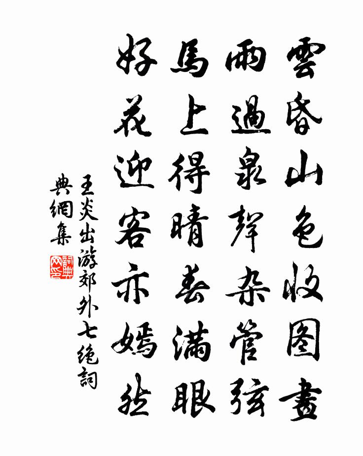 詩詞名句歷史字典書法欣賞書法字典國語詞典說文解字康熙字典古漢語字典標 題 作 者 詩 句 出遊郊外七絕作者:王炎 朝代:宋代出遊郊外七絕原文雲昏山色收圖畫,雨過泉聲雜管弦。馬上得晴春滿眼,好花迎客亦嫣然。詩詞問答問:出遊郊外七絕的作者是誰?答:王炎問:出遊郊外七絕寫於哪個朝代?答:宋代王炎出遊郊外七絕書法欣賞出遊郊外七絕書法作品詩詞推薦橫山楊萬里〔宋代〕已過方山了,橫山更絕奇。爭高一尖喜,妒逸眾青追。萬馬頭驚拶,千旗腳恣吹。娟峰恰三五,隔柳尚參差。寒林石屏無悶〔唐代〕草堂無物伴身閒,惟有屏風枕簟間。本向他山求得石,卻於石上看他山。五龍六首佚名〔宋代〕練吉日兮,進神之堂。牲既陳兮,粢盛既香。奠桂酒兮,容興嘉觴。發安留兮,錫我福祥。題吳先生山居劉得仁〔唐代〕先生此幽隱,便可謝人群。潭底見秋石,樹間飛霽雲。山居心已慣,俗事耳憎聞。念我要多疾,開爐藥許分。題黃長孺松江圖古箋陳著〔宋代〕吾行半東南,松江東南奇。湖鋪天上水,山橫鏡中眉。清風明月夜,細雨斜風時。扁舟幾來去,長揖三高祠。泯默再次韻馬主簿二首陳造〔宋代〕冥搜成癖漫勤斯,緬想騷人正坐馳。點化今逢萬金劑,神奇蒸出九華芝。三吳才雋應焚硯,萬里風煙盡入詩。盍與擊壤歌柴元彪〔宋代〕擊壤歌,擊壤歌,仰觀俯察如吾何。西海摩月鏡,東海弄日珠。一聲長嘯天地老,請君聽我歌何如。君不見丹溪牧無題田如鰲〔宋代〕投曉憑高霧滿天,直疑和氣釀豐年。殷勤北客還知否,不是南來有瘴煙。積雨作寒范成大〔宋代〕婢喜蚊僵霧帳,兒嗔蝸篆風欞。兀坐鼻端正白,忘懷眼底常青。次韻奉呈公澤處士張元乾〔宋代〕屏跡苕溪少往還,時危尤覺故人歡。相期臘盡屠蘇酒,速享春來苜宿盤。雪夜劇談金賊入,風江絕嘆鐵衣寒。何年和劉卿材十詠龍潭黃庶〔宋代〕寂寞真龍去,雩壇血不乾。世情多冷暖,對此鼻辛酸。宿先公房曉起偶成高明〔元代〕曉雨池上來,微風動寒綠。幽人睡初起,開窗見修竹。西山帶曾雲,隱隱出林木。境寂塵自空,慮淡趣常足。獨坐王昭君辭石崇〔魏晉〕我本漢家子。將適單于庭。辭決未及終。前驅已抗旌。仆御涕流離。轅馬為悲鳴。哀郁傷五內。泣淚沾朱纓。行行澄虛觀玉皇閣次韻陳深〔宋代〕巋然高閣鎮吳州,妙手應煩玉斧修。萬疊紅雲凝實座,一輪白日抱瑈樓。濛濛灝氣疑浮蜃,炯炯神光遠射牛。終待賀皇太子生辰王炎〔宋代〕鳳姿日表極高明,講習詩書若性成。參決萬機裨獨斷,力行三善答輿情。綺園何必來為助,啟誦安能更擅名。日侍漁父詞(其二)王諶〔宋代〕翁嫗齊眉婦亦賢。小姑顏貌正笄年。頭髮亂,髻鬟偏。愛把花枝立舵前。憶少年·年時酒伴曹組〔宋代〕年時酒伴,年時去處,年時春色。清明又近也,卻天涯為客。念過眼、光陰難再得。想前歡、盡成陳跡。登臨恨無寄題知儀州太保蒲中書齋梅堯臣〔宋代〕中條插遠近,黃河瀉直斜。蒲坂之城在其涯,渠渠碧瓦十萬家。官商工農共擾擾,侯獨理齋窗照紗。侯方守邊聽胡殘句:可憐世上金和寳范成大〔宋代〕可憐世上金和寳,借爾閑看七十年。游長安諸寺聯句。翊善坊保壽寺。光天幀贊聯句段成式〔唐代〕觀音化身,厥形孔怪。胣腦淫厲,眾魔膜拜。 ——張希復指夢鴻紛,榜列區界名句推薦去年相送,餘杭門外,飛雪似楊花。蘇軾《少年游·潤州作》 擢擢當軒竹,青青重歲寒。呂太一《詠院中叢竹》 驚風亂颭芙蓉水,密雨斜侵薜荔牆。柳宗元《登柳州城樓寄漳汀封連四州》 高築牆,廣積糧張廷玉《明史·列傳·卷二十四》 覺來眄庭前,一鳥花間鳴。李白《春日醉起言志》 卻憶安石風流,東山歲晚,淚落哀箏曲辛棄疾《念奴嬌·登建康賞心亭呈史致道留守》 洞庭一夜無窮雁,不待天明盡北飛。李益《春夜聞笛》 日初出大如車蓋,及日中則如盤盂,此不為遠者小而近者大乎?列禦寇《兩小兒辯日》 東風隨春歸,發我枝上花。李白《落日憶山中》 賭近盜,淫近殺。馮夢龍《警世通言·卷三十五》