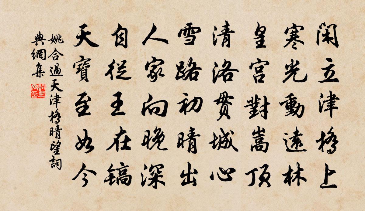 詩詞名句歷史字典書法欣賞書法字典國語詞典說文解字康熙字典古漢語字典標 題 作 者 詩 句 過天津橋晴望作者:姚合 朝代:唐代過天津橋晴望原文閒立津橋上,寒光動遠林。皇宮對嵩頂,清洛貫城心。雪路初晴出,人家向晚深。自從王在鎬,天寶至如今。詩詞問答問:過天津橋晴望的作者是誰?答:姚合問:過天津橋晴望寫於哪個朝代?答:唐代問:過天津橋晴望是什麼體裁?答:五律姚合過天津橋晴望書法欣賞過天津橋晴望書法作品注釋全唐詩:卷500-14詩詞推薦三疊泉廬山簡寂觀十五里一名擷泉蒲壽宬〔宋代〕此豈凡間物,神人疑屬饜。踏翻雲母碓,放出水精簾。娥女愁遺佩,冰虬或弄髯。鮫綃一百丈,織出浪紋纖。郊廟歌辭。享太廟樂章。肅和佚名〔唐代〕月禮已周,雲和將變。爰獻其醑,載遷其奠。明德逾隆,非馨是薦。澤沾動植,仁覃宇縣。出郊趙汝鐩〔宋代〕二月垂楊岸,行春詩酒徒。蒼頭前引道,拄杖掛葫蘆。紹興以後蜡祭四十二首佚名〔宋代〕[圜鍾為宮]玄冥凌萬,幾聿其周。天地閉藏,農且息休。古大蜡禮,伊耆筆修。爰薦飶聲,以迓飈游。送純老往會稽住華嚴二首曹勛〔宋代〕重陰雪意正商量,豈似師心徑絕江。識破須彌山句否,任交幡影上雲窗。遺老齋絕句十二首蘇轍〔宋代〕我居近西城,城枕湖一曲。不到平湖上,何物禁吾足。題清暉樓二首留碩〔宋代〕元龍高臥翠微中,碌碌諸人總下風。眼底朴陳無盡藏,八窗還我自玲瓏。更漏子佚名〔宋代〕絳紗籠,金葉蓋。向曉燈花猶在。冰未結,小琉璃。隴梅香滿枝。雪無香,花有意。不是江南新寄。霜月盡,碧天沁園春陳人傑〔宋代〕記上層樓,與岳陽樓,釃酒賦詩。望長山遠水,荊州形勝,夕陽枯木,六代興衰。扶起仲謀,喚回玄德,笑殺景升祀先蠶六首佚名〔宋代〕功被環宇,處蟲之靈。有神司之,以生以成。典禮有初,祀事講明。孔蓋翠旌,降集於庭。游李少師園十題水輪范祖禹〔宋代〕崩騰噴雪浪,書夜無停息。迴旋天磨轉,運動日卓側。贈無咎以既見君子云胡不喜為韻八首張耒〔宋代〕平生懷想人,握手良未易。接君同舍歡,此事非此世。十年淮海夢,一笑相逢地。投分白首期,願言何有既。【雙調】慶東原_西皋亭適興薛昂夫〔元代〕西皋亭適興曉雨登高驟,西風落帽羞,蟹肥時管甚黃花瘦。紅裙謾謳,青樽有酒,白髮無愁。晚節傲清霜,老圃香詠雪駱賓王〔唐代〕龍雲玉葉上,鶴雪瑞花新。影亂銅烏吹,光銷玉馬津。含輝明素篆,隱跡表祥輪。幽蘭不可儷,徒自繞陽春。挽熊墨莊王義山〔宋代〕積穀翁家詫富強,千斯倉與萬斯箱。盡教此輩更多蓄,輸與先生這一莊。身已九京名不朽,家藏萬卷字猶香。向來浣溪沙·紅日已高三丈透李煜〔唐代〕紅日已高三丈透,金爐次第添香獸。紅錦地衣隨步皺。佳人舞點金釵溜,酒惡時拈花蕊嗅。別殿遙聞簫鼓奏。已亥雜詩 245龔自珍〔清代〕豆蔻芳溫啟瓠犀,傷心前度語重提。牡丹絕色三春暖,豈是梅花處士妻。賢者之孝二百四十首孟莊子林同〔宋代〕無改父之道,真堪以孝稱。若論莊子孝,此直是難能。橫溪堂春曉二首虞似良〔宋代〕田塍常滿雨常余,綠遍溪南我獨無。珍重天公不遺物,也分余潤到昌蒲。夢歸陸游〔宋代〕老去無餘念,時時夢弊廬。細傾新釀酒,盡讀舊藏書。雲崦鉏畲粟,煙畦挽野蔬。從渠造物巧,賦芧戲群狙。名句推薦鵲飛山月曙,蟬噪野風秋。上官儀《入朝洛堤步月》 斷送一生憔悴,只銷幾個黃昏。趙令畤《清平樂·春風依舊》 綠竹半含籜,新梢才出牆。杜甫《嚴鄭公宅同詠竹》 歌沉玉樹,古寺空有疏鍾發。李綱《六么令·次韻和賀方回金陵懷古鄱陽席上作》 清風明月無人管,並作南樓一味涼。黃庭堅《鄂州南樓書事》 山河破碎風飄絮,身世浮沉雨打萍。文天祥《過零丁洋》 客思吟商還怯。怨歌長、瓊壺暗缺。周密《玉京秋·煙水闊》 拱木不生危,松柏不生埤。左丘明《國語·晉語·醫和視平公疾》 行人莫問當年事,故國東來渭水流。許渾《鹹陽城東樓 / 鹹陽城西樓晚眺 / 西門》 香醪欲醉茱萸節,壯志還為出塞歌。石茂華《九月九日登長城關》