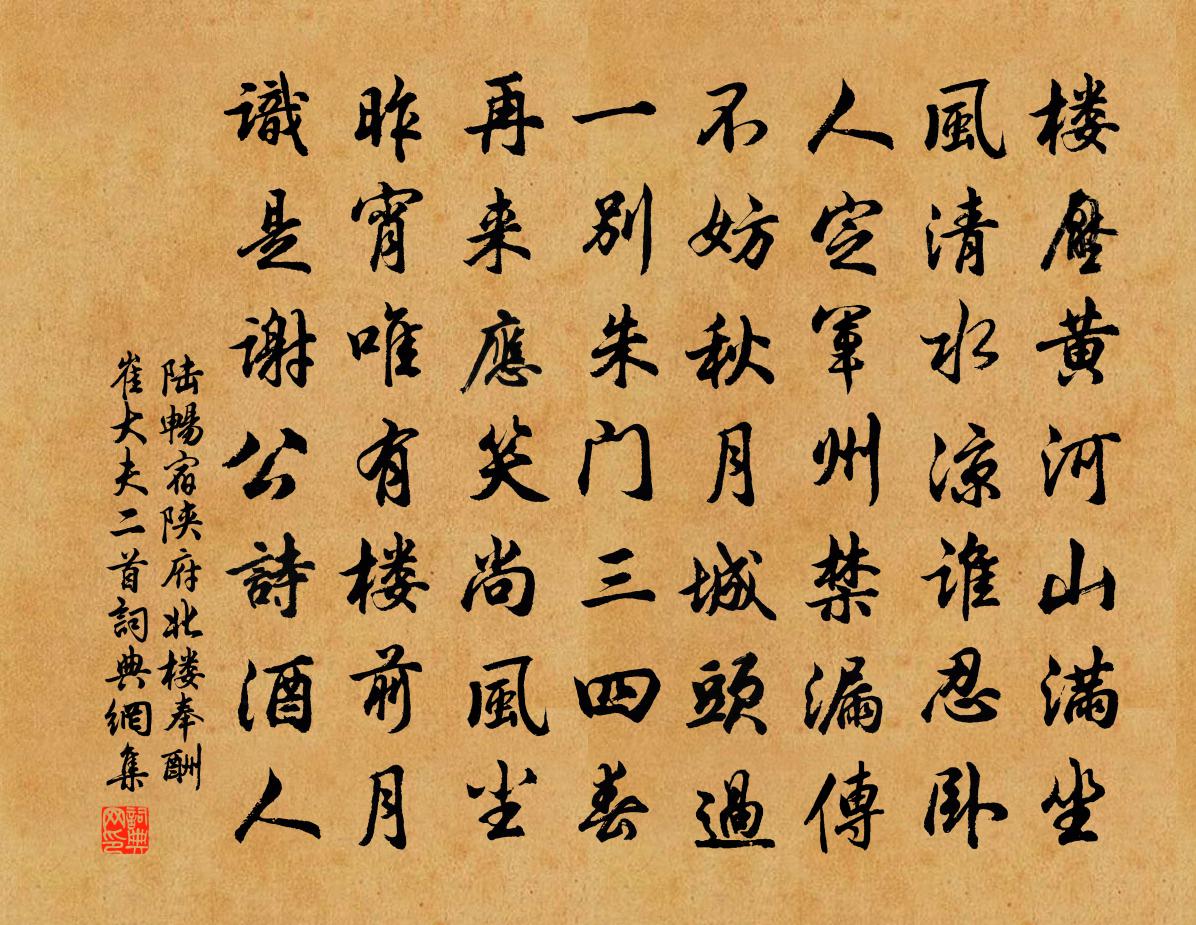 詩詞名句歷史字典書法欣賞書法字典國語詞典說文解字康熙字典古漢語字典標 題 作 者 詩 句 宿陝府北樓奉酬崔大夫二首作者:陸暢 朝代:唐代宿陝府北樓奉酬崔大夫二首原文樓壓黃河山滿坐,風清水涼誰忍臥。人定軍州禁漏傳,不妨秋月城頭過。一別朱門三四春,再來應笑尚風塵。昨宵唯有樓前月,識是謝公詩酒人。詩詞問答問:宿陝府北樓奉酬崔大夫二首的作者是誰?答:陸暢問:宿陝府北樓奉酬崔大夫二首寫於哪個朝代?答:唐代問:宿陝府北樓奉酬崔大夫二首是什麼體裁?答:七絕陸暢宿陝府北樓奉酬崔大夫二首書法欣賞宿陝府北樓奉酬崔大夫二首書法作品注釋全唐詩:卷478-20詩詞推薦相和歌辭。輓歌白居易〔唐代〕丹旐何飛揚,素驂亦悲鳴。晨光照閭巷,輀車儼欲行。蕭條九月天,哀輓出重城。借問送者誰,妻子與弟兄。蒼蒼和龐學士藍方〔宋代〕仰告明君乞得身,不妨林下戴紗巾。滿斟村酒浮瓊蟻,旋釣溪魚鱠錦鱗。元府烏鴉飛後夜,洞中花木鎮長春。吾官暢岩姚嗣宗〔宋代〕石作峒房勢,水隨人意流。兩岩長濺雨,五月便驚秋。此景多深趣,吾心真樂游。山翁中宿酒,欲醉五更頭。靜齋張敏則舍人贈詩因用其韻為酬戴復古〔宋代〕胸次詩書一派清,學如耕稼到秋成。十年閉戶存吾道,萬事無心逐世情。葉落花開關氣數,山長水遠是功名。摩挲病中戲書陸游〔宋代〕五十忽過二,流年消壯心。避人便小疾,移竹喜微陰。洗瓮閒篘酒,焚香靜斫琴。鏡中青鬢在,切莫遣愁侵。雜曲歌辭。傷歌行孟郊〔唐代〕眾毒蔓貞松,一枝難久榮。豈知黃庭客,仙骨生不成。春色舍芳蕙,秋風繞枯莖。彈琴不成曲,始覺知音傾。館月齊桓晉文之事佚名〔先秦〕齊宣王問曰:“齊桓、晉文之事,可得聞乎?” 孟子對曰:“仲尼之徒,無道桓、文之事者,是以後世無傳焉九日章甫〔宋代〕登高長是易銷魂,多病新來目更昏。強引兒童追節物,久拚身世任乾坤。江風冷拂烏紗帽,籬菊香浮老瓦盆。回首送客不及宋祁〔宋代〕祖帟難留十里筵,亭皋衰柳但長煙。班騅不及來時路,黃鵠空驚去後弦。曾是松心同歲晚,怒無梅信發春前。南樓湖州李使君聞予游廬山寄書云為我一謝清絕陳舜俞〔宋代〕道微本一致,喧靜偶殊轍。眷言朝廷士,何必山水悅。李侯稟靈氣,家園鄰大別。廬峰五千仞,曾上捫日月。一隨夏日翠漪堂文同〔宋代〕湖山碧溶溶,寒漪四望通。龜魚游浩渺,鳧鶩下虛空。爽氣吟窗外,清光釣艇中。一襟時自快,多謝北軒風。偶作楊簡〔宋代〕詩痴正自不煩攻,只為英才輒墮中。今日已成風俗後,後生個個入樊籠。雜體詩 古離別江淹〔南北朝〕小序夫楚謠漢風。既非一骨。魏制晉造。固亦二體。譬猶藍朱成彩。雜錯之變無窮。宮角為音。靡曼之態不極。故鬬雞詩徐陵〔南北朝〕季子聊為戲。陳王欲聘才。花冠已衝力。芥爪復驚媒。鬬鳳羞衣錦。雙鸞恥鏡台。陳倉若有信。為覓寶雞來。立春陳傅良〔宋代〕千官勒馬謝幡勝,萬國鞭牛占雨晴。誰據槁梧相近午,頰車徐轉鼻無聲。四時田園雜興范成大〔宋代〕雨後山家起較遲,天窗曉色半熹微。老翁欹枕聽鶯囀,童子開門放燕飛。山中值雨偶成胡仲弓〔宋代〕山中雲氣多,忽合即為雨。垤鸛鳴一聲,毒龍戲吞吐。翻手覆手間,紛紛不可數。彼蒼難致詰,陰晴竟誰主。此雨定光室汪任〔宋代〕古有如來號定光,百年真相為重裝。面前湧出香爐石,欲使人燒無盡香。賀新郎(游西湖和李微之校勘)吳泳〔宋代〕一片湖光淨。被遊人、撐船刺破,寶菱花鏡。和靖不來東坡去,欠了騷人逸韻。但翠葆、玉釵橫鬢。碧藕花中人家又次韻帥初諸前七首陳著〔宋代〕世機毒甚含沙蜮,民命危於減水魚。幸有柴門自深閉,不妨窗下蠹殘書。名句推薦一向年光有限身,等閒離別易銷魂,酒筵歌席莫辭頻。晏殊《浣溪沙·一向年光有限身》 被酒莫驚春睡重,賭書消得潑茶香,當時只道是尋常。納蘭性德《浣溪沙·誰念西風獨自涼》 深山畢竟藏猛虎,大海終須納細流。佚名《增廣賢文·上集》 驅雞上樹木,始聞叩柴荊。杜甫《羌村三首·其三》 主闇於上,臣詐於下,滅亡無日荀子《荀子·君道》 已知泉路近,欲別故鄉難。夏完淳《別雲間》 愁凝處,渺渺殘照紅斂吳文英《宴清都·秋感》 芳樹無人花自落,春山一路鳥空啼。李華《春行即興》 信言不美,美言不信。老子《老子·德經·第八十一章》 故聲聞過情,君子恥之。孟子《孟子·離婁章句下·第十八節》