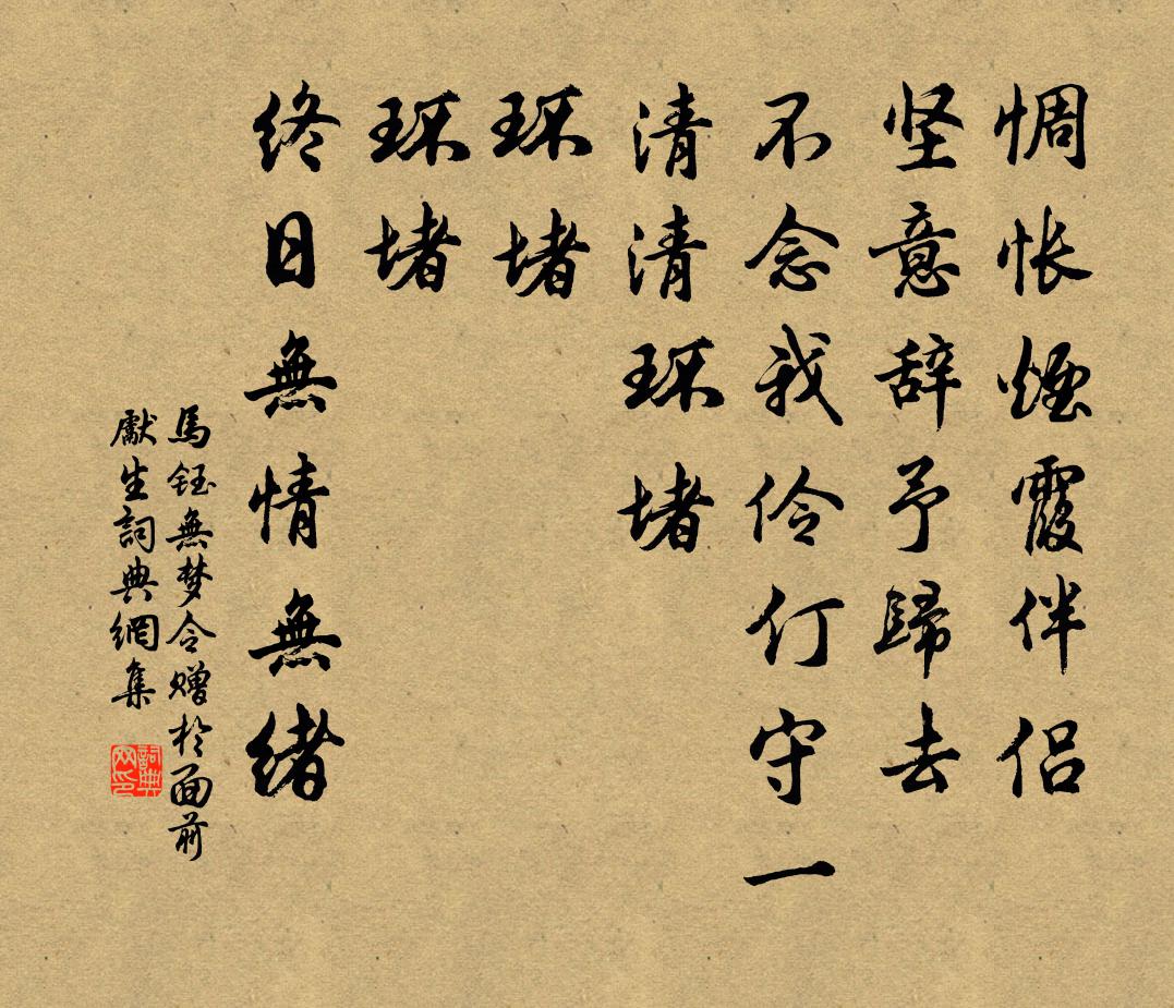 詩詞名句歷史字典書法欣賞書法字典國語詞典說文解字康熙字典古漢語字典標 題 作 者 詩 句 無夢令 贈於面前先生作者:馬鈺 朝代:元代無夢令 贈於面前先生原文惆悵煙霞伴侶。堅意辭予歸去。不念我伶仃,守一清清環堵。環堵。環堵。終日無情無緒。詩詞問答問:無夢令 贈於面前先生的作者是誰?答:馬鈺問:無夢令 贈於面前先生寫於哪個朝代?答:元代問:無夢令 贈於面前先生是什麼體裁?答:詞馬鈺無夢令 贈於面前先生書法欣賞無夢令 贈於面前先生書法作品詩詞推薦吊鄭賓客李洞〔唐代〕朝行喪名節,岳色慘天風。待漏秋吟斷,焚香夜直空。骨寒依壟草,家盡逐邊鴻,一吊知音後,歸來碎嶧桐。江神子(喜雨上麓翁)吳文英〔宋代〕一聲玉磬下星壇。步虛闌。露華寒。平曉阿香,油壁碾青鸞。應是老鱗眠不得,雲炮落,雨瓢翻。身閒猶耿寸心丹菩薩蠻·新寒中酒敲窗雨納蘭性德〔清代〕新寒中酒敲窗雨,殘香細裊秋情緒。才道莫傷神,青衫濕一痕。無聊成獨臥,彈指韶光過。記得別伊時,桃花柳萬善慶堂詩楊維楨〔元代〕鐵江泥泥,其流長深。奕奕新堂,有書有琴。有橋在高,有梓於陰。君子慶只,少伊氏之覃。宜爾家屋,和樂且湛句湖州士子〔宋代〕可憐載工部,獨樹不成林。無心顧逢〔宋代〕世態真堪笑,機深禍亦深。多謀還損己,有壽必無心。嘔肺因詩苦,開懷遇酒斟。平生隨造物,不暇問升沉。禪人並化主寫真求贊釋正覺〔宋代〕出入離微,偏正之機。變通動靜,殺活之柄。飛流電火兮持林際之威權,函蓋乾坤分得雲門之號令。相隨百草頭邊應庵和尚贊釋智遇〔宋代〕奮劈胸拳,撈摸虛空骨髓。開活入眼,瞎卻自己頂門。從芘海涌峰危,是謂東山正續。除夜小飲,嘆都下酥乳不至楊萬里〔宋代〕雪韭霜菘酌歲除,也無牛乳也無酥。貧中卻富何人會,自有村醪不用沽。喜魯直還用前韻再作晁說之〔宋代〕君有非常罪,幸此非常赦。收身黑水西,重人白蓮社。又豬頭和尚贊釋了惠〔宋代〕豬頭捧起,會苦全甘。飢兮不吃,飽而常貪。荊門上張丞相孟浩然〔唐代〕共理分荊國,招賢愧楚材。召南風更闡,丞相閣還開。覯止欣眉睫,沉淪拔草萊。坐登徐孺榻,頻接李膺杯。始蔚挽余丞相四首彭龜年〔宋代〕三絕今非少,元功人未知。豈雲公有憾,時恐世傳疑。誰解吟成史,寧憂罪到詩。詩成終自愧,空恨一年遲。東皋劉黻〔宋代〕天然岩壑怪,官況此中閒。台閣人煙上,闌乾樹影間。引泉歸月沼,分菊上秋山,咫尺神仙洞,聽笙忘卻還。懷智體道人貫休〔唐代〕棲碧思吾友,庭鶯百囀時。唯應一處住,方得不相思。雲水淹門閫,春雷在樹枝。平生無限事,不獨白雲知。送楊主簿項安世〔宋代〕誠齋四海一先生,詩滿江湖以字行。 * 親傅誰得缽,異聞獨立子趨庭。未能暇日詢三得,枉作經年共一城。眼底奉使契丹二十八首其十五虜帳蘇轍〔宋代〕虜帳冬住沙陀中,索羊織葦稱行宮。從官星散依冢阜,氈廬窟室欺霜風。舂粱煮雪安得飽,擊兔射鹿夸強雄。朝廷同曾公卷出南城吳則禮〔宋代〕著處籃輿得小停,偶尋奇詭對屏星。山南山北有幽囀,樹底樹頭惟落英。兩鬢已脫吾種種,三眠欲罷渠青青。招得出近村歸偶作陸游〔宋代〕朝騎小蹇涉煙村,擁路爭看八十身。似我猶為一好漢,問君曾見幾閒人?楊梅線紫開園晚,蓴菜絲長入市新。莫笑留別三侄曾幾〔宋代〕僧窗又與汝周旋,百感相隨到酒邊。無復吹箎如異日,空驚枕塊已三年。一門叔父吾衰矣,東閣郎君但勉旃。不為名句推薦淡盪春光寒食天。玉爐沉水裊殘煙。夢回山枕隱花鈿。李清照《浣溪沙·淡盪春光寒食天》 最傷情、送客鹹陽,佩結西風怨。吳文英《瑣窗寒·玉蘭》 長風幾萬里,吹度玉門關。李白《關山月》 細雨濕衣看不見,閒花落地聽無聲。劉長卿《別嚴士元》 天馬徠,龍之媒,游閶闔,觀玉台。劉徹《天馬二首·其二》 疏籬曲徑田家小。雲樹開清曉。周邦彥《虞美人·疏籬曲徑田家小》 念去去,千里煙波,暮靄沉沉楚天闊。柳永《雨霖鈴·寒蟬淒切》 數州訊息斷,愁坐正書空。杜甫《對雪》 前經洛陽陌,宛洛故人稀。王維《送魏郡李太守赴任》 只言啼鳥堪求侶,無那春風欲送行。高適《夜別韋司士》