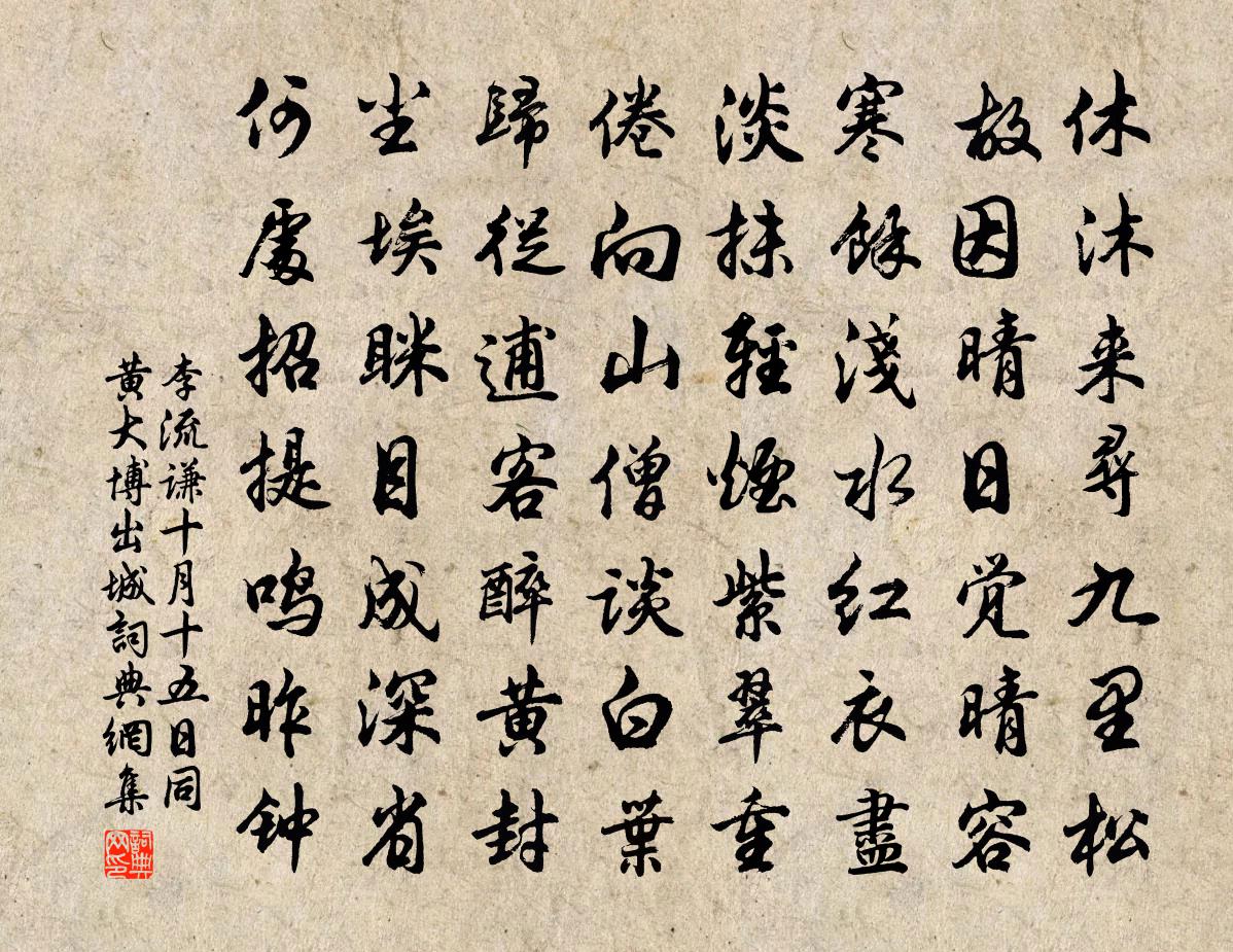 詩詞名句歷史字典書法欣賞書法字典國語詞典說文解字康熙字典古漢語字典標 題 作 者 詩 句 十月十五日同黃大博出城作者:李流謙 朝代:宋代十月十五日同黃大博出城原文休沐來尋九里松,故因晴日覺晴容。寒余淺水紅衣盡,淡抹輕煙紫翠重。倦向山僧談白葉,歸從逋客醉黃封。塵埃眯目成深省,何處招提鳴昨鍾。詩詞問答問:十月十五日同黃大博出城的作者是誰?答:李流謙問:十月十五日同黃大博出城寫於哪個朝代?答:宋代李流謙十月十五日同黃大博出城書法欣賞十月十五日同黃大博出城書法作品詩詞推薦望蓬萊王哲〔元代〕猿馬住,性命自然知。一粒刀圭開四象,兩般槍法殺三屍。神水溉華池。,公看取,便是坎和離。土馬趕回金虎子梅岩徐瑞〔宋代〕不見此山四十載,岩石相看亦粲然。顧我丹心今不改,信渠鐵面晚獨堅。人生出處無非數,文運昌明自屬天。尚恨蘇州十詠其六靈岩寺范仲淹〔宋代〕古來興廢一愁人,白髮僧歸掩寺門。越相煙波空去雁,吳王宮闕半啼猿。春風似舊花猶笑,往事多遺石不言。唯有摸魚兒 次韻抱瓷張伯淳〔元代〕采黃花、自斟清醑,南山人在何許。浮生聚散雲萍似,消得幾番寒暑。些個路。□不斷情,惟有春天樹。停歌罷關山月鄧林〔宋代〕關山夜月明,分彩照胡兵。將軍擁節起,長戍受降城。焚烽望別壘,欲驗盈虛鴂。塞笳將夜鵲,戰氣今如此。重關自白土村入北寺二首王安石〔宋代〕木杪田家出,城陰野逕分。溜渠行碧玉,畦稼臥黃雲。薄槿煙脂染,深荷水麝焚。夕陽人不見,雞鶩自成群。提刑使者還嘉州宋祁〔宋代〕使者艤行舟,是行及淒序。祖帳俯平沙,從騎羅前渚。一進酒惟醴,再進魴及鱮。還客已少悰,況將暌宴語。勁風湖上呈虞仲房張鎡〔宋代〕謁客沖泥路有聲,筍輿風裡轉高城。秋山正要一意看,曉日倍添雙目明。淺濼鴟盤思腐啄,孤汀鶴立念遐征。世間聞蛙倪瑞璿〔清代〕草綠清池水面寬,終朝閣閣叫平安。無人能脫征徭累,只有青蛙不屬官。題竹石牧牛黃庭堅〔宋代〕子瞻畫叢竹怪石,伯時增前坡牧兒騎牛,甚有意態,戲詠。野次小崢嶸,幽篁相倚綠。阿童三尺箠,御此老觳觫。次韻公權子通唱酬詩四首牡丹朱長文〔唐代〕奇姿須賴接花工,未必妖華限洛中。應是春皇偏與色,卻教仙女愧乘風。朱欄共約他年賞,翟幄休嗟數日空。誰就崔伯易畫像贊陸游〔宋代〕古之君子,學以為己。可行則行,可止則止。仕以行義,止以遠恥。世衰道微,豈復知此。蚩蚩始學,青紫思拾。師廷珍以詩見惠因用其韻晁公溯〔宋代〕詩禮初聞衛尉旁,起家期擅蜀文章。快吟芍藥當階句,剩香芙蓉別殿香。木蘭花慢佚名〔宋代〕望陽生漸布,見梅萼、暖初回。向雪裡、一枝才苞,素艷已占春台。煙籠半含粉面,透清香、暗觸滿襟懷。可惜前訪僧不遇陸龜蒙〔唐代〕棹倚東林欲問禪,遠公飛錫未應還。蒙莊弟子相看笑,何事空門亦有關?和洪司令梅花吳泳〔宋代〕杼雲新卷雪泥乾,剪剪輕風薄薄寒。莫遣水龍吹別調,放教春在玉欄乾。簡楊安國陳師道〔宋代〕侯門誰預識馮諼,歲晚寧知范叔寒。傾蓋尚憐吾道在,立談相信古人難。開懷磊落無城府,握手侵尋出肺肝。共許銘座六言二首劉克莊〔宋代〕數步覺蕭娘臭,三日聞荀令香。涑水公銘衾戒,乖崖老按劍防。清明趙孟堅〔宋代〕節近清明長是陰,黃花間在麥苗深。倦行卻上高樓望,煙鎖前村一半林。臘雪二首袁說友〔宋代〕無計遮留歲月殘,頗驚節物愧才慳。可人臘雪偏宜處,屈指春風未到間。猶得微吟供午枕,不須高臥閉晨關。晚業名句推薦生民之本,要當稼稽而食,桑麻以衣。顏之推《顏氏家訓·治家篇》 愁絕行人天易暮,行向鷓鴣聲里住納蘭性德《菊花新·用韻送張見陽令江華》 一雙舞燕,萬點飛花,滿地斜陽。陳子龍《訴衷情·春遊》 關西老將不勝愁,駐馬聽之雙淚流。王維《隴頭吟》 雪月最相宜,梅雪都清絕。張孝祥《卜運算元·雪月最相宜》 畫船捶鼓催君去。高樓把酒留君住。舒亶《菩薩蠻·畫船捶鼓催君去》 露清枕簟藕花香,恨悠揚。顧敻《虞美人·觸簾風送景陽鍾》 想文君望久,倚竹愁生步羅襪。姜夔《八歸·湘中送胡德華》 砧面瑩,杵聲齊。搗就征衣淚墨題。賀鑄《杵聲齊·砧面瑩》 江帶峨眉雪,川橫三峽流。李白《經亂離後天恩流夜郎憶舊遊書懷贈江夏韋太守良宰》