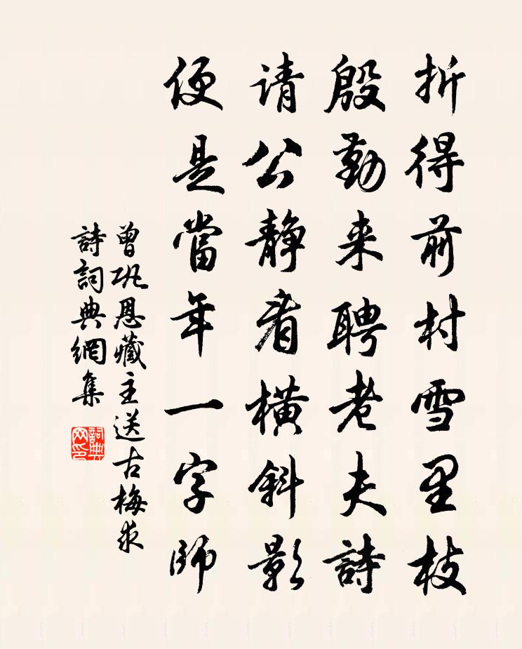 詩詞名句歷史字典書法欣賞書法字典國語詞典說文解字康熙字典古漢語字典標 題 作 者 詩 句 恩藏主送古梅求詩作者:曾鞏 朝代:宋代恩藏主送古梅求詩原文折得前村雪裡枝,殷勤來聘老夫詩。請公靜看橫斜影,便是當年一字師。詩詞問答問:恩藏主送古梅求詩的作者是誰?答:曾鞏問:恩藏主送古梅求詩寫於哪個朝代?答:宋代曾鞏恩藏主送古梅求詩書法欣賞恩藏主送古梅求詩書法作品詩詞推薦甲辰除夜吟范成大〔宋代〕一年三百六十日,日日三椽臥衰疾。旁人揶揄還嘆咨,問我如何度四時?我言平生老行李,蓐食趁程中夜起。當時麥秋劭農隨侍郡侯杖屨獲遂澹岩一游浪吟古句趙與泳〔宋代〕玲瓏岩竅高倚空,霧靄山巔氣鬱蔥。征途倍喜憩美蔭,石室況乃來清風。屈曲兩門最虛敞,不斤不斧誰施工。眼高二礪鄭思肖〔宋代〕愁里高歌梁父吟,猶如金玉戛商音。十年勾踐亡吳計,七日包胥哭楚心。秋送新鴻哀破國,晝行飢虎齧空林。胸中謁金門(春早湖山)韓淲〔宋代〕春尚早。春入湖山漸好。人去人來雖未老。酒徒猶恨少。梅落桃開煙島。日日更吹香草。一片芳心拚醉倒。冷雲藏次韻審知十三日四絕趙蕃〔宋代〕尺水真成起丈波,水南水北斷經過。幾思落筆題觀漲,卻恨詩材本不多。南鄉子張弘范〔元代〕深院日初長。萬卷詩書一炷香。竹掩茅齋人不到,清涼。茶罷西軒讀老莊。世事莫論量。今古都輸夢一場。*煞利上陽白髮人白居易〔唐代〕陽人,上陽人,紅顏暗老白髮新。綠衣監使守宮門,一閉上陽多少春。玄宗末歲初選入,入時十六今六十。同時采耿天騭惠梨次韻奉酬三首王安石〔宋代〕開國桐鄉已白頭,國人誰復記前游。故情但有吳塘水,轉入東江向我流。次韻梅山弟醉吟七首陳著〔宋代〕暗檐行吟梅影瘦,午窗坐睡檀絲長。不作上下四方夢,何妨參受三峰香。燕支行(時年二十一)王維〔唐代〕漢家天將才且雄,來時謁帝明光宮。萬乘親推雙闕下,千官出餞五陵東。誓辭甲第金門裡,身作長城玉塞中。衛霍馮元素輓詩項安世〔宋代〕出塞千夫敵,還家一善門。閨門春穆穆,鄉黨晚恂恂。字畫清能謹,詩章秀以醇。備無邊瑣氣,懷此最傷神。題陶谷朝林山樓帖劉克莊〔宋代〕鸞膠曲子久喧傳,烈祖英明素薄焉。語草探懷周[以下殘缺]束擔羅與之〔宋代〕束擔出荊扉,征塵染敝衣。人憐雙鬢改,我悟半生非。抱璞今誰訴,知音古亦稀。尋思無一可,吾道欲安歸。和洪秀才八首胡寅〔宋代〕自昔超群者,無非遠大猷。要令心似鏡,莫遣氣橫秋。末學多牆面,深窺異瞽眸。君看顏氏子,何以過商游。仰答韋司業垂訪五首蕭穎士〔唐代〕呦呦食苹鹿,常飲清泠川。但悅豐草美,寧知牢饌鮮。主人有幽意,將以充林泉。羅網倖免傷,蒙君復羈牽。高堂長相思三首李白〔唐代〕長相思,在長安。絡緯秋啼金井闌,微霜淒淒簟色寒。孤燈不明思欲絕,卷帷望月空長嘆。美人如花隔雲端。上有古意李新〔宋代〕嗟來吐食死,漂母愛王孫。等是乞憐人,一飽何足論。東方老先生,笑傲忘至尊。朔飢侏儒飽,且用長短分。醉太平·堂堂大元佚名〔元代〕堂堂大元,奸佞專權。開河變鈔禍根源,惹紅巾萬千。官法濫,刑法重,黎民怨。人 * ,鈔買鈔,何曾見?賊做題竹岩卿鏤冰集陶夢桂〔宋代〕一片好詩如片月,半生愁殺鏤冰公。多情誤心苦為樂,眾體疑於異卻同。向度手抄方刻棗,數莖發在已如蓬。江湖和張器先十絕楊萬里〔宋代〕向來一別十番秋,訊息中間風馬牛。只道故人霄漢去,不應林岳小淹留。名句推薦櫪馬苦踡跼,籠禽念遐征。張九齡《秋晚登樓望南江入始興郡路》 玉人初上木蘭時。懶妝斜立澹春姿。吳文英《浣溪沙·題李中齋舟中梅屏》 移舟去。未成新句。一硯梨花雨。周晉《點絳唇·訪牟存叟南漪釣隱》 一苦一樂相磨練,練極而成福者,其福始久洪應明《菜根譚·概論》 無由持一碗,寄與愛茶人。白居易《山泉煎茶有懷》 雲里帝城雙鳳闕,雨中春樹萬人家。王維《奉和聖制從蓬萊向興慶閣道中留春雨中春望之作應制》 無肉令人瘦,無竹令人俗。蘇軾《於潛僧綠筠軒》 單者易折,眾則難摧魏收《魏書·列傳·卷八十九》 所向泥活活,思君令人瘦。杜甫《九日寄岑參》 知君慣度祁連城,豈能愁見輪台月。岑參《送李副使赴磧西官軍》
