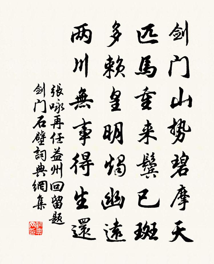 詩詞名句歷史字典書法欣賞書法字典國語詞典說文解字康熙字典古漢語字典標 題 作 者 詩 句 再任益州回留題劍門石壁作者:張詠 朝代:宋代再任益州回留題劍門石壁原文劍門山勢碧摩天,匹馬重來鬢已斑。多賴皇明燭幽遠,兩川無事得生還。詩詞問答問:再任益州回留題劍門石壁的作者是誰?答:張詠問:再任益州回留題劍門石壁寫於哪個朝代?答:宋代張詠再任益州回留題劍門石壁書法欣賞再任益州回留題劍門石壁書法作品詩詞推薦舟中李流謙〔宋代〕一舸乘涼載夕暉,晚來白汗稍停揮。近人初月當頭照,趁宿輕鷗直下飛。江國有天須恣買,岫雲無雨莫空歸。新秋賀鄭漕三首黃公度〔宋代〕當年畫省與成均,聯璧看君親弟昆。清世幾人兼五福,白頭相對備三尊。朝班猶識尚書履,時論同推通德門。早晚和白使君木蘭花徐凝〔唐代〕枝枝轉勢雕弓動,片片搖光玉劍斜。見說木蘭征戍女,不知那作酒邊花。木蘭花·池塘水綠風微暖晏殊〔宋代〕池塘水綠風微暖,記得玉真初見面。重頭歌韻響崢琮。入破舞腰紅亂旋。玉鉤闌下香階畔,醉後不知斜日晚。當時花瓶釋寶曇〔宋代〕轆轤聲中井花滿,亦有口腹如許清。百花叢中度朝夕,一點不關流俗情。丙戌送春有作吳芾〔宋代〕三月三十日,春去人盡惜。我獨惜春多,欲留春不得。憶昨仕行都,亦屢逢春色。王事多鞅掌,常苦無暇隙。擔上戲馬台文天祥〔宋代〕九月初九日,客遊戲馬台。黃花弄朝露,古人花飛埃。今人哀後人,後人復今哀。世事那可及,淚落茱萸杯。秋砧送邑大夫竇叔向〔唐代〕斷續長門下,清泠逆旅秋。征夫應待信,寒女不勝愁。帶月飛城上,因風散陌頭。離居偏入聽,況復送歸舟。惠莊道中張耒〔宋代〕山雨夜塵息,林霜晨氣清。荒城余古木,破冢有新耕。風俗通秦壤,川原抱洛京。憑高時駐馬,指點問山名。和朱世同見寄吳芾〔宋代〕門外青山玉作堆,山前一水更縈迴。歸來雖喜風煙好,老去還驚歲月催。不見故人增寂寞,尚懷往日共徘徊。何時送聶士友通判上印入朝楊萬里〔宋代〕君家樞相扶天極,氣凌霜雪忠貫日。史家有筆嘆無人,今有此人無此筆。君侯名家千里駒,拱璧盈尺徑寸珠。合登賀許宰伯詡再考王邁〔宋代〕宰官才具萬人豪,雞小如何下得刀。奏課再經書上上,理繁祗見辦多多。抽囊有卷牛腰重,裝橐無金馬骨高。欲賀次韻元煇中秋雨方回〔宋代〕良辰合與一樽酬,有酒無朋也自愁。萬事只堪花老眼,一年又過雨中秋。鳴砧處處淒鄰巷,擊檄相望起戍樓。更著桂源曉別秦珏河堤余靖〔宋代〕回館逢清論,長亭慘別襟。亡羊南北路,躍馬利名心。酒市搖風幟,花村鎖霧林。行行俱得意,結綬有知音。遊仙詞竇鞏〔唐代〕海上神山綠,溪邊杏樹紅。不知何處去,月照玉樓空。句晃逈〔宋代〕宴居寂寂堪修道。將歸黃公度〔宋代〕北首寒猶淺,南轅暑正深。馬蹄長道路,鹿性本山林。客至能相勉,愁來可獨禁。功名竟何物,造化久冥心。看采菱白居易〔唐代〕菱池如鏡淨無波,白點花稀青角多。時唱一聲新水調,謾人道是采菱歌。詠馬貴陽畫冊陳維崧〔清代〕極北龍歸,江東馬渡,君臣建業偏安。天上無愁,宮中有慶,聲聲玉樹金蓮。點綴太平年。更尚書艷曲,丞相蠻箋丈人觀廟醮留題王之望〔宋代〕翠麓丹崖敞洞天,瓊宮珠殿照雲煙。森羅壁繪推前輩,縹緲樓居見列仙。朝斗壇邊星象冷,步虛聲內月華圓。塵埃名句推薦不充詘於富貴,不遑遑於所欲。姚察、姚思廉《梁書·列傳·卷五十》 入我相思門,知我相思苦,李白《三五七言 / 秋風詞》 和氏之璧乎?價重千金,然以之間紡,曾不如瓦磚。劉向《說苑·雜言》 藍橋春雪君歸日,秦嶺秋風我去時。白居易《藍橋驛見元九詩》 青春幾何時,黃鳥鳴不歇。李白《江南春懷》 可憐赤壁爭雄渡,唯有蓑翁坐釣魚。杜牧《齊安郡晚秋》 一切福田,不離方寸;從心而覓,感無不通。袁黃《了凡四訓·立命之學》 相思記取,愁絕西窗夜雨。韓元吉《薄倖·送安伯弟》 仕宦當作執金吾,娶妻當得陰麗華。范曄《後漢書·本紀·皇后紀上》 更吹羌笛關山月,無那金閨萬里愁王昌齡《從軍行七首》