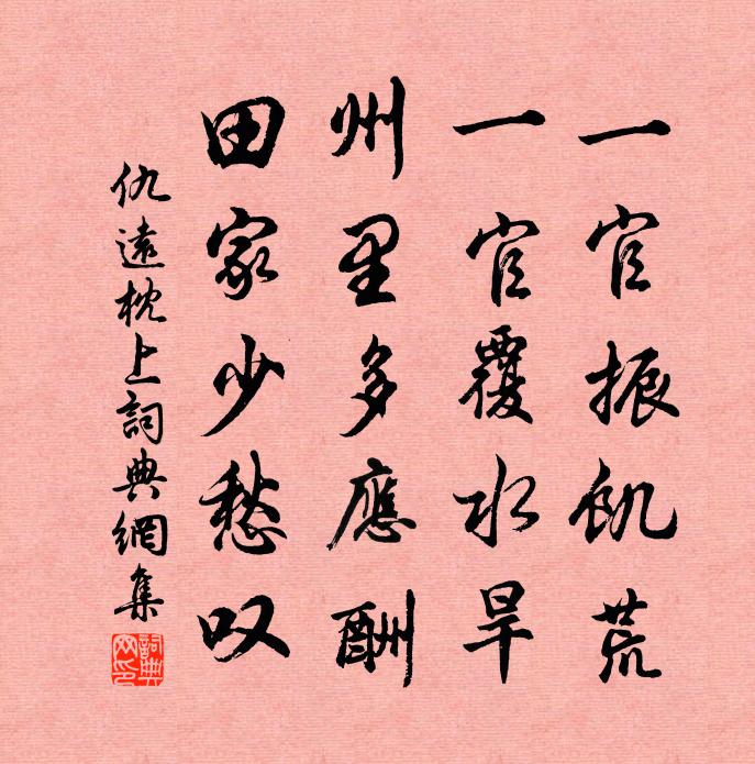 詩詞名句歷史字典書法欣賞書法字典國語詞典說文解字康熙字典古漢語字典標 題 作 者 詩 句 枕上作者:仇遠 朝代:宋代枕上原文一官振饑荒,一官覆水旱。州里多應酬,田家少愁嘆。詩詞問答問:枕上的作者是誰?答:仇遠問:枕上寫於哪個朝代?答:宋代仇遠枕上書法欣賞枕上書法作品詩詞推薦題汪氏茅亭杜荀鶴〔唐代〕茅亭客到多稱奇,茅亭之上難題詩。出塵景物不可狀,小手篇章徒爾為。牛畔稻苗新雨後,鶴邊松韻晚風時。君今春秋戰國門蘇厲周曇〔唐代〕百步穿楊箭不移,養由堪教聽弘規。身隆業著未知退,勿遣功名一旦隳。寄沈褒秀才杜牧〔唐代〕晴河萬里色如刀,處處浮雲臥碧桃。仙桂茂時金鏡曉,洛波飛處玉容高。雄如寶劍沖牛斗,麗似鴛鴦養羽毛。他日舟行即事王諶〔宋代〕釣艇橫溪水,漁罾搭權籬。年豐翁自樂,酒熟客先知。涼吹生苹葉,斜陽戀竹枝。苦吟渾未就,倚柂立移進。和蘇養直見貽二首曹勛〔宋代〕投閒久去大明宮,鐘鼎山林興已同。但得眠雲仍釣水,不妨抹月與批風。頗能植杖閒為圃,尚欲臨文學送窮。煩子道中有感高蟾〔唐代〕一醉六十日,一裘三十年。年華經幾日,日日掉征鞭。梅花下飲茶又成二絕吳芾〔宋代〕強拈茶碗對梅花,應是花神笑我多。更取香醪拼一醉,不禁風味惱人何。東陽道中周文璞〔宋代〕野店梢頭起灶煙,江雲弄色半晴天。暗泉繞砌喧人語,遠燒侵林照客韉。晚日未收雞上樹,春風欲度鳥耘田。布帆詠江南景物陽枋〔宋代〕幽深鳥嶼亂參差,溪水迢遙橫復斜。鵝鴨馴人不怕棹,間隨小艇過蘆花。傷景吟趙順孫〔宋代〕門前不改舊山河,蓮渚愁紅盪碧波。墜葉飄花難再復,浮雲流水竟如何。魚龍寂寞秋江冷,鴻雁不來風雨多。窮巷秋館雨後得弟兄書即事呈李明府戎昱〔唐代〕弟兄書忽到,一夜喜兼愁。空館復聞雨,貧家怯到秋。坐中孤燭暗,窗外數螢流。試以他鄉事,明朝問子游。望終南山李世民〔唐代〕重巒俯渭水,碧嶂插遙天。出紅扶嶺日,入翠貯岩煙。疊松朝若夜,復岫闕疑全。對此恬千慮,無勞訪九仙。踏莎行(靈泉重陽作)李流謙〔宋代〕菊露晴黃,楓霜晚翠。重陽氣候偏如此。異鄉牢落怕登臨,吾家落照飛雲是。舉扇塵低,脫巾風細。靈苗醫得人憔句釋曉瑩〔宋代〕發興真成繼庾公。題畫廿四首唐寅〔明代〕鄧尉山邊七寶灘,高低如畫好溪山。十年游賞經行遍,多少名題竹樹間。浣沙溪/浣溪沙方千里〔宋代〕無數流鶯遠近飛。垂楊裊裊弄晴暉。斷腸聲里送春歸。鬢影空思香霧濕,襪塵還想步波微。去年花下酒闌時。陶庵精舍殷彥卓〔宋代〕靜結羅浮屋,鄰雞遠不聞。秋到屋下田,井井皆黃雲。草堂久無夢,甘與麋鹿群。我聞彭澤令,恥為二姓臣。一朝妙因寺次施敬所韻真山民〔宋代〕松蘿一徑陰,踏破白雲深。約客分茶供,逢僧倚竹吟。鼠留香篆跡,禽和閣鈴音。話久不知晚,新螢照出林。食楊梅三首曾幾〔宋代〕一月如繩雨瀉檐,只言新竹漸多添。豈知政負幽人腹,不放楊梅蜜樣甜。相和歌辭輓歌二首於鵠〔唐代〕陰風吹黃蒿,輓歌渡秋水。車馬卻歸城,孤墳月明里。雙轍出郭門,綿綿東西道。送死多於生,幾人得終老。見人名句推薦佇久河橋欲去,斜陽淚滿。吳文英《三姝媚·過都城舊居有感》 金槳木蘭船,戲采江南蓮。劉孝威《採蓮曲·金槳木蘭船》 人心統耳目官骸,而於百體為君,必隨處見神明之宰王永彬《圍爐夜話·第十二則》 君子內省不疚,無惡於志。君子之所不可及者,其唯人之所不見乎。子思《中庸·第三十三章》 湖南為客動經春,燕子銜泥兩度新。杜甫《燕子來舟中作》 黑雲壓城城欲摧,甲光向日金鱗開。李賀《雁門太守行》 見未真,勿輕言。知未的,勿輕傳。李毓秀《弟子規·信》 關山正飛雪,烽火斷無煙。王維《隴西行》 李白乘舟將欲行,忽聞岸上踏歌聲。李白《贈汪倫》 思歸未可得,書此謝情人。李白《送郄昂謫巴中》