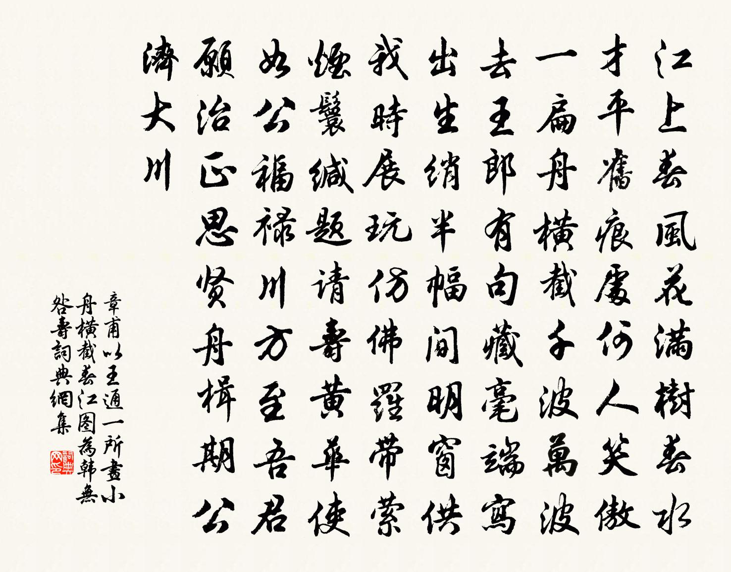 詩詞名句歷史字典書法欣賞書法字典國語詞典說文解字康熙字典古漢語字典標 題 作 者 詩 句 以王通一所畫小舟橫截春江圖為韓無咎壽作者:章甫 朝代:宋代原文江上春風花滿樹,春水才平舊痕處。何人笑傲一扁舟,橫截千波萬波去。王郎有句藏毫端,寫出生綃半幅間。明窗供我時展玩,仿佛羅帶縈煙鬟。緘題請壽黃華使,如公福祿川方至。吾君願治正思賢,舟楫期公濟大川。詩詞問答問:《以王通一所畫小舟橫截春江圖為韓無咎壽》的作者是誰?答:章甫問:該詩寫於哪個朝代?答:宋代書法欣賞以王通一所畫小舟橫截春江圖為韓無咎壽書法作品詩詞推薦秦樓月/憶秦娥陳三聘〔宋代〕青膏集。新雷忽起龍蛇蟄。龍蛇蟄。柳塘風快,水流聲急。傷心有淚憑誰浥。尊前容易青衫濕。青衫濕。渡頭人去三月三日欲過小園聞海棠未開翦韭獨酌有懷舒岳祥〔宋代〕尋芳自是少閒身,世故紛紛更咈人。一籌小園初韭脆,三杯荒舍晚醅新。雲藏柳葉裁難斷,月入梨花辨不真。每歲愛柳潘璵〔宋代〕萬紫千紅錦織成,一宵風雨盡飄零。爭如楊柳全春色,不管春歸色自青。寄崇梵僧王維〔唐代〕崇梵僧。崇梵僧。秋歸覆釜春不還。落花啼鳥紛紛亂。澗戶山窗寂寂閒。峽里誰知有人事。郡中遙望空雲山。徽州葉司理送冬筍洪咨夔〔宋代〕凍雪晴邊白柄鑱,浴泥扶出錦繃衫。定知王謝家苗裔,風味生來便不凡。春從天上來 至元六年庚辰元日立春,將為山宋褧〔元代〕許可用大參,陳景議憲副旭日暾暾。爛春餅堆盤,壽酒盈尊。玉帛交錯,襟佩翩翻。想像虎豹天門。靄蓬萊雲氣,占春亭即事三首吳潛〔宋代〕薄霧輕煙柳際浮,階前細草綠初抽。年年春事年年恨,一擔擔來是白頭。依韻和戲題梅堯臣〔宋代〕楊州太守重交情,我欲西歸未得行。寒食尚賒花水近,妻孥煎去到天明。山中寄樊僕射(一作寄襄陽樊司空)於鵠〔唐代〕卻憶東溪日,同年事魯儒。僧房閒共宿,酒肆醉相扶。天畔雙旌貴,山中病客孤。無謀還有計,春谷種桑榆。寄公袞舍弟薛嵎〔宋代〕每恨世交薄,相期情最深。秋風一回首,明月兩關心。鶴病難為藥,砂頑不化金。餘生百計拙,耐可事清吟。小飛來亭二首楊長孺〔宋代〕拔地齊天可上不,倚岩危棧半空浮。偶然憶得垂堂戒,前猛還成新懦休。山居雜詩九十首曹勛〔宋代〕休宮伏畎畝,農事未歷覽。年豐則知喜,歲歉頗不鑒。螟蜮則曰蠖,不實乃名冇。生民惰與勤,天災未嘗濫。寄家書作徐照〔宋代〕屋頭桑葉大如錢,知是吳蠶第一眠。遠水忽來瀟岸沒,家書卻寄道州船。二月一日作陸游〔宋代〕狼藉梅花委道傍,山櫻已復占年光。檐消積雪時聞滴,衣覆殘爐剩得香。老馬已衰寧識路?寒龜未死且搘床。柴荊送甥回崇仁李劉〔宋代〕萬里七年艱險同,我車西去子舟東。教兒強學先循理,嫁女隨宜莫諱窮。注就歐詩勤琢削,續成漢紀更磨礲。鄉人燈下學書偶成孫應時〔宋代〕學書乃一樂,人或罕知趣。而我欲成癖,矻矻了朝暮。天資苦凡弱,師法非早悟。目力又已衰,怳若在煙霧。雖然山居十首陳造〔宋代〕山間有好事,時肯問何如。束送箸頭薤,鮮分匙面魚。披襟偕我飽,攬發為君梳。一笑塵勞外,都無病可祛。淵明圖唐寅〔明代〕五柳先生日醉眠,客來清賞榻無氈。酒資盡在東籬下,散貯黃金萬斛錢。次韻顏運使伏龍山諸葛祠堂二首項安世〔宋代〕大義炯如新,千年報國身。寧從東海死,不作帝秦人。次韻徐廷獻機宜送自釀石室酒范成大〔宋代〕清絕仍香如橘露,甘余小苦似松肪。官糟重濁那知此,付與街頭白面郎。名句推薦一顧傾人城,再顧傾人國。李延年《李延年歌》 心斷新豐酒,銷愁斗幾千。李商隱《風雨》 孤村落日殘霞,輕煙老樹寒鴉,一點飛鴻影下。白樸《天淨沙·秋》 寄言儔侶,莫負廣寒沈醉。文徵明《念奴嬌·中秋對月》 無言獨上西樓,月如鉤。李煜《相見歡·無言獨上西樓》 不知香積寺,數里入雲峰王維《過香積寺》 智欲圓而行欲方,膽欲大而心欲小。程登吉《幼學瓊林·卷三·人事》 風引龍虎旗,歌鐘昔追攀。李白《登邯鄲洪波台置酒觀發兵》 早梅發高樹,迥映楚天碧。柳宗元《早梅》 秋草獨尋人去後,寒林空見日斜時。劉長卿《長沙過賈誼宅》