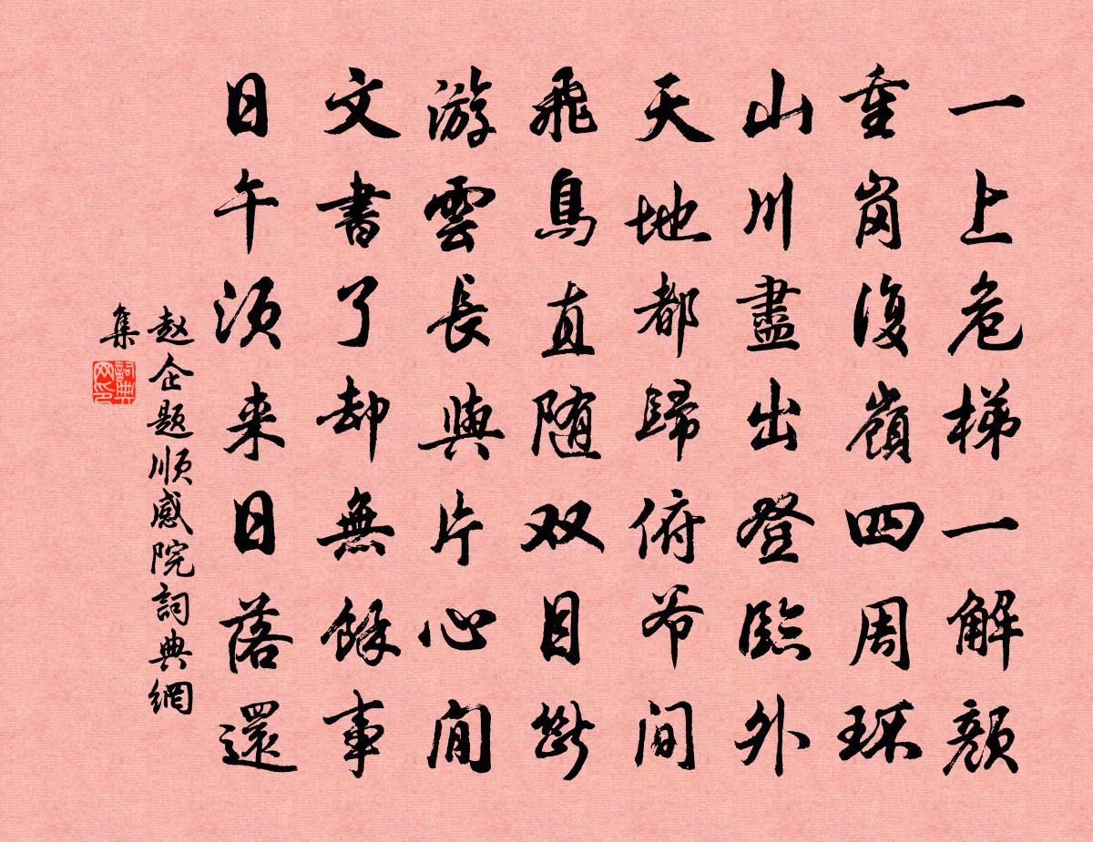 詩詞名句歷史字典書法欣賞書法字典國語詞典說文解字康熙字典古漢語字典標 題 作 者 詩 句 題順感院作者:趙企 朝代:宋代題順感院原文一上危梯一解顏,重崗復嶺四周環。山川盡出登臨外,天地都歸俯爺間。飛鳥直隨雙目斷,游雲長與片心閒。文書了卻無餘事,日午須來日落還。詩詞問答問:題順感院的作者是誰?答:趙企問:題順感院寫於哪個朝代?答:宋代趙企題順感院書法欣賞題順感院書法作品詩詞推薦甲寅歲雪一首蘇籀〔宋代〕冬燠陽淫遇上春,飛霙爽徹浩無垠。凌霄據壤平窪凸,破塊抽萌蝕腐陳。皎潔肌容宜夜覿,培堆靀髿詰朝新。勻勻光澤朱君輓詞四首林亦之〔宋代〕為官長者得聲名,唯諾公堂如父兄。欲作汝南耆舊傳,不須多語盡平生。楊妃菊趙肅遠〔宋代〕元是馬嵬山下魄,脫胎今復對西風。當時若使三郎見,又自東籬召入宮。訪吳元鼎如村五首韓元吉〔宋代〕我住城南君在西,柴門草長與人齊。不妨共踏溪津路,日日雲山入杖藜。西湖游上人相訪於白沙翌日如金山求詩章甫〔宋代〕江草隨春遠,沙鷗伴我閒。殷勤東去水,送子過金山。題西隱寺封敖〔唐代〕三年未到九華山,終日披圖一室間。秋寺喜因晴後賞,靈峰看待足時還。猿從有性留僧坐,雲靄無心伴客閒。勝事醉桃源 破軍王吉昌〔元代〕破軍雄鎮北方陰。牢封地戶深。真風高卷鎖猿心。氤氳氣制禽。三田貫,五神欽。元胎體變金。群魔離位九陽臨。養家苦馬鈺〔元代〕養家苦,戀塵緣。鋪謀活計望千年。奈凡軀,不久堅。修行好,結良緣。功成行滿不排年。做神仙,因志堅。金陵池上蘇泂〔宋代〕府園秋後一池荷,綠蓋縱橫百柄多。折盡再生錢樣葉,卻疑天氣復清和。故慶雲長老{恭共換人}贊周必大〔宋代〕七尺軀,歸底處。一尺素,寫得住。漁家傲可旻〔宋代〕佛贊西方經現在。廣長舌相三千界。為要眾生生信解。臨終邁。不修淨業猶何待。七寶池塘波一派。蓮華朵朵車輪水調歌頭(壽丘提刑)方岳〔宋代〕甓社有明月,夜半吐光寒。淮南草木飛動,秀出鬥牛間。自有秦沙以後,試問少游而下,誰捲入毫端。補袞仲山甫周參政惠書唁及亡兒開二首李石〔宋代〕顙馬非才具,蝸牛惜弊廬。風時 * 枕,風雨阻來車。藥裹衣巾內,梅花酒盞疏。江湖慰寂寞,一紙故人書。奉贈張荊州王昌齡〔唐代〕祝融之峰紫雲銜,翠如何其雪嶄岩。邑西有路緣石壁,我欲從之臥穹嵌。魚有心兮脫網罟,江無人兮鳴楓杉。王君浪淘沙令·簾外雨潺潺李煜〔五代〕簾外雨潺潺,春意闌珊。羅衾不耐五更寒。夢裡不知身是客,一晌貪歡。獨自莫憑欄,無限江山,別時容易見時難題茅山李尊師所居(一作秦系詩)嚴維〔唐代〕天師百歲少如童,不到山中更不逢。洗藥每臨新瀑水,步虛時繞最高峰。籬根五月留殘雪,座右千年蔭古松。此去同李十一醉憶元九白居易〔唐代〕花時同醉破春愁,醉折花枝作酒籌。忽憶故人天際去,計程今日到梁州。泛清溪入齊山孔武仲〔宋代〕轉轎南堤太阻長,不如乘興泛輕航。園林蔭翳清如簟,禽鳥將迎語有簧。溪是明河天上去,山疑方丈石中藏。衣巾登吳山作顧禧〔宋代〕紫雁高飛曉霧濃,西風峭削玉芙蓉。誰攜謝朓驚人句,更上吳山第一峰。息夫人廟羅隱〔唐代〕百雉摧殘連野青,廟門猶見昔朝廷。一生雖抱楚王恨,千載終為息地靈。蟲網翠環終縹緲,風吹寶瑟助微冥。玉顏名句推薦宣父猶能畏後生,丈夫未可輕年少。李白《上李邕》 此心終合雪,去已莫思量。虛中《送遷客》 香餌之下,必有懸魚;重賞之下,必有死夫。黃石公《三略·上略》 鈍學累功,不妨精熟顏之推《顏氏家訓·文章篇》 村北村南布穀忙,村前村後稻花香。方向《詠儋耳二首》 無由持一碗,寄與愛茶人。白居易《山泉煎茶有懷》 日暮東風怨啼鳥,落花猶似墜樓人。杜牧《金谷園》 誰言寸草心,報得三春暉。孟郊《遊子吟 / 迎母漂上作》 一寸光陰一寸金,寸金難買寸光陰。佚名《增廣賢文·上集》 出必告,反必面。居有常,業無變。李毓秀《弟子規·入則孝》