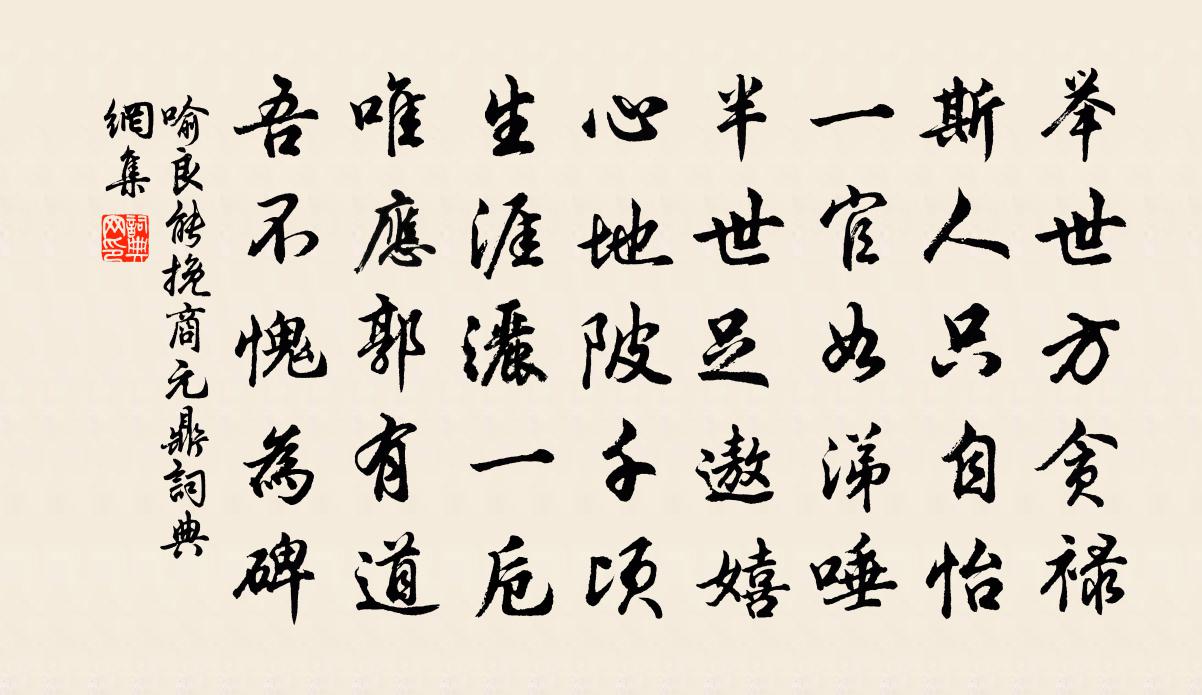 詩詞名句歷史字典書法欣賞書法字典國語詞典說文解字康熙字典古漢語字典標 題 作 者 詩 句 挽商元鼎作者:喻良能 朝代:宋代挽商元鼎原文舉世方貪祿,斯人只自怡。一官如涕唾,半世足遨嬉。心地陂千頃,生涯灑一卮。唯應郭有道,吾不愧為碑。詩詞問答問:挽商元鼎的作者是誰?答:喻良能問:挽商元鼎寫於哪個朝代?答:宋代喻良能挽商元鼎書法欣賞挽商元鼎書法作品詩詞推薦歸舟已具李憲樓倉有約盜賊梗道見避亂者可憐戴復古〔宋代〕倉猝拋家舍,遑遑走道塗。依山結茅廣,摘草當園蔬。老稚朝朝哭,生涯物物無。避軍兼避寇,何日得安居。送劉梅溪游句曲陳深〔宋代〕華發蕭蕭兩發秋,醉眠花竹舊風流。天心橋畔行將老,地肺山中隱去休。半嶺白雲容可玩,一庵明月尚空留。西風鵲踏枝/蝶戀花歐陽修〔宋代〕一曲尊前開畫扇。暫近還遙,不語仍低面。直至情多緣少見。千金不直雙回眄。苦恨行雲容易散。過盡佳期,爭向復至曹娥堰寄剡縣丁元珍王安石〔宋代〕溪水渾渾來自北,千山抱水清相射。山深水急無艇子,欲從故人安可得。故人昔日此水上,樽酒扁舟慰行役。津亭江陵送趙知縣二首項安世〔宋代〕萬壑千岩相送時,靈星小雪上豐頤。南雲北夢重分首,撲漉繁霜滿瘦髭。功業向來真自許,頭顱今日遂如斯。英雄贈山陰崔明府方乾〔唐代〕用心何況兩衙間,退食孜孜亦不閒。壓酒曬書猶檢點,修琴取藥似交關。笙歌入夜舟中月,花木知春縣裡山。平叔寄游山友人方岳〔宋代〕不是山陰訪戴船,真成迷局燦柯仙。逕行處用規摹取,歸與都人作畫傳。馬詩二十三首·其一李賀〔唐代〕龍脊貼連錢,銀蹄白踏煙。無人織錦韂,誰為鑄金鞭。端午帖子九首曹勛〔宋代〕朝下仙班曉景遲,步搖香認九華妃。花藏窈窕知金屋,亭照回波在翠微。正月十一日迎駕呈諸同舍曾鞏〔宋代〕錦袍周衛一翻新,警蹕朝嚴下紫宸。俗眼望來猶眩日,天顏回處自生春。行齊鵷鷺常隨仗,步穩驊騮不起塵。歸路溪亭宋祁〔宋代〕規日平空晚,澄波極望鮮。簾飛古陶瓦,梁負會稽椽。戰綠低寒杜,漂紅泊晚蓮。黃昏無限意,江月對娟娟。晨謁書所見宋庠〔宋代〕紺幰鳴珂萬蓋翔,九門冠劍擁晨光。城連南北長安斗,殿倚東西太極堂。雲里銅烏風作籟,天邊金掌露成霜。微生江神子(初至休寧冬夜作)葛勝仲〔宋代〕昏昏雪意慘雲容。獵霜風。歲將窮。流落天涯,憔悴一衰翁。清夜小窗圍獸火,傾酒綠,借顏紅。官梅疏艷小壺中遣興蔡戡〔宋代〕世味只如許,人情亦可憐。禪心甘寂寞,病體覺輕便。夢裡身非我,閒中日似年。還家真復樂,此去若登仙。次韻答德瑞陳造〔宋代〕詩客胸襟舊絕塵,惠然分我一緘春。裁成蜀國添花錦,貴重丹砂伏火銀。暮雨朝雲知有夢,瓊枝璧月可無人。要須贈程君以忠楊君泰之方回〔宋代〕後生可畏古云然,斗大荒城得兩賢。句眼端能敲一字,吟腸何啻著千年。淡中滋味參須透,聖處工夫語不傳。我有游石頭城方回〔宋代〕臥龍起草廬,扶漢有餘忠。欲結紫髯客,共追黃星公。一言根本定,萬里氛翳空。指此為虎踞,長嘯吞西風。夫豈下橫山,灘頭望金華山四首楊萬里〔宋代〕道是蘭溪水較寬,蘭溪欲到怪生難。後船隻羨前船快,不覺前船閣在灘。農舍陸游〔宋代〕杜門雖與世相違,未許人嘲作計非,長綆雲邊牽犢過,小舟月下載犁歸。帆徐夤〔唐代〕豈勞孤棹送行舟,輕過天涯勢未休。斷岸曉看殘月掛,遠灣寒背夕陽收。川平直可追飛箭,風健還能溯急流。幸遇名句推薦莫愁前路無知己,天下誰人不識君。高適《別董大二首》 天外黑風吹海立,浙東飛雨過江來。蘇軾《有美堂暴雨》 六出飛花入戶時,坐看青竹變瓊枝。高駢《對雪》 二月黃鶯飛上林,春城紫禁曉陰陰。錢起《贈闕下裴舍人》 尋常一樣窗前月,才有梅花便不同。杜耒《寒夜》 莫莫高山,深谷逶迤佚名《紫芝歌》 夜來雨橫與風狂,斷送西園滿地香。阿魯威《湘妃怨·夜來雨橫與風狂》 風回小院庭蕪綠,柳眼春相續。李煜《虞美人·風回小院庭蕪綠》 媼引濃妝女,兒扶爛醉翁。范成大《寒食郊行書事》 芳洲拾翠暮忘歸,秀野踏青來不定。張先《木蘭花·乙卯吳興寒食》