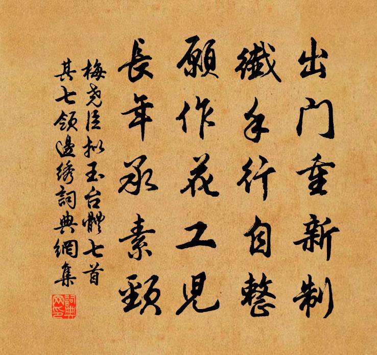 詩詞名句歷史字典書法欣賞書法字典國語詞典說文解字康熙字典古漢語字典標 題 作 者 詩 句 擬玉台體七首其七領邊繡作者:梅堯臣 朝代:宋代擬玉台體七首其七領邊繡原文出門重新制,縴手行自整。願作花工兒,長年承素頸。詩詞問答問:擬玉台體七首其七領邊繡的作者是誰?答:梅堯臣問:擬玉台體七首其七領邊繡寫於哪個朝代?答:宋代問:梅堯臣的名句有哪些?答:梅堯臣名句大全梅堯臣擬玉台體七首其七領邊繡書法欣賞擬玉台體七首其七領邊繡書法作品詩詞推薦哭棲白供奉林寬〔唐代〕侍輦才難得,三朝有上人。琢詩方到骨,至死不離貧。風帳孤螢入,霜階積葉頻。夕陽門半掩,過此亦無因。倚篷顧逢〔宋代〕山光遠近青,盡入倚篷吟。夜雨一番過,春流幾寸深。車聲驚睡犢,帆影閃飛禽。村舍偏瀟灑,家家楊柳陰。山居丁謂〔宋代〕峒口清香徹海濱,四時芬馥四時春。山多綠桂憐同氣,谷有幽蘭讓後塵。草解忘憂憂底事,花能含笑笑何人。爭如金陵雜興二百首蘇泂〔宋代〕三月春歸未是歸,綠陰端的勝花時。絕憐首夏清和句,一字其間幾個知。寄叔廣陳藻〔宋代〕君在於潛未語婦,姑蘇我到事多違。母衰妹弱那能幹,婦拙兒頑孰可依。海近一天風漠漠,朔寒兩地雪霏霏。行裝十二月中旬書戴溪亭王銍〔宋代〕天上東風轉斗星,天涯羇客尚飄萍。道塗況復經殘歲,風雪那堪宿旅亭。春到怯添雙鬢白,夜寒愁對一燈青。殘年嘲劉師老佚名〔宋代〕大府朝天升穆老,尚書倒地落劉郎。樓上曲張元乾〔宋代〕樓外夕陽明遠水。樓中人倚東風裡。何事有情怨別離。低鬟背立君應知。東望雲山君去路。斷腸迢迢盡愁處。明朝戲下歌司馬光〔宋代〕項王初破函關兵,氣壓山河風火明。旌旗金鼓四十萬,夜泊鴻門期曉戰。關東席捲五諸侯,沛公君臣相視愁。幸因馬上轉韻王安石〔宋代〕三月楊花迷眼白,四月柳條空老碧。年光如水盡東流,風物看看又到秋。人世百年能幾許,何須戚戚長辛苦。富貴詠史下關羽四首陳普〔宋代〕巴山漢水本興劉,諸葛才華備贊留。但得關髯師廣武,北州韓信在南州。次史髯韻二首陳造〔宋代〕已誤西湖鷗鷺約,客舟西上更徘徊。故人益嘆天涯遠,懷抱何從得好開。八聲甘州 贈易自然禱雨有感梁寅〔元代〕喜神龍飛雨遍秋郊,黃河自天來。是蟠溪逸士,胸中造化,掌上雲雷。壇峙吟峰東畔,稽首望仙台。絳節霓衣,擁冉冉雲(牡丹盛開,招同官小飲,賦此)盧炳〔宋代〕雨洗千紅又春晚。留牡丹、倚闌初綻。嬌婭奼、偏賦精神君看。算費盡、工夫點染。帶露天香最清遠。太真妃、院送子婿崔真父歸長城劉長卿〔唐代〕送君卮酒不成歡, * 辭家事伯鸞。桃葉宜人誠可詠,柳花如雪若為看。心憐稚齒鳴環去,身愧衰顏對玉難。惆悵歲晚懷古王安石〔宋代〕先生歲晚事田園,魯叟遺書廢討論。問訊桑麻憐已長,按行松菊喜猶存。農人調笑追尋壑,稚子歡呼出候門。遙謝雲居還值旱懷舊遊寄楊文仲二首王阮〔宋代〕憶扶湘竹杖,共扣趙州關。山好不容住,水流今載還。卻從天上下,似出鏡中間。笑問楊扶子,何時再得閒。初入汴強至〔宋代〕山勢隨淮斷,河流帶地渾。嚴風疏樹影,落日露沙痕。客興雙蓬鬢,吟懷一酒尊。舟行那敢緩,霜意滿乾坤。次程南仲韻五首楊公遠〔宋代〕生意窗前草不除,悠悠蒼玉自扶疎。貧針入骨誰憐我,富欲掀天命屬渠。學圃頻觀種樹傳,杜門幾似絕交書。有時往體趙崇鉘〔宋代〕志士惜流光,遊子念長道。流光如奔霆,長路漫浩浩。飢人忽夢飽,百憂愁傾倒。真妄安足論,榮名以為寶。名句推薦脫衣換得商山酒,笑把離騷獨自傾。王禹偁《清明日獨酌》 傍鄰聞者多嘆息,遠客思鄉皆淚垂。李頎《聽安萬善吹觱篥歌》 無言獨上西樓,月如鉤。李煜《相見歡·無言獨上西樓》 中山人予之貓,貓善捕鼠及雞。劉基《乞貓》 塞垣多少思歸客,留著長條贈遠遊。朱栴《官橋柳色》 君子以鐘鼓道志,以琴瑟樂心。荀子《荀子·樂論》 射人先射馬,擒賊先擒王。杜甫《前出塞九首·其六》 行到水窮處,坐看雲起時。王維《終南別業 / 初至山中 / 入山寄城中故人》 懸衡而知平,設規而知圓。韓非及後人《韓非子·飾邪》 黃昏庭院柳啼鴉,記得那人,和月折梨花。陳亮《虞美人·東風盪颺輕雲縷》