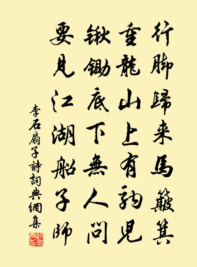 詩詞名句歷史字典書法欣賞書法字典國語詞典說文解字康熙字典古漢語字典標 題 作 者 詩 句 扇子詩作者:李石 朝代:宋代扇子詩原文行腳歸來馬簸箕,重龍山上有駒兒。鍬鋤底下無人問,要見江湖船子師。詩詞問答問:扇子詩的作者是誰?答:李石問:扇子詩寫於哪個朝代?答:宋代李石扇子詩書法欣賞扇子詩書法作品詩詞推薦箋年老逢春八首年老才會惜芳菲邵雍〔宋代〕箋云:一歲正榮處,三春特盛時。是花堪愛惜,況見好花枝。秋日章甫〔宋代〕奔走傷形役,艱難感物華。澹煙籠遠樹,小雨濕寒沙。喚客尊無酒,撩人菊有華。弟兄書不至,過盡雁行斜。送楊八給事赴常州白居易〔唐代〕無嗟別青瑣,且喜擁朱輪。五十得三品,百千無一人。須勤念黎庶,莫苦憶交親。此外無過醉,毗陵何限春。勝仲少卿公岩桂並詩二絕用韻和之鄭剛中〔宋代〕秋桂荷君親拍贈,傾盤高插傍胡床。兒童謾自溫金鴨,三日爐金不敢香。偈頌一百零九首釋可湘〔宋代〕言中彼此帶幽玄,盡向言中辨正偏。孤負一條官驛路,茫茫沉在月明前。少微峰陳岩〔宋代〕隱居不惠不夷間,拜爵山中驛使還。身遠觚稜幾千里,少微星影墮空山。烏塘王安石〔宋代〕地僻居人少,山稠伏獸多。怒狸朝搏雁,嚵虎夜窺騾。籬落生孫竹,門庭上女蘿。未應悲寂寞,六載一經過。過摘星嶺蘇頌〔宋代〕路無斥堠惟看日,嶺近雲霄可摘星。握節偶來觀國俗,漢家恩厚一方寧。逢友人赴闕盧延讓〔唐代〕正當天下待雍熙,丹詔征來早為遲。倚馬才高猶愛藝,問牛心在肯容私。吏開黃閣排班處,民擁青門看入時。卻笑六月望參孔武仲〔宋代〕宿露初晞物向陽,袍鞋如水轉迴廊。天開北極星辰正,風應南熏殿閣涼。蓂萊已瞻圓魄就,槐花初覆廣庭香。朝廷贈姚季安曾豐〔宋代〕七年三度奉從容,今見吾驚大不同。雲霧蟠胸蒸疾雨,雷霆挾筆駕長風。懸知文與意俱到,政要眼隨心並空。度嶺贈高處士許渾〔唐代〕宅前雲水滿,高興一書生。垂釣有深意,望山多遠情。夜棋留客宿,春酒勸僧傾。未作乾時計,何人問姓名。閱常山志感賦許楚〔清代〕萬戶凋傷戰伐余,登豐舊里盡丘墟。浮空石爛思遺履,清獻岩深蹇著書。瘦馬半飧鄰縣草,哀鴻常擁令君車。靈符鳳來朝(五日感事)史達祖〔宋代〕暈粉就妝鏡。掩金閨、彩絲未整。趁無人、學指鴛鴦頸。恨誰踏、蘚花徑。一夢蒲香葵冷。墮銀瓶、脆繩掛井。扇秋晚十詠散策李彌遜〔宋代〕散棗經崗路,牛羊歸徑深。水窮人小立,山靜客微吟。點點稻花雨,團團榕葉陰。田翁罷爭席,明日共幽尋。菩薩蠻 飲山亭感舊劉因〔元代〕種花人去花應道。花枝正好人先老。一笑問花枝。花枝得幾時。人生行樂耳。今古都如此。急欲醉莓苔。前村酒未慶塗權尉三首陳元晉〔宋代〕歲月遒於赴壑蛇,功名政要及年華。平淮猶自須裴度,釣渭那能老子牙。舞袖巧縣嫌地褊,酒杯相屬記天涯。期君滿江紅 贈虛庵李道純〔元代〕日用工夫,只一味、存虛抱素。會殊途同歸,一致百慮。紫極宮中元氣息,調我鼎內三花聚。問安爐、立鼎事如何逢舊白居易〔唐代〕我梳白髮添新恨,君掃青蛾減舊容。應被傍人怪惆悵,少年離別老相逢。疇依王柏〔宋代〕迪予朱子,理一分殊。汛掃淫詖,煌煌四書。有析其精,一字萬鈞。有會於極,萬古作程。名句推薦黃昏庭院柳啼鴉,記得那人,和月折梨花。陳亮《虞美人·東風盪颺輕雲縷》 終然獨不見,流淚空自知。李白《獨不見》 葡萄美酒夜光杯,欲飲琵琶馬上催。王翰《涼州詞二首·其一》 零淚向誰道,雞鳴徒嘆息。沈約《夜夜曲》 忽見陌頭楊柳色,悔教夫婿覓封侯。王昌齡《閨怨》 十年離亂後,長大一相逢。李益《喜見外弟又言別》 嗚呼!楚雖三戶能亡秦,豈有堂堂中國空無人!陸游《金錯刀行》 北風利如劍,布絮不蔽身。白居易《村居苦寒》 有誰知我此時情,枕前淚共階前雨,隔個窗兒滴到明。聶勝瓊《鷓鴣天·別情》 敵之大,無過不知;禍之烈,友敵為甚。來俊臣《羅織經·制敵卷第五》