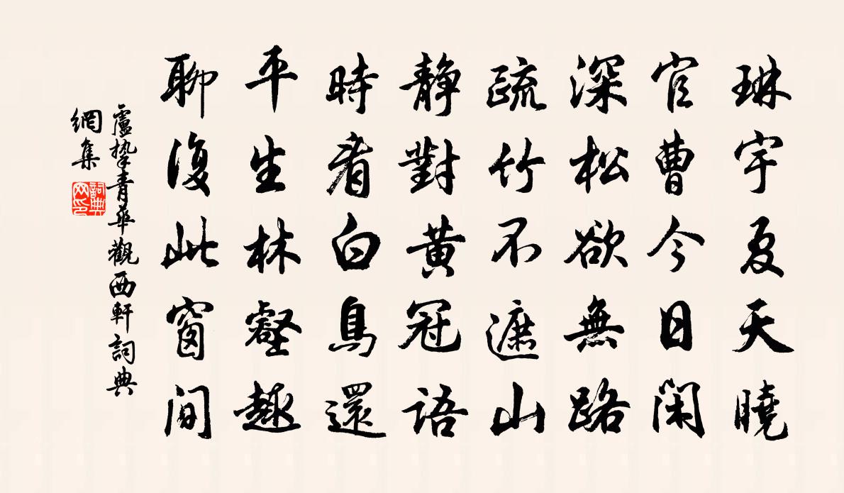 詩詞名句歷史字典書法欣賞書法字典國語詞典說文解字康熙字典古漢語字典標 題 作 者 詩 句 青華觀西軒作者:盧摯 朝代:元代青華觀西軒原文琳宇夏天曉,官曹今日閒。深松欲無路,疏竹不遮山。靜對黃冠語,時看白鳥還。平生林壑趣,聊復此窗間。詩詞問答問:青華觀西軒的作者是誰?答:盧摯問:青華觀西軒寫於哪個朝代?答:元代問:青華觀西軒是什麼體裁?答:五律盧摯青華觀西軒書法欣賞青華觀西軒書法作品注釋元詩別裁集詩詞推薦鄭宋用前韻見示因亦和答四首韓元吉〔宋代〕九陌歌呼屬後游,一蓑風景付漁舟。相逢且向南溪看,玉作靈山萬石樓。遇昱嶺方恬〔宋代〕直上最高頭,無人獨少留。萬山皆在下,千里入雙眸。馬傍松邊立,雲從腳底浮。倚天一長嘯,紅日滿滄洲。鷓鴣鄭谷〔唐代〕暖戲煙蕪錦翼齊,品流應得近山雞。雨昏青草湖邊過,花落黃陵廟裡啼。遊子乍聞征袖濕,佳人才唱翠眉低。相呼和魏定父王之道〔宋代〕十里南溪路,思君一望間。黃花秋色老,紅葉露痕殷。似說親朋集,遙知杖屢閒。徘徊松徑晚,踏破紫苔斑。錢虢州以三堂絕句見寄,因以本韻和之白居易〔唐代〕同事空王歲月深,相思遠寄定中吟。遙知清淨中和化,只用金剛三昧心。第八回回前詩曹雪芹〔清代〕古鼎新烹鳳髓香,那堪翠斝貯瓊漿。莫言綺縠無風韻,試看金娃對玉郎。眼兒媚·酣酣日腳紫煙浮范成大〔宋代〕酣酣日腳紫煙浮。妍暖破輕裘。困人天色,醉人花氣,午夢扶頭。春慵恰似春塘水,一片縠紋愁。溶溶泄泄,東風論語絕句一百首張九成〔宋代〕壯志如何便遽忘,故宜一旦問為邦。行 * 與吾夫子,不類當時狷與狂。早發杜荀鶴〔唐代〕東窗未明塵夢蘇,呼童結束登征途。落葉鋪霜馬蹄滑,寒猿嘯月人心孤。時逆帽檐風颳頂,旋呵鞭手凍粘須。青雲和之美舟行雜詩八首船行遇風司馬光〔宋代〕蔡水僅成波,不若江湖濬。誠無頃側憂,纜弱終難進。旅遊陸游〔宋代〕本自無心落市朝,不妨隨處狎漁樵。螺青點出暮山色,石綠染成春浦潮。縣驛下時人語鬧,寺樓倚處客魂消。流年瓊花張璪〔宋代〕此花已去不須嗟,亡國亡家總為他。父老不知前日事,逢人口口道瓊花。鷓鴣天 己酉之秋,苕溪記所見姜夔〔宋代〕京洛風流絕代人,因何風絮落溪津。籠鞋淺出鴉頭襪,知是凌波縹緲身。紅乍笑,綠長顰,與誰同度可憐春。鴛鴦送胡汝明待制赴鎮桂林葛立方〔宋代〕今代人中傑,攄忠久贊襄。摛文揮鏤管,積學儷青箱。體道經為笥,臨機智作囊。威名知草木,義勇震戎羌。玄女病起五首劉克莊〔宋代〕躬圭寶箑俱藏起,出入惟消笠與簑。農說雨暘差有準,客談間諜易傳訛。豐年海熟田尤熟,新地朝和野亦和。縱使宿五步港一首王阮〔宋代〕兩岸各風物,四年三往還。舟中五步港,雲外九華山。路遠虞衣闕,囊空慮食艱。大江吾隘爾,天地一魚灣。醉蓬萊(林鐘商)柳永〔宋代〕漸亭皋葉下,隴首雲飛,素秋新霽。華闕中天,鎖蔥蔥佳氣。嫩菊黃深,拒霜紅淺,近寶階香砌。玉宇無塵,金莖次西和韻仇遠〔宋代〕貧是儒家事,生平畏四知。燈花空送喜,瓶粟不供炊。湖海心終在,田園計未遲。願同華山叟,驢背倒能騎。謝惠詩張明中〔宋代〕君詩來貺我難當,語帶誠齋句妙香。鮫室垂垂新下泣,蠙珠顆顆爛生光。魂飛錦里花爭巧,夢到池塘草又芳。早晚蝶戀花周起〔宋代〕岳佐星儲生佐聖。真道宏才,濟世功名盛。久踐機衡宣密命。逢時力贊無為政。明主得賢朝野慶。晝按從容,帝寵名句推薦風送梅花過小橋,飄飄。趙顯宏《晝夜樂·冬》 那堪更被明月,隔牆送過鞦韆影。張先《青門引·春思》 塞垣多少思歸客,留著長條贈遠遊。朱栴《官橋柳色》 生亦我所欲,所欲有甚於生者,故不為苟得也。孟子《孟子·告子章句上·第十節》 何處飛來林間鵲,蹙踏松梢微雪。辛棄疾《賀新郎·把酒長亭說》 攀出牆朵朵花,折臨路枝枝柳。關漢卿《一枝花·不伏老》 念佳人、音塵別後,對此應解相思。晁端禮《綠頭鴨·詠月》 有田不耕倉廩虛,有書不讀子孫愚。佚名《增廣賢文·上集》 楚鄉飛鳥沒,獨與碧雲還。錢起《送夏侯審校書東歸》 夢魂慣得無拘檢,又踏楊花過謝橋。晏幾道《鷓鴣天·小令尊前見玉簫》