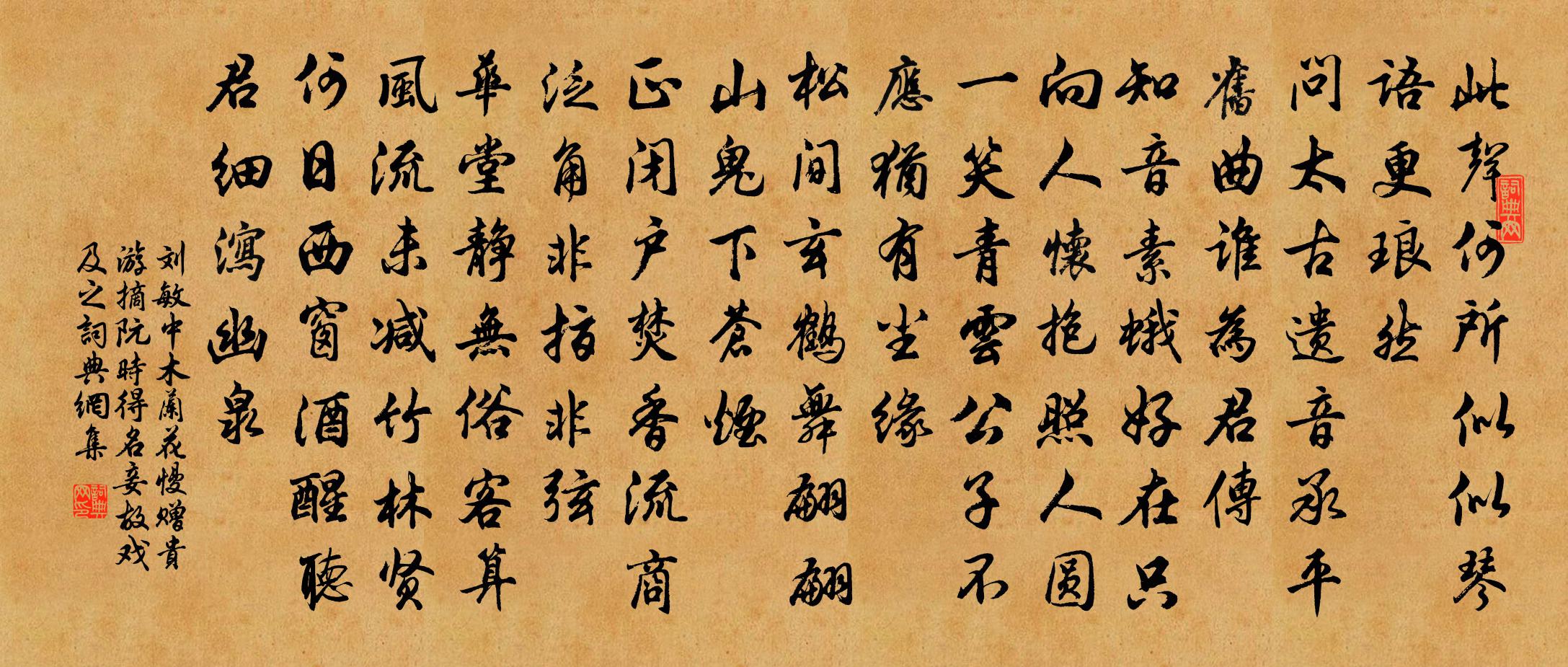 詩詞名句歷史字典書法欣賞書法字典國語詞典說文解字康熙字典古漢語字典標 題 作 者 詩 句 木蘭花慢 贈貴游摘阮,時得名妾,故戲及之作者:劉敏中 朝代:元代原文此聲何所似,似琴語、更琅然。問太古遺音,承平舊曲,誰為君傳。知音素蛾好在,只向人懷抱照人圓。一笑青雲公子,不應猶有塵緣。松間玄鶴舞翩翩。山鬼下蒼煙。正閉戶焚香,流商泛角,非指非弦。華堂靜無俗客,算風流、未減竹林賢。何日西窗酒醒,聽君細瀉幽泉。詩詞問答問:《木蘭花慢 贈貴游摘阮,時得名妾,故戲及之》的作者是誰?答:劉敏中問:該詩寫於哪個朝代?答:元代問:該詩是什麼體裁?答:詞書法欣賞木蘭花慢 贈貴游摘阮,時得名妾,故戲及之書法作品詩詞推薦和北游蘇頌〔宋代〕銜命初開朔土游,故人威重肯回眸。旌旗在列千餘騎,棨戟遙臨十一州。令尹投兵方秉羽,羊公臨塞但輕裘。諸賢送魏簡能東遊二首李涉〔唐代〕獻賦論兵命未通,卻乘羸馬出關東。灞陵原上重回首,十載長安似夢中。燕市悲歌又送君,目隨征雁過寒雲。孤亭蝶戀花(四首)莊棫〔清代〕城上斜陽依碧樹。門外斑騅,見了還相顧。玉勒珠鞭何處住?回頭不覺天將暮。風裡餘花都散去。不省分開,何日送沈信臣赴試南宮五首韓元吉〔宋代〕吾謀不用可無人,小技文章亦有神。一第區區兒戲耳,請君折取桂為薪。漫興劉克莊〔宋代〕保社有幽子,戶庭無雜賓。若非負苓者,即是耦耕人。筇穩慵呼馬,蔬甘勝擘麟。篋中詩又滿,誰謂此翁貧。喜遷鶯(上巳游涵碧)曹冠〔宋代〕艷陽時序。向祓禊芳辰,登臨仙府。碧水澄虛,修篁聳翠,夾徑蕙蘭香吐。春晚巧鶯聲碎,風卷飛紅無數。凝望處賦祝次仲八景遠浦歸帆劉學箕〔宋代〕歸鷺林邊白,落霞天際明。蒲帆載風急,征棹逐鷗輕。稚子候江滸,遙聞嬉笑聲。桂陽走筆呈以道曹彥約〔宋代〕別後蓬丘老,分杯歲又闌。發因求道白,心但濟時丹。瘧鬼三秋熱,河魚六月寒。不圖梅影夜,對榻共平安。寫真澹交〔唐代〕圖形期自見,自見卻傷神。已是夢中夢,更逢身外身。水花凝幻質,墨彩染空塵。堪笑予兼爾,俱為未了人。再和元禮春懷十首黃庭堅〔宋代〕滯夢停愁亂性靈,安眠滅念閉幽扃。體中忽覺有佳處,讀易一肩如酒醒。彥執賞予詩張九成〔宋代〕年來百念灰,求友良未已。一昨竄逐來,萬事風過耳。忽得故人書,驚喜或不寐。人生等行客,斯姑小憩。吟詩本皇雅十首《天監》四章尹洙〔宋代〕帝朝法宮,左右宗公。忮夫悍士,以雍以容。爾居爾室,爾工爾農。既息既養,惟天子功。逍遙樓建都思〔宋代〕逍遙留古蹟,勝景浩無窮。霧鎖山城市,煙藏水府宮。峰巒霄漢外,棟宇畫書中。百草業深綠,群花綻淺紅。宮詞王仲修〔宋代〕元夜笙歌滿上都,九霄皓月舞蟾蜍。燭龍穿仗來天際,萬疊黃雲復帝車。清心堂為余宰題程應申〔宋代〕靈台元自與天通,一點塵飛失太空。六鑿爾時俱偃息,八窗何處不玲瓏。公田有秫猶難色,暮夜無金即直躬。要識贈趙月麓之霅衛宗武〔宋代〕乍合成乍離,歲月何飄忽。重來吾愈老,喜復遂良覿。月麓號新改,簪裳亦殊昔。議論羲皇前,咳唾煙霞出。囊中榕台二絕劉克莊〔宋代〕拔地高崖如鐵色,拂天老樹作寒聲。他年記宿榕台夜,便是南歸第一程。賀溫正言賜紫王禹偁〔宋代〕密疏封來乙夜看,延英召對議安邊。榮頒紫綬同三品,舊賜朱衣未一年。白獸捧樽斟御酒,金魚垂鬣惹爐煙。從今【越調】柳營曲_冬夜懷友暮周德清〔元代〕冬夜懷友暮雲收,冷風颼,到中宵月來清更幽。倚遍江樓,望斷汀洲,雪月照人愁。舍梅花誰是交遊?飲松醪自想送竹枕與勾希載太博喻良能〔宋代〕誰人彩斲渭川村,有節輪囷秋竹根。割我便便春晝睡,乞君栩栩夢中魂。名句推薦惟有綠荷紅菡萏,卷舒開合任天真。李商隱《贈荷花》 軍歌應唱大刀環,誓滅胡奴出玉關。徐錫麟《出塞》 稚子金盆脫曉冰,彩絲穿取當銀錚。楊萬里《稚子弄冰》 芳菊開林耀,青松冠岩列。陶淵明《和郭主簿·其二》 豈曰無衣?與子同袍。佚名《秦風·無衣》 離恨又迎春,相思難重陳。和凝《菩薩蠻·越梅半拆輕寒里》 夫為將者,必有腹心、耳目、爪牙。諸葛亮《將苑·卷一·腹心》 織婦何太忙,蠶經三臥行欲老。元稹《織婦詞》 彭蠡湖天晚,桃花水氣春。白居易《彭蠡湖晚歸》 大漠風塵日色昏,紅旗半卷出轅門。王昌齡《從軍行七首》