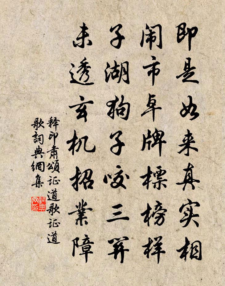詩詞名句歷史字典書法欣賞書法字典國語詞典說文解字康熙字典古漢語字典標 題 作 者 詩 句 頌證道歌證道歌作者:釋印肅 朝代:宋代頌證道歌證道歌原文即是如來真實相,鬧市卓牌標榜樣。子湖狗子咬三關,未透玄機招業障。詩詞問答問:頌證道歌證道歌的作者是誰?答:釋印肅問:頌證道歌證道歌寫於哪個朝代?答:宋代釋印肅頌證道歌證道歌書法欣賞頌證道歌證道歌書法作品詩詞推薦送人歸湖南釋了惠〔宋代〕白紙無端墨筆書,分明一句卻模糊。青燈夜雨湘江上,添得平沙落雁圖。朱雲傳宋祁〔宋代〕朱游英氣凜生風,瀕死危言悟帝聰。殿檻不修旌直諫,安昌依舊漢三公。偈傾一百六十九首釋智朋〔宋代〕德山棒,臨濟喝,拗曲作直。雲門餅,趙州茶,特地周遮。威音那畔,毫髮不差,山中是處有黃花。西江月仇遠〔宋代〕小立畫橋西畔,仙車驀送香風。多情問我太匆匆。疑是當年小宋。須識蓬山不遠,梨雲路杳無蹤。覺來斜月隔簾櫳次韻曾仲錫元日見寄蘇軾〔宋代〕蕭索東風兩鬢華,年年幡勝剪宮花。愁聞塞曲吹蘆管,喜見春盤得蓼芽。吾國舊供雲澤米,(定武齋酒用蘇州米。再次韻寄子由黃庭堅〔宋代〕想見蘇耽攜手僊,青山桑柘冒寒煙。騏驎墮地思千里,虎豹憎人上九天。風雨極知雞自曉,雪霜寧與菌爭年。何時和彥沖茉莉二首胡寅〔宋代〕易刻無瑕玉,難勻不汗敉。有誰同素絢,無物比生香。寶靨三年笑,水肌六月涼。畹蘭何足佩,懷勤枉沉湘。酴醾花高文虎〔宋代〕羽蓋珠旛上下蒙,倚欄碧動舞蛟龍。誰憐澹素朝天面,自現光明滿月容。楊柳風柔沾絮濕,薔薇露重染衣濃。典型上巳(一作上巳日寄韓公)唐彥謙〔唐代〕上巳接寒食,鶯花寥落晨。微微潑火雨,草草踏青人。涼似三秋景,清無九陌塵。與余同病者,對此合傷神。使北文天祥〔宋代〕使旃盡道有回期,獨陷羈臣去牧羝。小爾含沙渾小事,白雲飛處楚天低。郭氏抗雲樓薛嵎〔宋代〕宴坐群峰表,太空無一塵。青山獨往意,白首自由身。放鶴重霄闊,憑欄萬木春。紛紛荊棘里,跬步譜逡巡。早秋遊靈岩聞人滋〔宋代〕憑欄山翠濕蒙蒙,佛閣依然水殿風。欲採蓮花何處所,年年金井落梧桐。再作十絕寄胡伯負兵侍仲方尚書李元實〔宋代〕官職廬陵不是無,文章更亦擬歐蘇。若言直氣橫牛斗,但見人間說姓胡。頌古一百則釋正覺〔宋代〕狗子佛性有,狗子佛性無,直鉤元求負命魚。逐氣尋香雲水客,嘈嘈雜雜作分疏。平展演,大鋪舒,莫怪儂家不慎偈頌一百二十三首釋崇岳〔宋代〕十月瑞慶節,真人降中天。萬國葵藿心,虔祝一爐煙。龍圖鳳歷等乾坤,睿算彌隆億萬年。和東澗丁卯上元日見寄三絕句劉克莊〔宋代〕昔侍重瞳讀考工,老無隻字乾子公。故人化作累累冢,留得村翁與澗翁。沙頭送客和伯文陳杰〔宋代〕報答春光兩鬢華,荊南二月苦無花。津亭折柳清江駛,野寺觀棋白日斜。賦客不來樓背隰,霸功安在戟沉沙。歸途疏山塔釋紹曇〔宋代〕活被人埋汝水濆,新豐一曲杳無聞。可憐嬌舞曹家女,不嫁春風嫁白雲。雪中看梅花因書詩酒之興王禹偁〔宋代〕冬來滁上興何長,唯把吟情入醉鄉。雪片引詩勝玉帛,梅花勸酒似嬪嬙。凝眸未厭頻頻落,擁鼻還憐細細香。謫宦西湖絕句戲題韓元吉〔宋代〕淺白深紅幾樹花,波光浮動竹交斜。怪來詩思清人骨,知是西湖處士家。名句推薦山光悅鳥性,潭影空人心。常建《題破山寺後禪院》 一觴雖獨盡,杯盡壺自傾。陶淵明《飲酒·其四》 無花無酒過清明,興味蕭然似野僧。王禹偁《清明》 湘江千歲未為陵,水底魚龍應識字。鮑溶《襄陽懷古》 指也者,天下之所無也;物也者,天下之所有也。公孫龍《公孫龍子·指物論》 橫笛和愁聽,斜枝倚病看。崔道融《梅花》 久在樊籠里,復得返自然。陶淵明《歸園田居·其一》 眾口鑠金,積毀銷骨。司馬遷《史記·張儀列傳》 己之困辱宜忍,而在人則不可忍。洪應明《菜根譚·概論》 慧者心辯而不繁說,多力而不伐功,此以名譽揚天下。墨子《墨子·02章 修身》