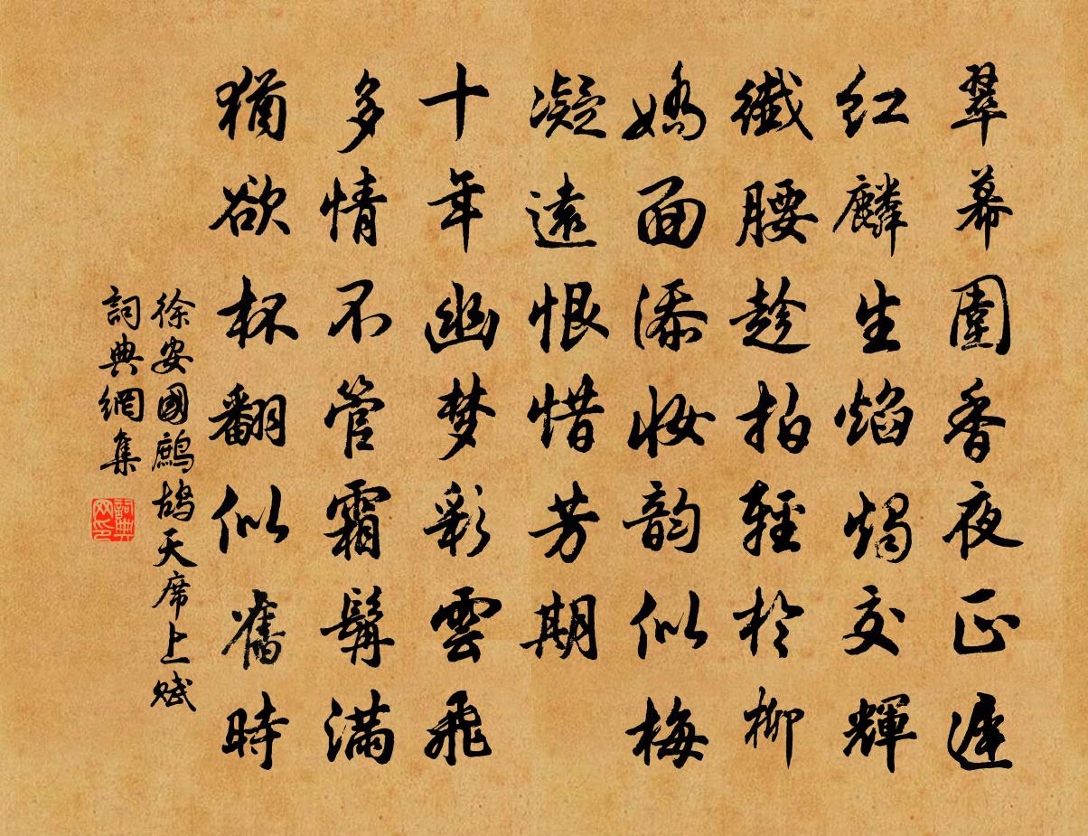 詩詞名句歷史字典書法欣賞書法字典國語詞典說文解字康熙字典古漢語字典標 題 作 者 詩 句 鷓鴣天(席上賦)作者:徐安國 朝代:宋代鷓鴣天(席上賦)原文翠幕圍香夜正遲。紅麟生焰燭交輝。纖腰趁拍輕於柳,嬌面添妝韻似梅。凝遠恨,惜芳期。十年幽夢彩雲飛。多情不管霜髯滿,猶欲杯翻似舊時。詩詞問答問:鷓鴣天(席上賦)的作者是誰?答:徐安國問:鷓鴣天(席上賦)寫於哪個朝代?答:宋代問:鷓鴣天(席上賦)是什麼體裁?答:詞徐安國鷓鴣天(席上賦)書法欣賞鷓鴣天(席上賦)書法作品詩詞推薦秋日過京口王鎡〔宋代〕晚風簌簌荻花飛,絡緯聲乾豆葉稀。水國易寒裘馬健,織金添作海青衣。偈六十九首釋道寧〔宋代〕摩竭掩室,非是通方。淨名杜詞,未為作略。總不恁麽,罕遇知音。方便門中,隨宜舉唱。春貼子周邦彥〔宋代〕鸞輅青旂殿閣寬,祠官奠璧下春壇。曉開魚鑰朝衣集,采勝飄揚百辟冠。句張釜〔宋代〕應有清名動九關。梅花張問陶〔清代〕一林隨意臥煙霞,為汝名高酒易賒。自誓冬心甘冷落,漫憐疏影太橫斜。得天氣足春無用,出世情多鬢未華。老死過樵川林時中趙若槸〔宋代〕建水樵川隔幾重,相逢孰意大江東。客行芳草垂楊外,春在柔桑小麥中。細雨疏田流水碧,殘霞擁樹遠林紅。浮生答劉仲美王令〔宋代〕莽莽晴川水,寥寥病客舟。來隨風浩蕩,去逐雨淹留。生計梁邊燕,歸心海上鷗。多慚故人句,欹臥一長謳。送惠沖禪客釋慧遠〔宋代〕老沖問法如春雷,忿怒那吒挽不回。龍馳虎驟劈箭催,暴風狂雨山嶽摧。我亦隨分圓機應,出必取也戰必勝。如珠魏漕彥成昔宰弋陽政績上聞召對改秩予適當詞胡寅〔宋代〕紹興乙卯選賢時,弋水鳴琴有去思。文石對敭言動聽,演綸無愧改官詞。劉吏部輓詞樓鑰〔宋代〕誰擾奚山眾,焚林獸已窮。徙薪能遠慮,下瀨得深攻。南嶠肩隨息,中朝論愈公。但知分謗喜,寧肯自論功。讀魏鶴山先生渠陽集五首方回〔宋代〕登門四十九年多,細讀公書百遍過。今歲摘抄靖州作,遁翁堪配不傳軻。放舟漫興胡宏〔宋代〕宿雨喜初霽,湖光照人明。狂風撼林木,萬里波濤清。放舟東山邊,蘭菊有奇英。實德自不掩,清香遠相迎。侵晨九月十五日邇英講論語終篇賜執政講讀史官燕蘇軾〔宋代〕長獨坐黃昏誰是伴紫薇花對紫薇郎翌日各以表謝又進詩一篇臣軾詩云繡裳畫袞雲垂地,不作成王剪桐戲。日高黃繖和張叔靖三絕鄭剛中〔宋代〕學圃自緣非肉食,杜門誰謂避閒名。大都野性如麋鹿,不爭將身朝市行。八聲甘州呂勝己〔宋代〕自秋來、多病意無聊,不作渭山游。想蘭菊凋疏,松筠茂密,亭館清幽。四望遙山萬疊,疊疊翠光浮。人道蓬萊島送趙汝楫分教建安胡仲弓〔宋代〕又領皋比走建安,青衿喜色上眉端。詩因老去難言別,氈到春來不覺寒。當日紫陽傳授學,他年粉省校讎官。聖門玉樓春辛棄疾〔宋代〕有無一理誰差別。樂令區區渾未達。事言無處未嘗無,試把所無憑理說。伯夷飢采西山蕨。何異搗齏餐杵鐵。仲尼自歸宗入靈溪觀孔武仲〔宋代〕紫霄峰下有禪林,瓦結青瑤地布金。聞道靈溪才咫尺,攜筇不覺後山深。田承嗣誑李寶臣偽讖佚名〔唐代〕二帝同功勢萬全,將田作伴入幽燕。史制乾晦甫輓詩魏了翁〔宋代〕菑川元自屬公孫,竟策詞場第一勛。理有是非寧撓奪,官無大小隻憂勤。紛紛白地皆灘瀨,豁豁青天亡片雲。滿腹名句推薦出不入兮往不反,平原忽兮路超遠。屈原《國殤》 風驅急雨灑高城,雲壓輕雷殷地聲。劉基《五月十九日大雨》 升堂坐階新雨足,芭蕉葉大梔子肥。韓愈《山石》 含愁獨倚閨幃,玉爐煙斷香微。毛熙震《清平樂·春光欲暮》 天地有正氣,雜然賦流形。文天祥《正氣歌》 沙場烽火連胡月,海畔雲山擁薊城。祖詠《望薊門》 雪粉華,舞梨花,再不見煙村四五家。關漢卿《大德歌·冬景》 秋在水清山暮蟬,洛陽樹色鳴皋煙。王昌齡《送狄宗亨》 夜來風雨聲,花落知多少。孟浩然《春曉》 善為吏者樹德,不善為吏者樹怨。韓非及後人《韓非子·外儲說左下》