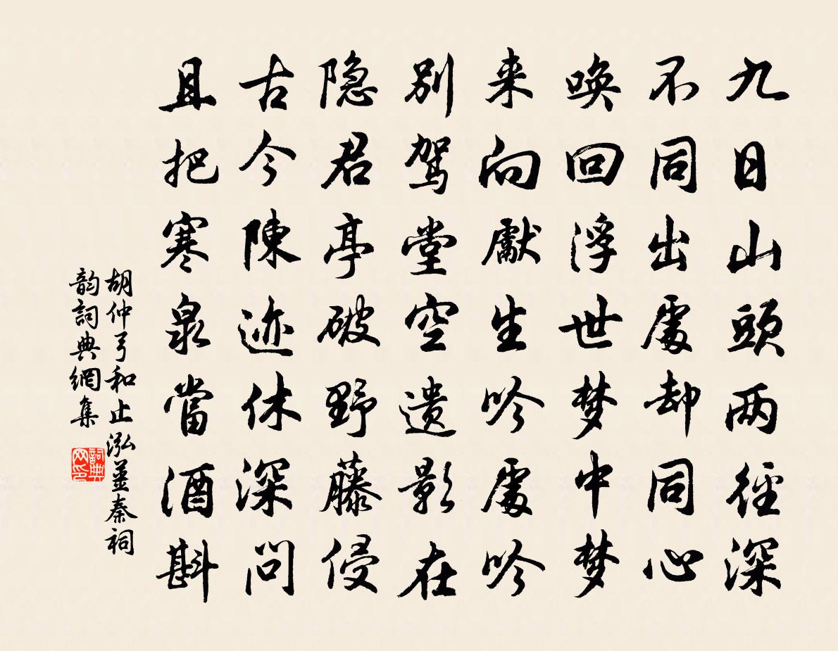 詩詞名句歷史字典書法欣賞書法字典國語詞典說文解字康熙字典古漢語字典標 題 作 者 詩 句 和止泓姜秦祠韻作者:胡仲弓 朝代:宋代和止泓姜秦祠韻原文九日山頭兩徑深,不同出處卻同心。喚回浮世夢中夢,來向先生吟處吟。別駕堂空遺影在,隱君亭破野藤侵。古今陳跡休深問,且把寒泉當酒斟。詩詞問答問:和止泓姜秦祠韻的作者是誰?答:胡仲弓問:和止泓姜秦祠韻寫於哪個朝代?答:宋代胡仲弓和止泓姜秦祠韻書法欣賞和止泓姜秦祠韻書法作品詩詞推薦次韻伯壽兄中秋玩月喻良能〔宋代〕中秋自古月華好,何況浮雲掃碧天。不比尋常三五夕,須知瀲灩十分圓。畫檐影轉猶宜飲,銀漢輝斜未忍眠。卻憶戲贈怡雲平老樓鑰〔宋代〕深山中拔出閒身,鬧市里尋得靜處。相逢了白話三通,那個是末後一句。不因聞所聞而來,不為見所見而去。嶺上十二月二十一日贈沃令張嵲〔宋代〕訟庭無事長苔衣,臥聽松風白晝遲。紙帳亂紋龜殼皺,道衫深綠鶴翎垂。麈犀揮處論前史,香篆銷時理秘辭。官事書樓考甫梅花百詠因徐直孺寄考甫方岳〔宋代〕以詩鳴者累百輩,誰與梅花可相配。只傳冰影月香詩,直到如今美無對。疏籬把住橫斜枝,了不肯受春風知。自非知常委順辭晃逈〔宋代〕紛然往事來,浮雲經大空。喧然是非聲,驚飈觸灌叢。古今無奈何,委順於其中。頌古五十七首釋道昌〔宋代〕有本無本,學益學損。搬運不時,提起卻穩。師子一滴迸六斛,驢乳散入別人屋。業識茫茫辨出時,烏雞不在蘆花題武夷五首白玉蟾〔宋代〕山聳千層青翡翠,溪流萬頃碧琉璃。遊人來此醉歸去,幾個親曾到武夷。和晏相公觸事成詠四首韓維〔宋代〕種竹患不多,既多亦為苦。長根走地脈,凌突敗垣堵。物情有利害,為爾執揮斧。代壽韓平原劉過〔宋代〕衣缽登庸復舊氈,文王尚父趙平原。自從慶曆到今日,只說開禧初改元。朝辟東齋廣東閣,夜看南極照南園。九霞和育王十二題七佛石李覯〔宋代〕萬物雖散殊,孰非道之體。何必石岩岩,方疑金色臂。句高似孫〔宋代〕夢無全覺久,詩只半聊奇。和史侍郎游澹岩韻六首曾協〔宋代〕瀟湘少駐便經年,自信孤忠莫問天。果為冕旒勤注想,不容泉石得高眠。飲城西贈金鄉宰韓宗恕晁補之〔宋代〕大夫盤中定州盞,三舉檐花舞凌亂。請君行盞且莫稽,為君起賦飲城西。城西古道如澗深,東風吹沙不見林。虛堂元忠示胡人下程圖梅堯臣〔宋代〕單于獵罷臥錦紅,解鞍休騎荒磧中。蒼駒騧駱六十匹,隱谷映坡分尾鬃。九皋五牛羊頗倍,沙草晚牧生寒風。貴賤春日有懷諸友楊時〔宋代〕憑几無聊晝掩扉,芬芬晴氣減春衣。隔簾相應鶯初語,背日連飛雁北歸。莫逆交遊千里別,遠來音信兩年稀。追尋謁館閣校勘歐陽公蔡高〔宋代〕此日登史閣,高風孰可追。學期明主佐,道許後生師。余豈能自信,公真不我欺。微躬托所厚,慚愧異新知。贈姬人韋莊〔唐代〕莫恨紅裙破,休嫌白屋低。請看京與洛,誰在舊香閨?寄樓恪齋館人兩黃丈董嗣杲〔宋代〕四明山水秀,二老器能殊。語劇欲流涕,吟清謾撚鬚。林香傳竹醉,溪影寫藤枯,愧我卑微者,無階助遠圖。從筆一首劉克莊〔宋代〕鄴下徐陳逐逝波,僅留老子尚婆娑。吾宗世有戴花舞,大耋誰能鼓缶歌。松下尋常無喝道,花間隨處有行窩。痴人曲肱詩二十首白玉蟾〔宋代〕跣足蓬頭破衲衣,悶來飲酒醉吟詩。廛中走遍無人識,我是東華大帝兒。名句推薦細看不是雪無香,天風吹得香零落。王旭《踏莎行·雪中看梅花》 雄州霧列,俊采星馳。王勃《滕王閣序》 借問此何時?春風語流鶯。李白《春日醉起言志》 新樣靚妝,艷溢香融,羞殺蕊珠宮女。趙佶《燕山亭·北行見杏花》 長恨去年今夜雨,灑離亭。晏幾道《愁倚闌令·花陰月》 日照新妝水底明,風飄香袂空中舉。李白《採蓮曲》 禮輕情意重,千里送鵝毛!緬伯高《千里送鵝毛(將鵝貢唐朝)》 行路難,不在水,不在山,只在人情反覆間。白居易《太行路》 勸君頻入醉鄉來,此是無愁無恨處。晏幾道《玉樓春·雕鞍好為鶯花住》 章台柳,章台柳,昔日青青今在否?韓翃《章台柳·寄柳氏》